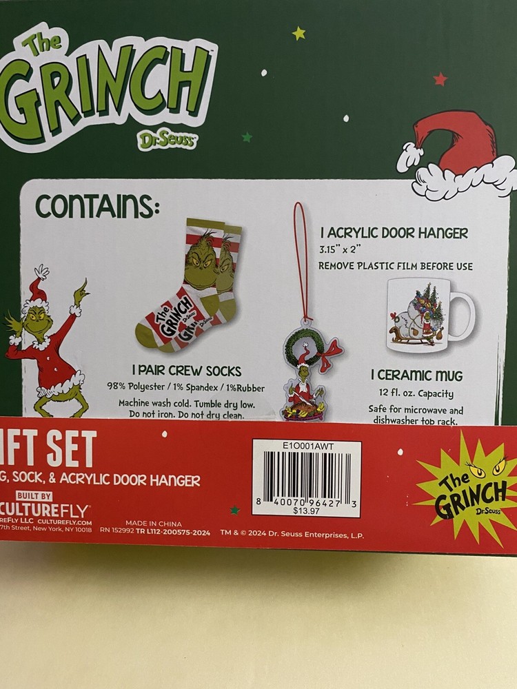 Personalization Instructions: N/A Antique: No Origin: Virginia Item Length: 12 in socks MPN: E1O001AWT Original/Licensed Reproduction: Licensed Reproduction Year Manufactured: 2024 Personalize: No Collection: Dr. Seuss Subject: The Grinch Color: green yellow and red Brand: CULTUREFLY Material: Acrylic Set Includes: Mug. Crew Socks, Acrylic Door Hanger Shape: Mug, socks, hanger Department: Adult Character: Grinch Type: THe Grinch Dr Seuss gift set UPC: 840070964273 Franchise: Culturefly Country/Region of Manufacture: China gtin13: 840070964273 Size: Medium Theme: Holiday Item Height: 4 in mug Recipient: Family Time Period Manufactured: 2020-Now Vintage: No Production Technique: Ceramic Occasion: Christmas Number of Items: 3 Item Width: 3 in Features: Animated, GRINCH Age Level: 12-18 Years California Prop 65 Warning: N/A Pattern: All-Over Handmade: No