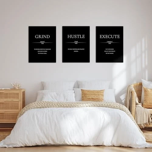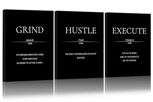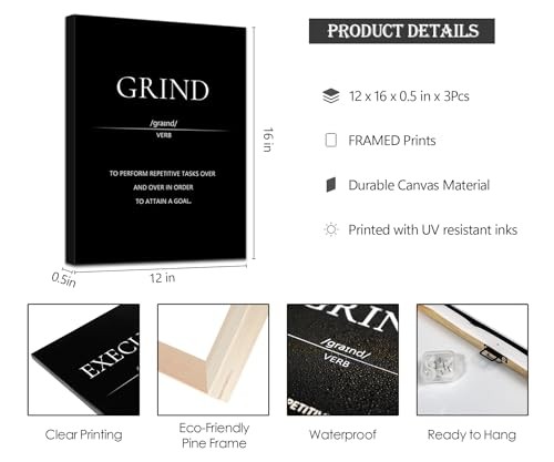 Return Policy Fast Delivery Trusted seller Motivational Wall Decor, Office Decor for Men, 12” x16” Framed Canvas Wall Art for Bedroom, Wall Picture for Living Room, Black and White Positive Paintings for Gym, Bathroom, Sports, Dorm (3 Piece) Product Description INSPIRATIONAL WALL ART - 3 motivational framed canvas picture in black and white: GRIND, HUSTLE, EXECUTE quotes, each piece dimension: 12 x 16 inch, the positive poster wallart made of high quality ink, waterproof and not easy to fade. self hook make it easy to hang. motivational sentences can give you inspiration and motivation, and encourage you when you need it. EASY TO HANG - Each panel of positive Canvas wall pictures have been Stretched, Framed and with hook mounted on the wooden bar, ready to hang out of box. inside non-trace nails, quickly to hang in your home, living room, office, gym, dorm, bedroom, any w you need it. HIGH QUALITY CANVAS PRINTING - Artwork wall painting is printed at high resolution with high quality ink, cnavas are smooth and elastic, thick and wrinkle-resistant, waterproof and fade-resistant. Definition printing on the surface makes the pattern more vivid and life like. perfect room decorations. BLACK AND WHITE ROOM DECOR - minimalist and artistic design qoute wallart perfect matching your room, beautify and enhance the hierarchy your bedroom, office, inspirational quote artwork for walls delight your day, make an empty wall no longer boring and monotonous. MEANINGFUL GIFT - The wall art set framed poster not only a perfect room decor, but a great gift for business friends, boy, men, women, workmate, entrepreneur, teacher, student, classmate, your son/daughter on Birthday, Christmas Day, graduation ceremony, anniversary, team building, Teacher's Day, Children's Day etc. Two Sizes for the Perfect Fit: 12×16 inches is great for desks and small spaces, while 16×24 inches makes a bold statement on larger walls. Looking for more motivation? Choose 16×24 inches for a stronger and more immersive impact! Shipping Returns Payment Shipping Shipping is FREE to all addresses other than APO/PO boxes in the lower 48 states. All our stock ships from US-based warehouses. Shipped via USPS or UPS (depending on location and package weight) Unless stated otherwise, all orders will ship within 24-72 hours of your payment being processed. Check our feedback to see the great reviews of FAST shipping we offer. Returns Seller does not accept returns Payment We currently accept payment via eBay managed payments only. Once payment is cleared, we will dispatch your shipment within 1-3 business days. Please refer to the "Shipping" tab for more information regarding shipping speed to your destination.