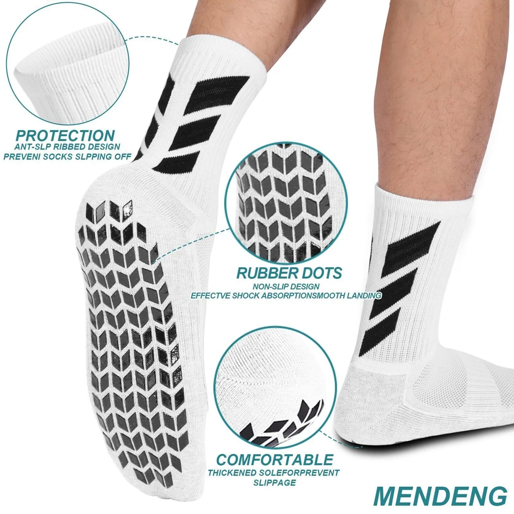 【MENDENG SOCKS】:Amazing 、Indoor antiskid、Training necessity、Sweat absorption and ventilation、Football accessories.MENDENG socks bring superexplosive power to your sports training. Novel exterior with non-slip design bring more praise to your indoor leisure. 10 out of 10! 【SOCKS SOCCER】:One size for men 6.5-11、women 8-12.5.py socks for women suit for pilates、yoga、house slippers、or any other traction sports. socks men suit for soccer、football、basketball、volleyball、hockey、baseball and so on.In addition,soccer socks can also be used as indoor per socks or hospital socks.Necessities of life and sports! 【MULTI-PURPOSE SOCCER SOCKS】:No youth can refuse a pair of anti-slip socks that can enhance explosive force and performance on the field or training ground.Non-slip socks are also the first choice for men or women who don't want to wear slippers at home.It is also a must-have for the elderly in the hospital.Best gift for family youth elderly Father's day Mother's day Thanksgiving Day! 【UNIQUE DESIGN SOCKS MEN】:Anti-slip ribbed design prevent socks slipping off.Fashion stripes enhanced arch support improved coverage.Thickened Cotton bottom provide comfort.Moisture-wicking material make training easier.Rubber dot no-slip design effective shock absorption and prevent blisters.Soccer socks youth bring unprecedented comfort to your exercise! 【MENDENG SOCCER SOCKS】:We have always been committed to bringing the best shopping experience to customers. The quality of our anti slip socks is checked at all levels. If you are dissatisfied with our non skid socks, please feel free to contact us. We will definitely solve your problem as soon as possible and adopt your suggestions into the next product upgrade. ITEM LIST: 1 set* (4 white socks)