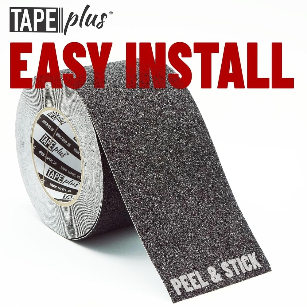 Grip Tape for Stairs - 4 in x 40 ft, Black - 80-Grit Waterproof Traction Tape for Indoor & Outdoor Steps - Tread & Traction Strips for Steps Enhanced Traction Safety: Tape Plus Grip Tape for Stairs features a robust 80-grit texture, ensuring superior stair traction for both indoor and outdoor stair treads. Its durable waterproof design offers reliable safety on ramps and wooden steps throughout the Versatile Surface Application: This anti slip tape is ideal for a variety of surfaces, including decks, boats, and skateboards. Whether for outdoor stair treads or grit strips for outdoor stairs, it provides a secure grip wherever applied Effortless Installation: Enjoy the simplicity of applying our stair traction strips by preparing the surface, measuring, cutting, and adhering the tape smoothly. Achieve optimal effectiveness with minimal effort for enhanced safety Durable All-Weather Design: Built to withstand various environmental conditions, this outdoor stair tread tape maintains its peel-resistant and durable properties. Rely on its ability to deliver consistent grip for outdoor stair treads and steps Commitment to Quality: With high-quality materials, Tape Plus ensures each roll of grit tape for ramps meets rigorous standards. Our dedication to excellence supports your needs for dependable stair traction strips and ramp grip solutions