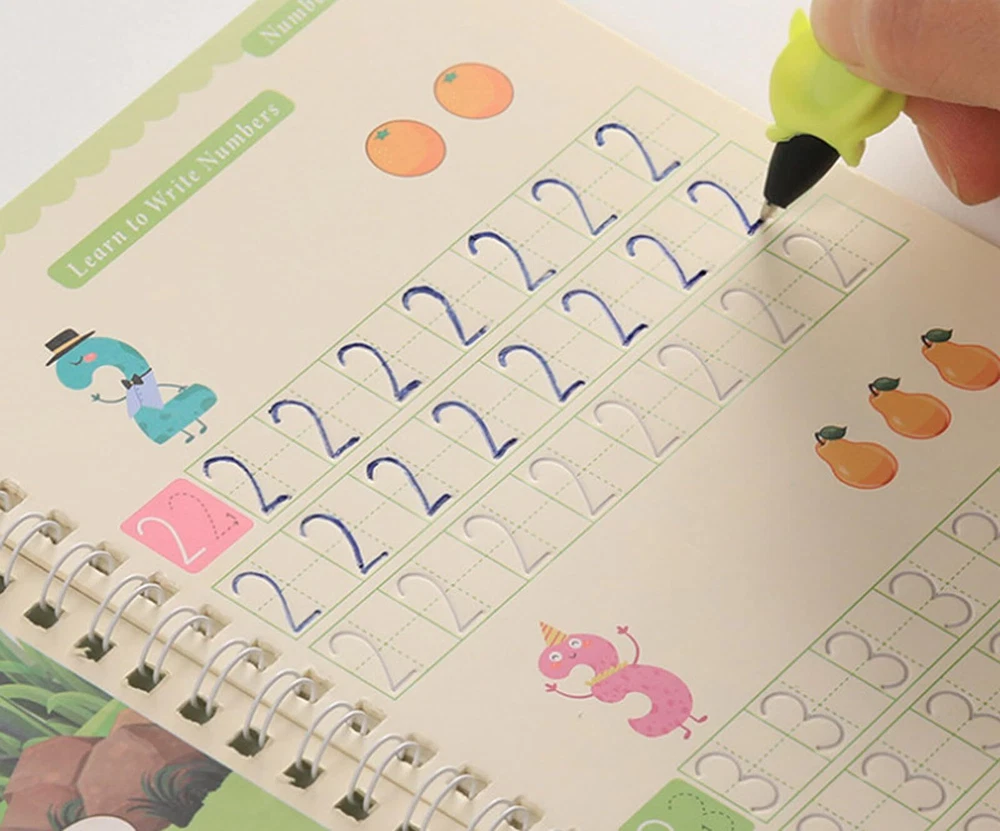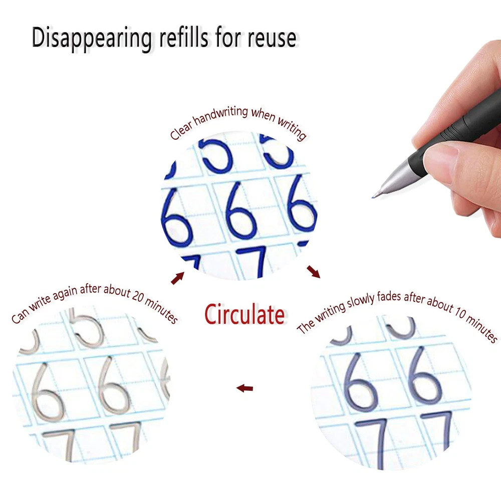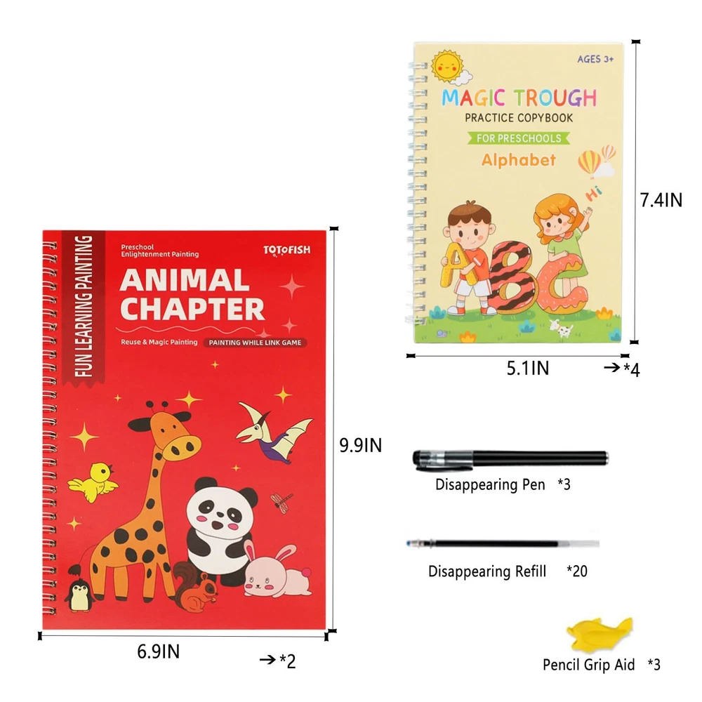 【Children's Character Practice Pads】: Includes 4 small books(drawing books, math books, alphabet books, number books)+2 Big Ben(animal books、fruit and vegetables books)+3 pens, 20 disappearing refills, 3 pencil grips 【Quill】:With the matching disappearing refill, the handwriting will disappear on its own after about 30 minutes, reusable lettering pads 【Recess design】:Three-dimensional grooves with the right depth to strengthen muscle memory. Beige color paper, relieve visual fatigue, not hurt your eyes. 【Product Advantages】:Suitable for children aged 3-8 years old: concentration training, hand-brain coordination, educational brain, pen control training 【Perfect Gift Choice】: The reusable calligraphy copybook set will be the perfect gift for ages 3-8 to give as a surprise at Children's Day, Christmas, birthday, New Year, Halloween.