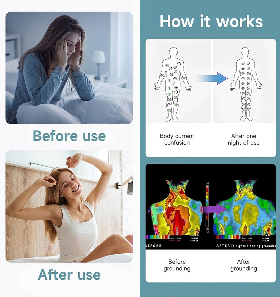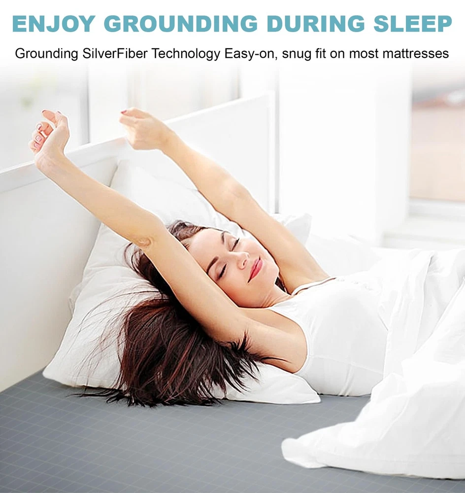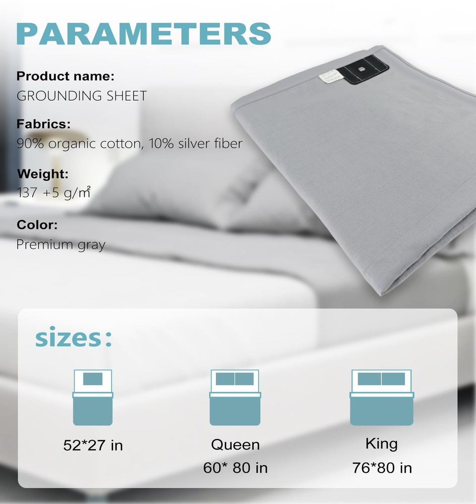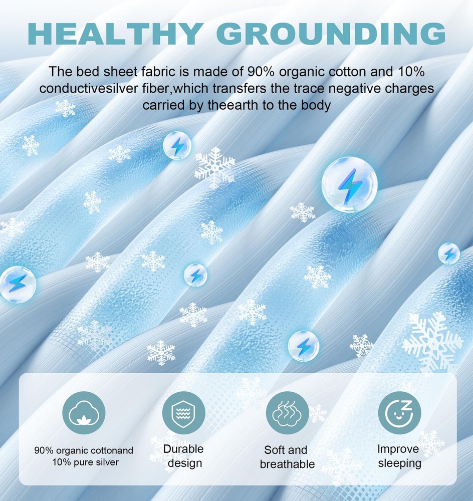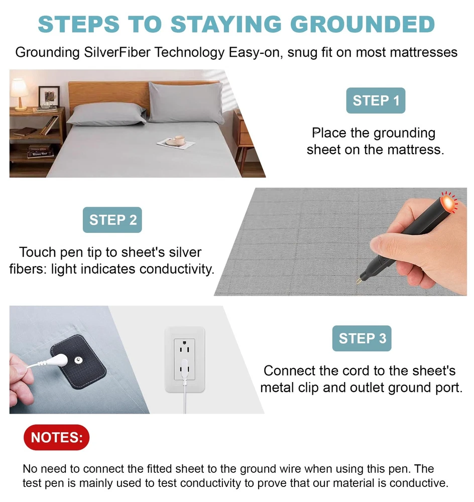 The resistance of the ground wire is 98 kilo-ohms, which is a safe resistance and will not affect the grounding effect. Package includes: 1 grounding sheet 15 feet grounding wire 1 manual Washing precautions: Detergent can be used, low temperature tumble dry, but not high temperature. Preparation: Make sure the multimeter is working properly and set it to resistance (Ω) mode. Safety Turn off the power to the circuit. Wear protective gear if necessary. Test: Connect the black probe to the COM terminal of the multimeter and the red probe to the VΩ terminal of the multimeter. Place one probe on the ground wire and the other on a known ground point. Read the resistance on the multimeter. Interpret the result: Expect a resistance reading of about 100 kΩ due to the built-in resistor. If the reading is significantly different from 100 kΩ, there may be a problem with the ground connection or the built-in resistor. 【High Quality Material】: Made with 10% pure silver fiber and 90% organic cotton, these sheets provide excellent conductivity while offering a soft, breathable surface. Enjoy the comfort of quality materials that support a refreshing sleep environment 【Universal Fit for All Bed Sizes】: These grounding sheets are designed to fit seamlessly across all standard mattress sizes, including Twin, Queen, and King. Whether at home or traveling, the perfect fit ensures you stay grounded comfortably every night 【Easy To Use】: This grounding bed sheet is equipped with a 15-foot grounding cord and a 100kΩ resistor to safely regulate current. Simply spread the grounding bed sheet flat on your bed, connect the grounding cord to the metal stud on the sheet, and plug the other end directly into the grounding port of a wall outlet. It can be used as a fitted sheet or mattress pad, ensuring you sleep soundly while staying securely connected to the Earth's energy 【Easy To Use】: This grounding bed sheet is equipped with a 15-foot grounding cord and a 100kΩ resistor to safely regulate current. Simply spread the grounding bed sheet flat on your bed, connect the grounding cord to the metal stud on the sheet, and plug the other end directly into the grounding port of a wall outlet. It can be used as a fitted sheet or mattress pad, ensuring you sleep soundly while staying securely connected to the Earth's energy 【Washing And Care Tips】: This grounding bed sheet is machine washable for easy maintenance. Clean it with warm water and mild detergent, then dry on low heat or air dry. Avoid bleach and fabric softeners to protect the silver fibers. Regular cleaning every 1-2 weeks ensures optimal conductivity and long-lasting performance 【Note】: The test pen is only used to test whether the product contains silver fibers and not to test whether the ground wire has been connected. Even without connecting the ground wire, the tail light of the test pen lights up, proving that our product contains conductive silver fibers!