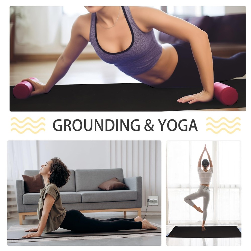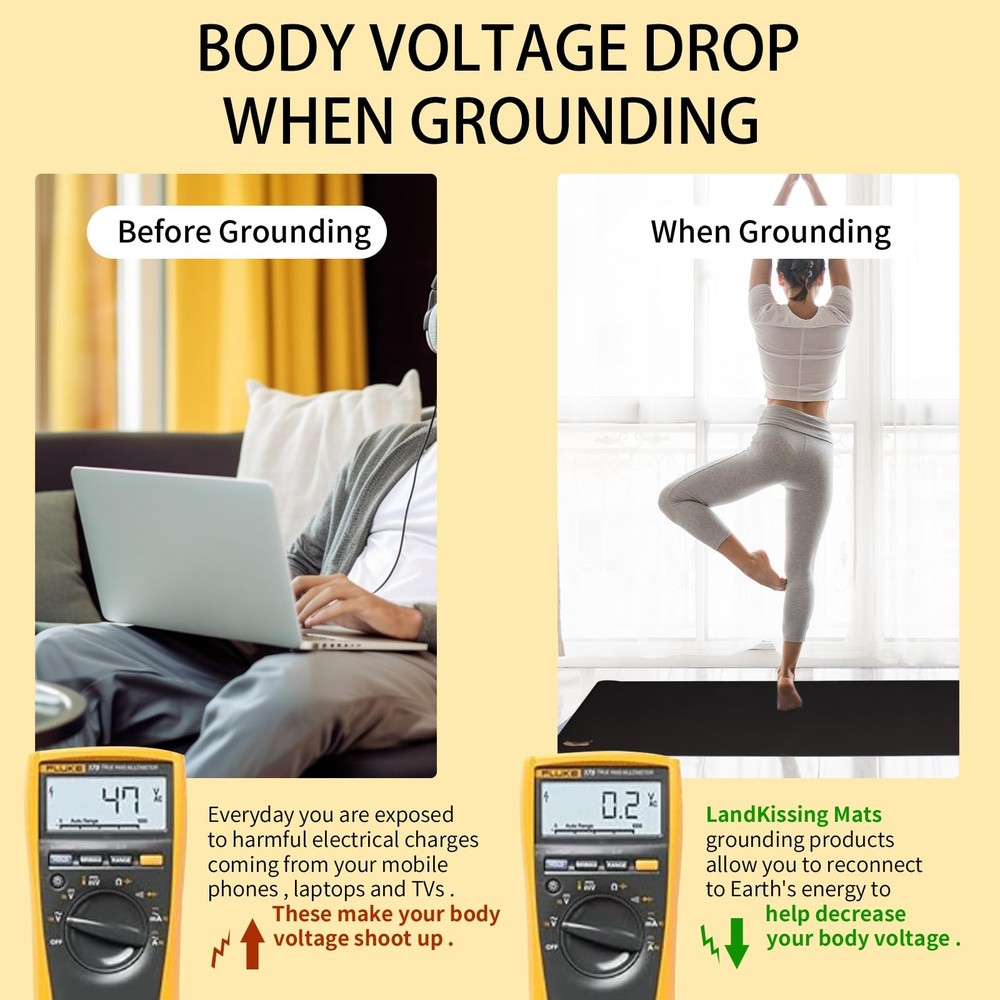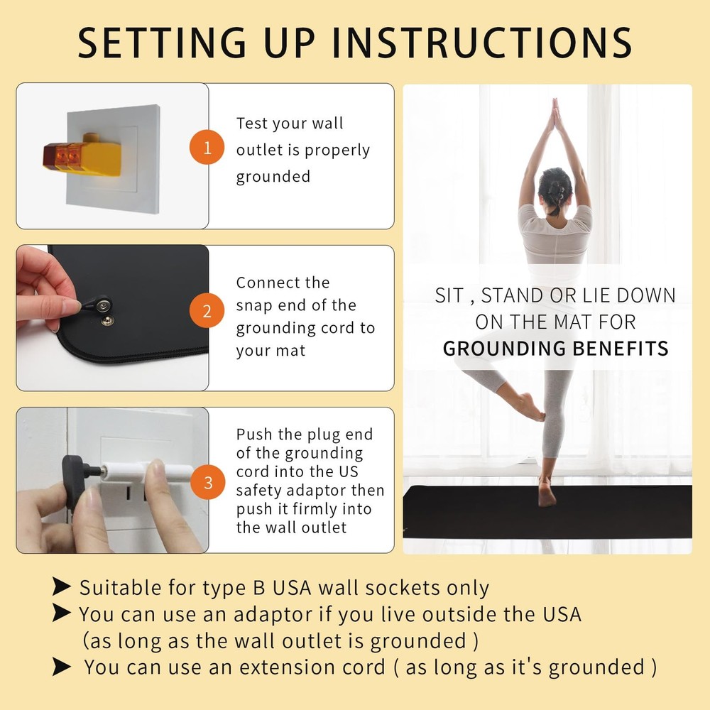 SIMPLE AND EFFICIENT SETUP - Save time by quickly connecting the grounding cord to our specially designed yoga-size grounding mat. Tailored for type B USA wall sockets. BUNDLE AND OPTIMIZE YOUR SAVINGS - Share the benefits of grounding with our bundled kit. Each kit includes 1 large yoga-size grounding mat, 1 grounding cord, 1 grounding splitter, 1 outlet testers and 1 bonus lava rock bracelets. CARBON-INFUSED FOR ENHANCED CONDUCTIVITY - Crafted from durable polyurethane infused with carbon, our grounding mats are highly conductive, breathable, and easy to clean. MAXIMUM BENEFITS WITH GENEROUS SIZE - The large yoga-size grounding mat allows you to experience the benefits of grounding during various activities and even while sleeping. RISK-FREE PURCHASE - Enjoy our lifetime manufacturer's warranty and 90-day return policy. We'll replace your grounding pad hassle-free if you're not satisfied. High-Quality Grounding Material Our Grounding Yoga Mat is crafted from durable, premium TPE foam and topped with soft, conductive vegan leather for ultimate comfort. It is free of PVC, latex, and odors, making it eco-friendly and safe for use. Measuring 71"x24" with a thickness of 1/4", the mat includes a 25-foot grounding cord for easy connection to a grounded electrical outlet. Harness the Power of Grounding Connect with the land's natural energy by standing barefoot or using our Grounding Yoga Mat. This direct contact allows the Earth's energy to flow into your body, penetrating cells and tissues to promote repair, regeneration, and overall well-being. Simple to Use Start by testing your wall outlet with the included Grounding Outlet Tester to ensure it is properly grounded. Then, connect your Grounding Yoga Mat to the Grounding Adapter Splitter and securely snap it onto the mat. (Compatible with Type B wall outlets only.) Once set up, simply touch the mat to begin grounding. COMPLETE KIT: 1 Grounding Yoga Mat (71"x24" each),1 Grouding Coil Cords with in-line current limiting 50k ohm resistors (25') , 1 USA Safety Adaptor Splitter, 1 Outlet Checker and 1 Bonus Lava Rock Grounding Bracelet How to Test Watch the instructional video located in the sidebar below the product photos for a step-by-step demonstration. The video guides you through testing for continuity and performing a body voltage test with the grounding mat, showcasing its effectiveness in grounding the body.