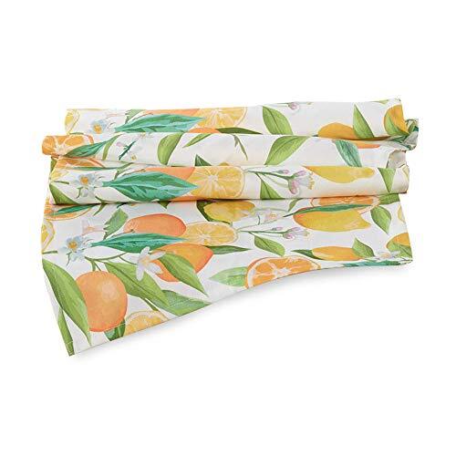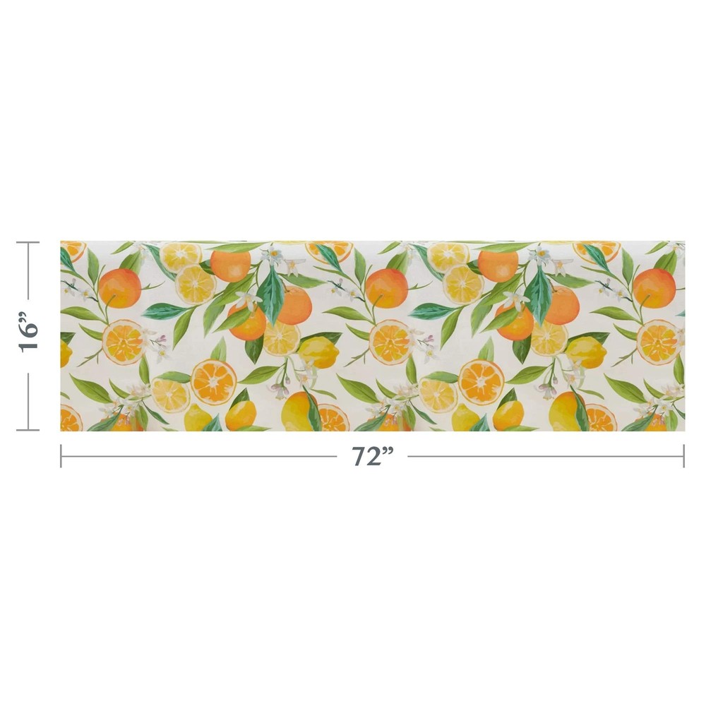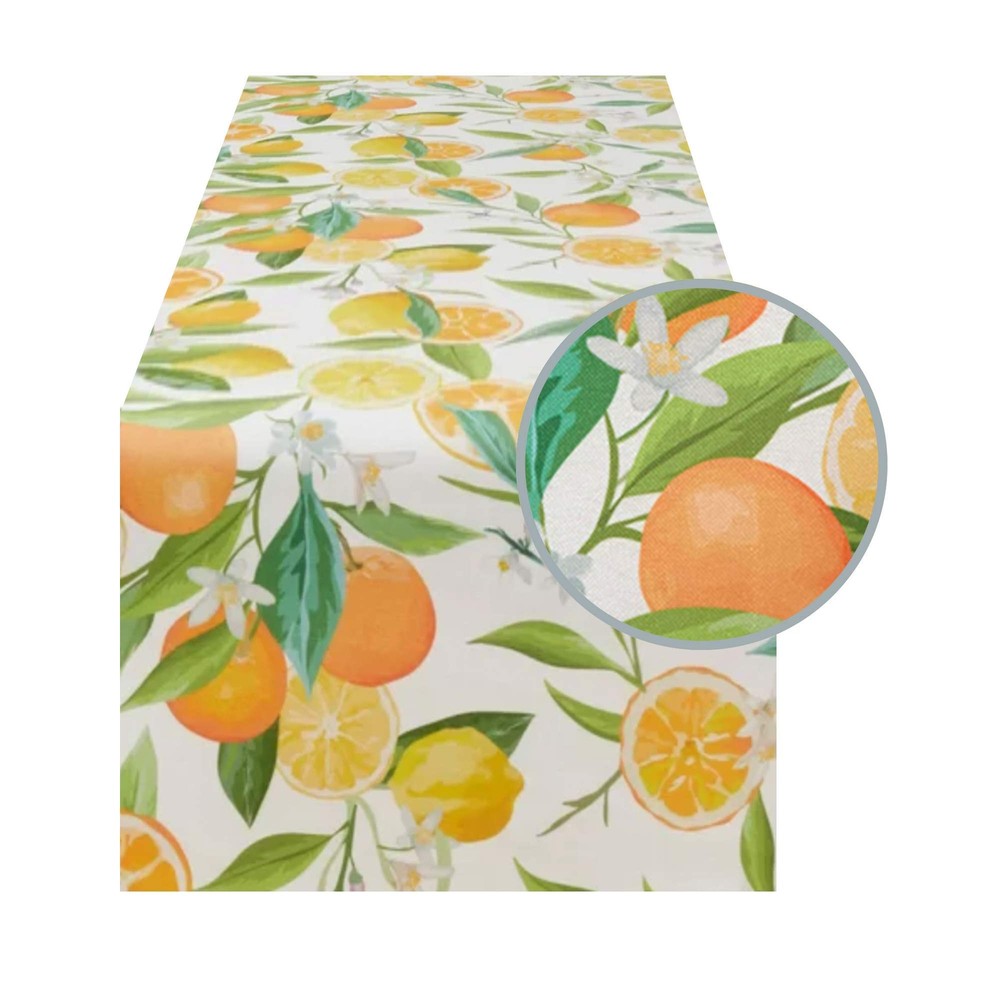 Transform your everyday dining experience with this beautiful, vibrant and downright fun Lemon & Orange Print Table Runner. While it is certain to brighten up your family meals, it's also a stylish touch for casual entertaining. Can be used for both indoor and outdoor dining. Size: 16" x 72" Oblong Runner is unlined Material: 100% polyester + Care: machine wash Vivid colors and print brings Summer vibes into your door. Fresh and fun fruit design adds a lively touch to the table.