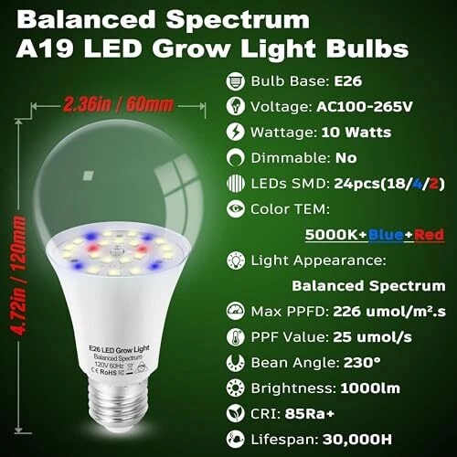 Return Policy Fast Delivery Trusted seller Grow Light Bulbs for Indoor Plants Full Spectrum,E26 A19 Grow LED Lamp Bulb 10W with Balanced Spectrum 5000K Red Blue for Seeds Greens Laboratory,School,Greenhouse, Indore Garden, Hydroponic,3Pack Product Description New Upgraded Plant Light Bulbs: Different from 4000k regular led bulbs on market,our E26 A19 full spectrum grow light bulb is really tested and certified by plant growth laboratories.We have developed a unique led chips ratio based on the effects of different color wavelengths on plant growth.Our plant growing light bulbs use 3 different color led chips: Red,Blue,5000k More Professional Plant Lights: Our E26 grow light bulbs offer: 400-499nm Blue for seed germination and seedling growth 500-599nm Yellow promote the growth of plant roots and early germination 600-699 Red promote the growth of plant roots and stems, help flowering and fruiting, prolong the flowering period, and increase production High Brightness Energy Saving: A19 LED plant grow light bulb is very bright 1000LM equivalent to 100w traditional light bulb while consumes only 10 watts, help saving your electricity bill Easy to Install: A19 LED grow light bulbs have standard medium E26 base as household light bulbs, can fit in most standard lamps Safe Wide Applications: A19 Balance full spectrum grow light can give plants a high output PPF of 23 micromoles lighting per second. Produce a exhaustive growing atmosp for tomatoes, cucumbers, peppers, leafy greens, herbs,and other indoor plants at all growth stages.Perfect fit for your Greenhouse, Indoor Garden, Hydroponic Room,Home Planting,Laboratory, School Notice: Please note that different plants may have different light requirements, so when choosing a plant light, you need to choose the appropriate color wavelength based on the lighting needs of the specific plant. At the same time, the use of plant lights also needs to be combined with other environmental factors, such as temperature, humidity and nutrition, to achieve the best growth effect Shipping Returns Payment Shipping Shipping is FREE to all addresses other than APO/PO boxes in the lower 48 states. All our stock ships from US-based warehouses. Shipped via USPS or UPS (depending on location and package weight) Unless stated otherwise, all orders will ship within 24-72 hours of your payment being processed. Check our feedback to see the great reviews of FAST shipping we offer. Returns Seller does not accept returns Payment We currently accept payment via eBay managed payments only. Once payment is cleared, we will dispatch your shipment within 1-3 business days. Please refer to the "Shipping" tab for more information regarding shipping speed to your destination.