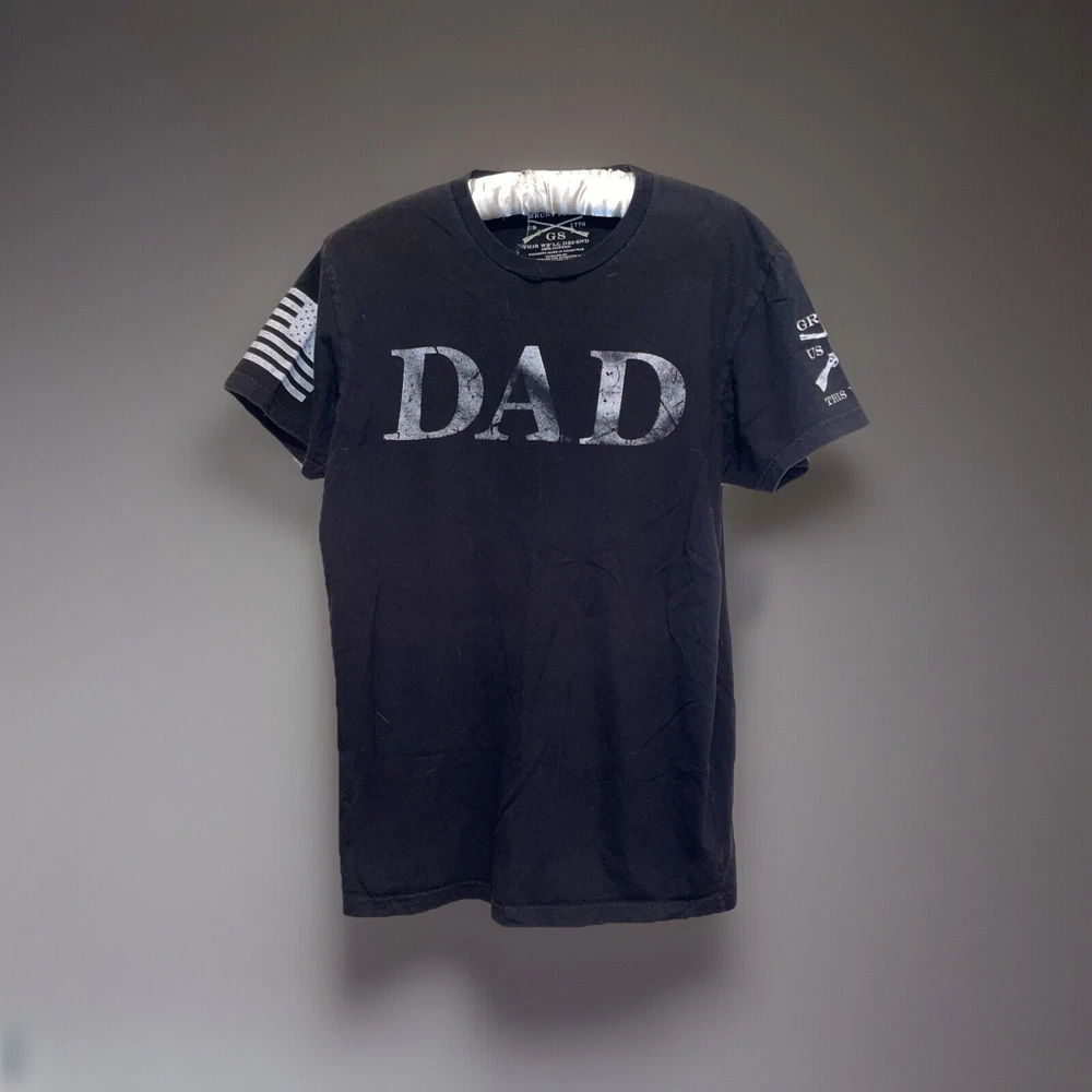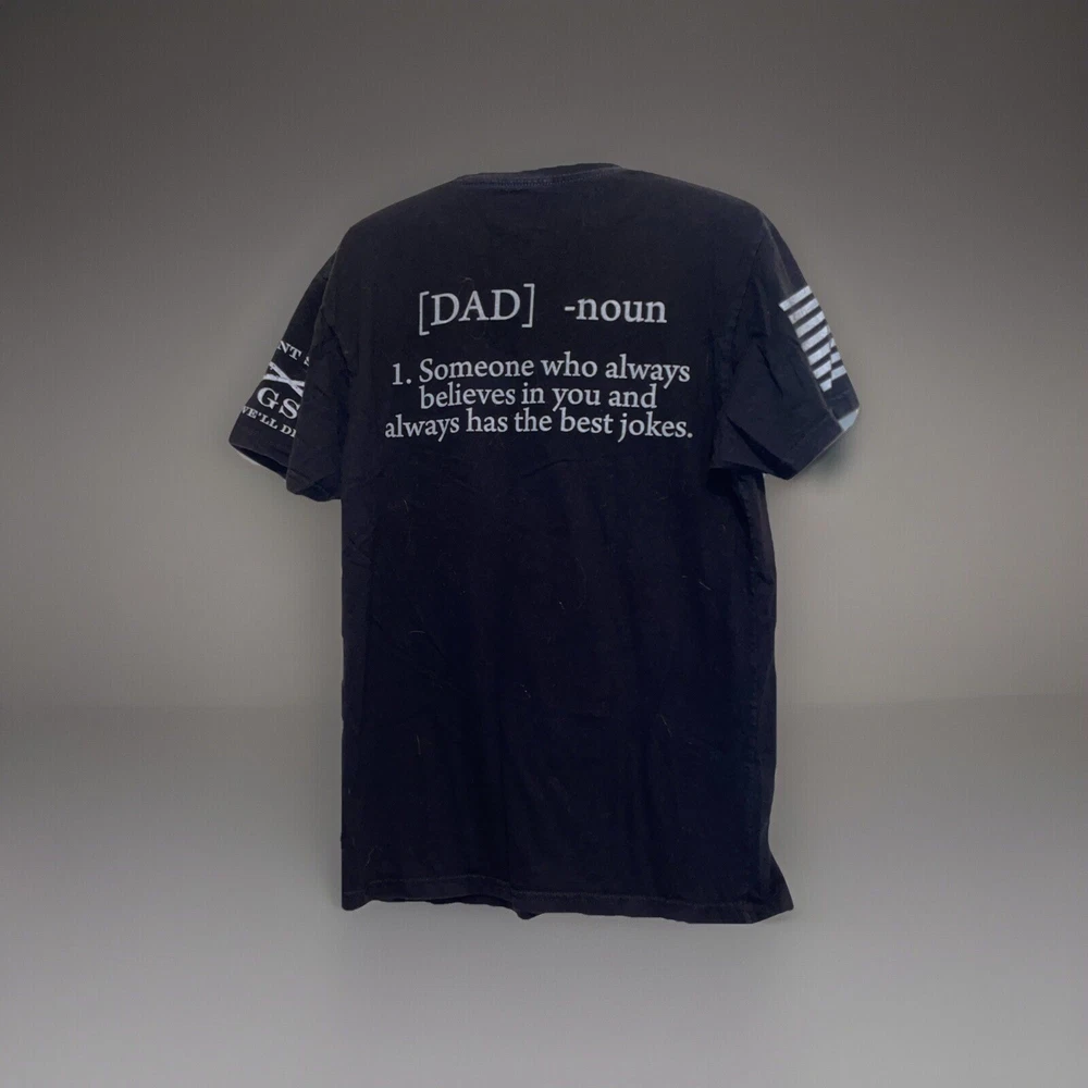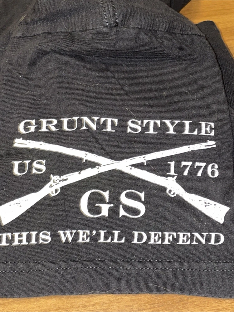 PLEASE NOTE: The graphics on these shirts are faded. Don’t know if it is intentional or not. See photos, I am picturing the most faded of the three shirts I have. Show off your patriotic side with this Grunt Style Dad Definition Patriot Shirt. The shirt features a crew neckline and short sleeves, making it perfect for all seasons. The black cotton material is machine washable for easy care, and the shirt is designed with a solid pattern and the Grunt Style logo as an accent. This shirt is perfect for any America-loving gun enthusiast and is part of the Boomstick product line. It is a regular fit size medium, and the shirt was manufactured in Nicaragua between 2010 and 2019. Don't miss out on the chance to add this patriotic shirt to your wardrobe!