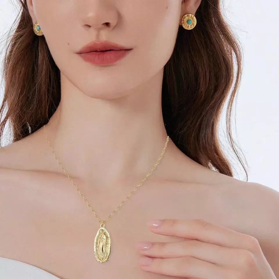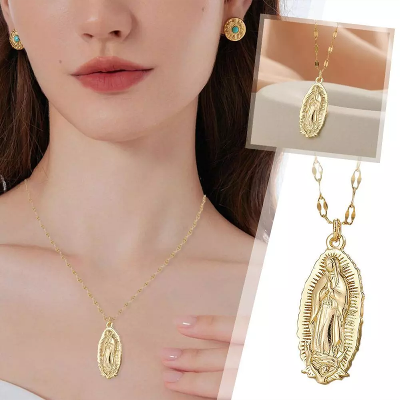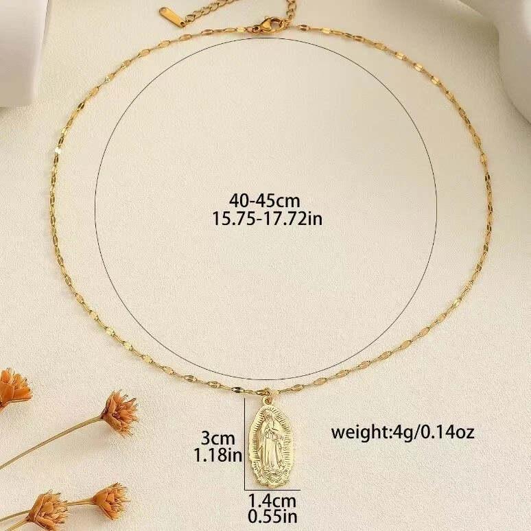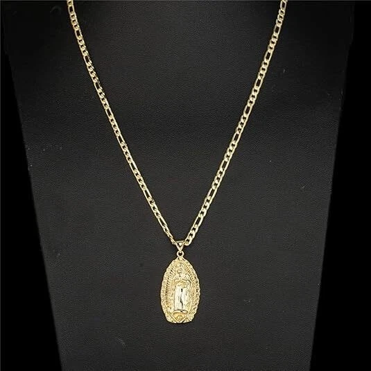 Guadalupe Motif 14K Gold-Plated Charm Pendant with 18" Figaro Chain Choker Religious Significance Symbol of Faith :The Virgin Mary necklace stands as a profound emblem of Catholic and Christian belief, embodying reverence for the Virgin Mary and serving as a tangible expression of prayer. Protection & Blessings :Many believers hold that wearing this necklace invites divine protection and blessings, fostering inner peace and a sense of security. Exquisite Design Meticulous Craftsmanship :Crafted from high-quality copper with electroplated finish, the necklace features intricate detailing, showcasing fine artistry in every curve and contour. Versatile Wear Occasions Daily Elegance :With a minimalist design, it suits everyday wear, blending fashion and dignity seamlessly. Sacred Moments :Ideal for significant religious or life ceremonies—weddings, baptisms, confirmations—where it adds spiritual meaning to the occasion. Thoughtful Gift Options Meaningful Present :An ideal gift for family and friends, especially those with religious faith, it carries profound symbolic value. Commemorative Token :Perfect for marking milestones like birthdays, anniversaries, or graduations, serving as a lasting keepsake with spiritual significance. Item Specifications Product Name :Virgin Mary Necklace Weight :50G Material :Copper with electroplated coating Target Audience :General Circumference :40-45cm Pendant Size :3cm × 1.4cm