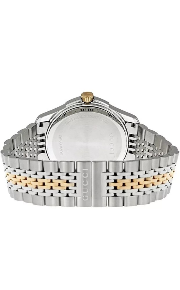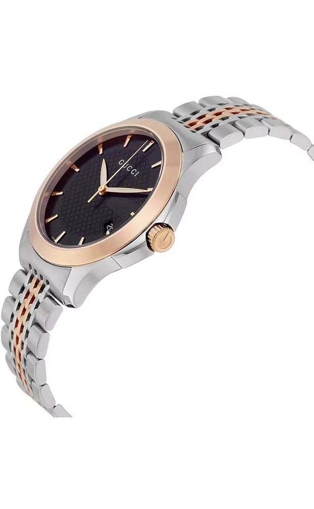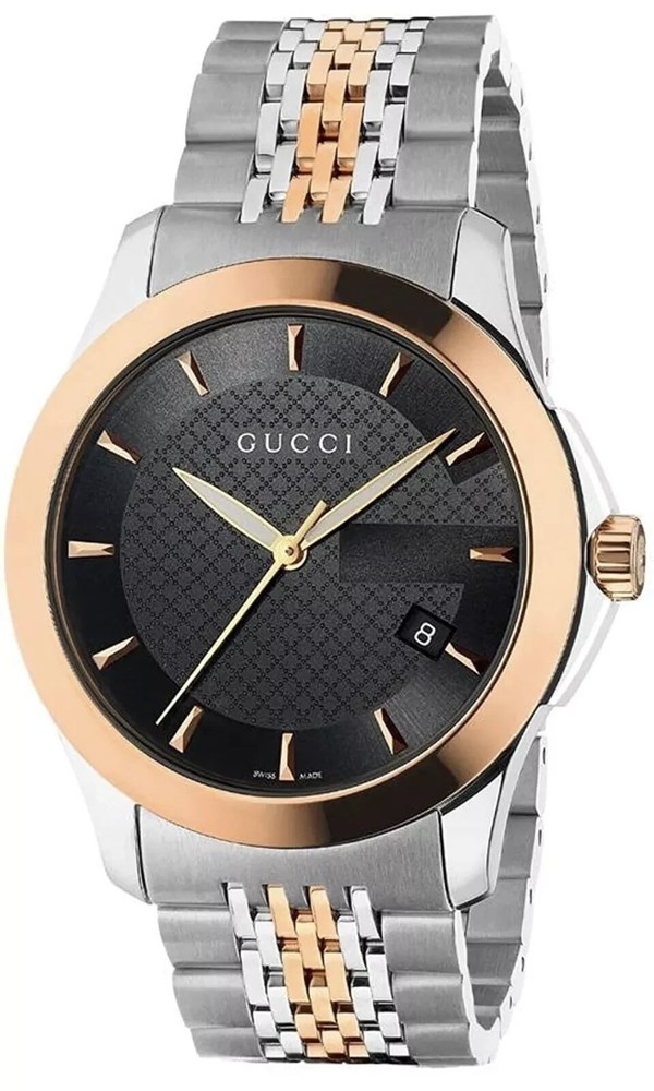 Gucci Men's Gucci Timeless Steel and Pink PVD Black Dial Watch. Pre-Owned Purchased in December 1st 2012 at Macy's Product Details Material Stainless Steel / Gold / Sapphire / Crystal Description Stainless steel case. Two-tone silver and red gold PVD stainless steel link bracelet. Fixed red gold PVD bezel. Black dial with luminous red gold-tone hands. Date. Swiss quartz movement. Scratch resistant anti-reflective sapphire crystal. Case 33 mm. Hidden folding deployment clasp. Water resistant to 50 meters. I am taking it to a jeweler to make sure all is in great order.