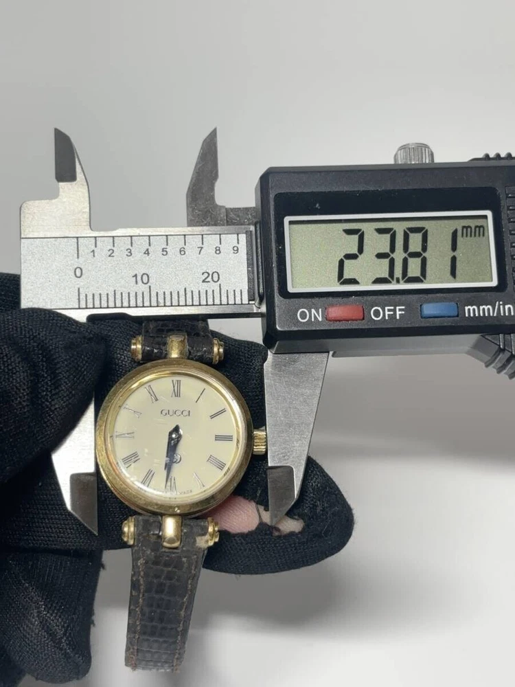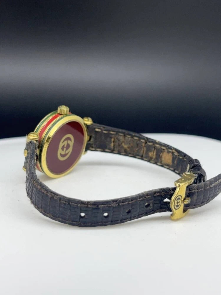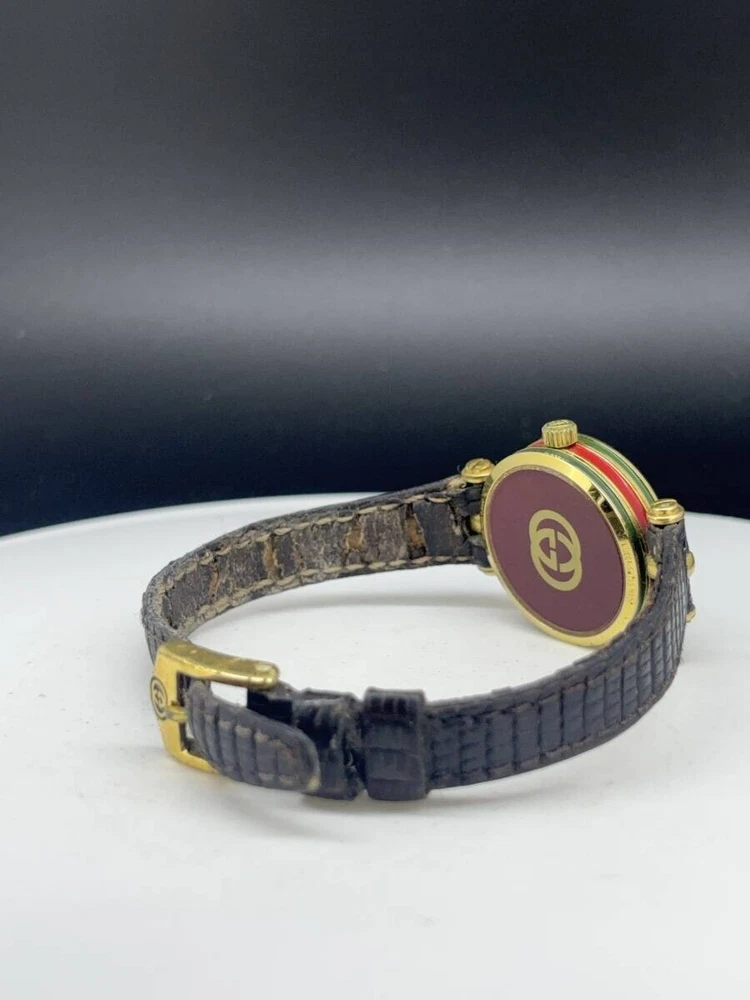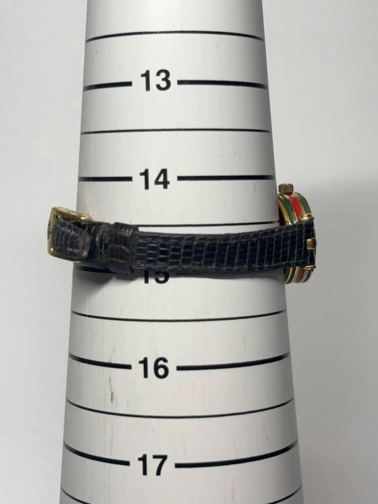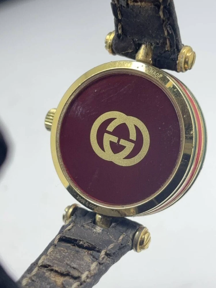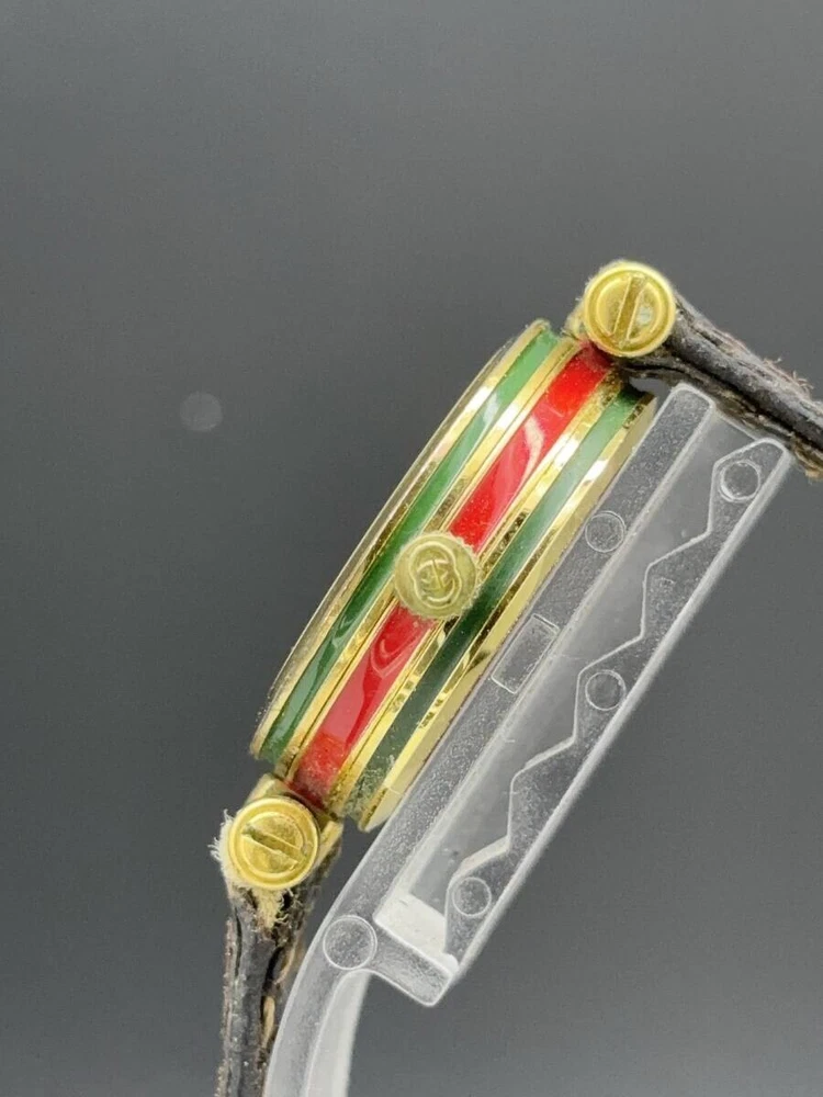 Case Size: about 21 mm Features: 12-Hour Dial Type: Wristwatch Vintage: Yes Case Material: Gold Plated Case Color: Gold, Green, Red Movement: Quartz Indices: N/A UPC: Does not apply Model: Gucci 2000L Dial Color: Cream With Original Box/Packaging: No Customized: No Bezel Color: Gold Year Manufactured: 1990-1999 Display: Analog Style: Casual, Antique Band Material: Leather Department: Women Reference Number: 2000L Brand: Gucci With Papers: No Modified Item: No Water Resistance: Not Water Resistant Country/Region of Manufacture: Japan Seller Notes: “Please see photos and description.” gtin13: Does not apply Watch Shape: Round Band Color: Brown
