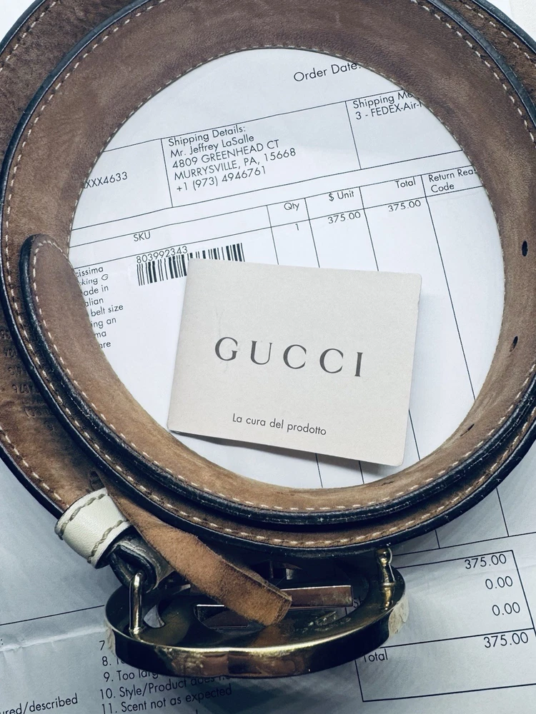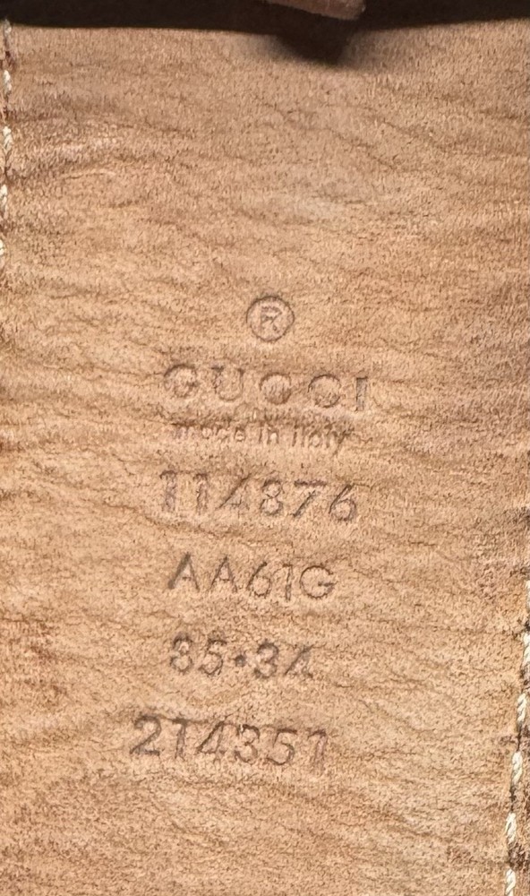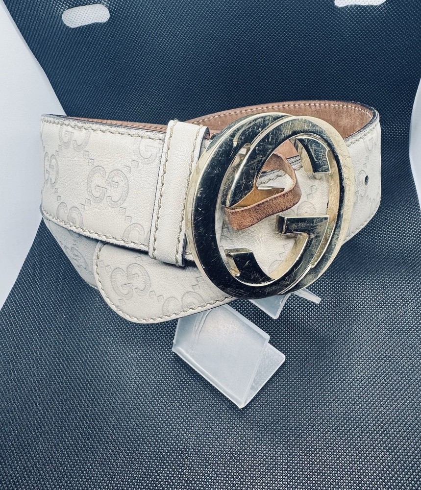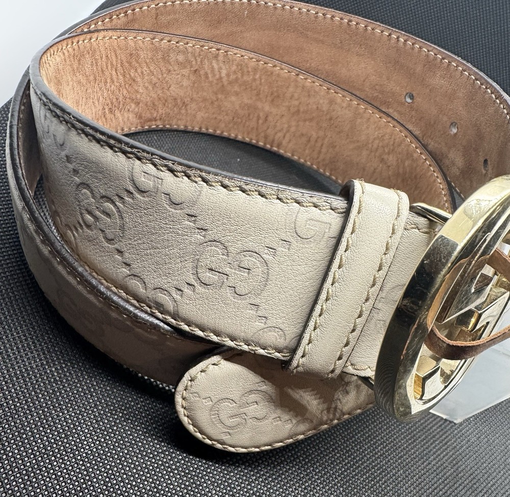 The Gucci Beige Guccissima Leather Interlocking G Buckle Belt in size 85 / 34 is a stylish and luxurious accessory for women. Made from high-quality leather with a brass hardware material, this fashion belt features the iconic Gucci logo and interlocking G buckle accent. Designed in Italy, this designer belt is perfect for adding a touch of sophistication to any outfit, making it a must-have accessory for those who appreciate designer fashion. The belt is Pre-owned. Scratching on the hardware and minor stain on the interior leather of the belt. The belt does come with box, bag, and an order number from the original owner. The box and bag contain stains. Beige color. Gold tone buckle.