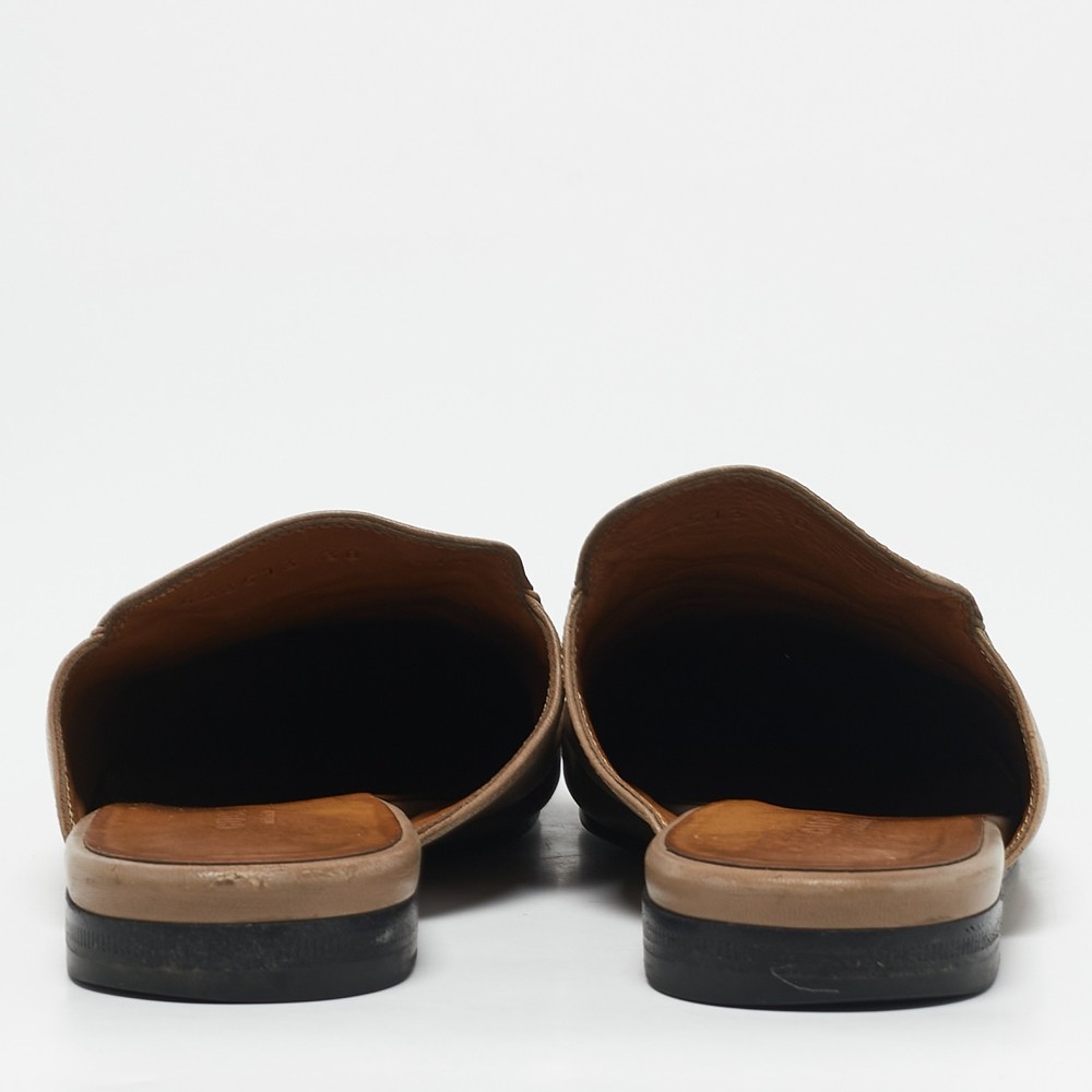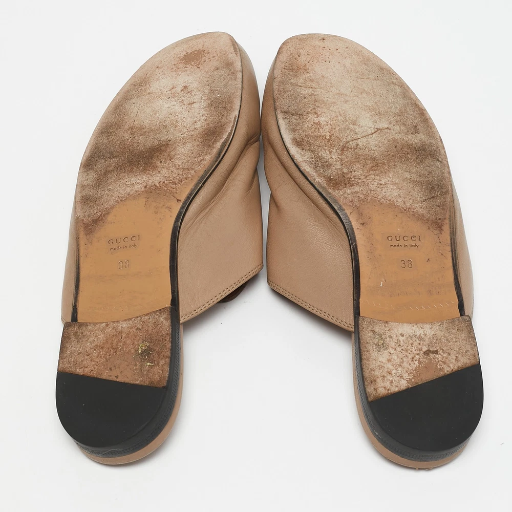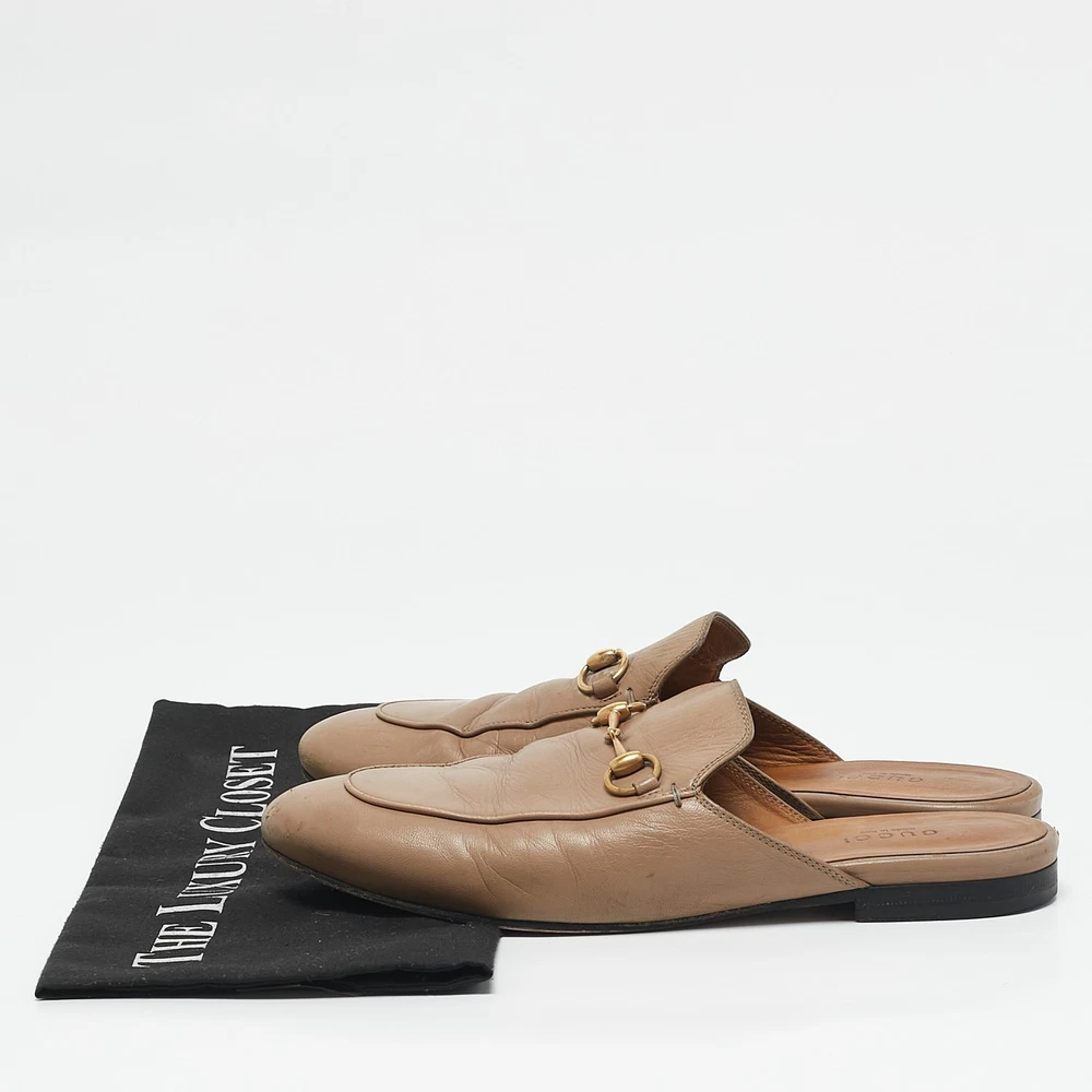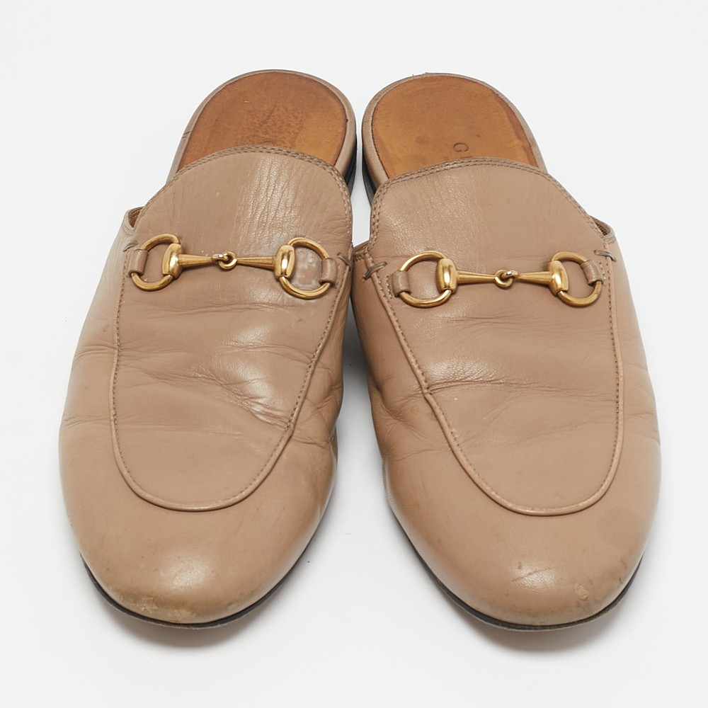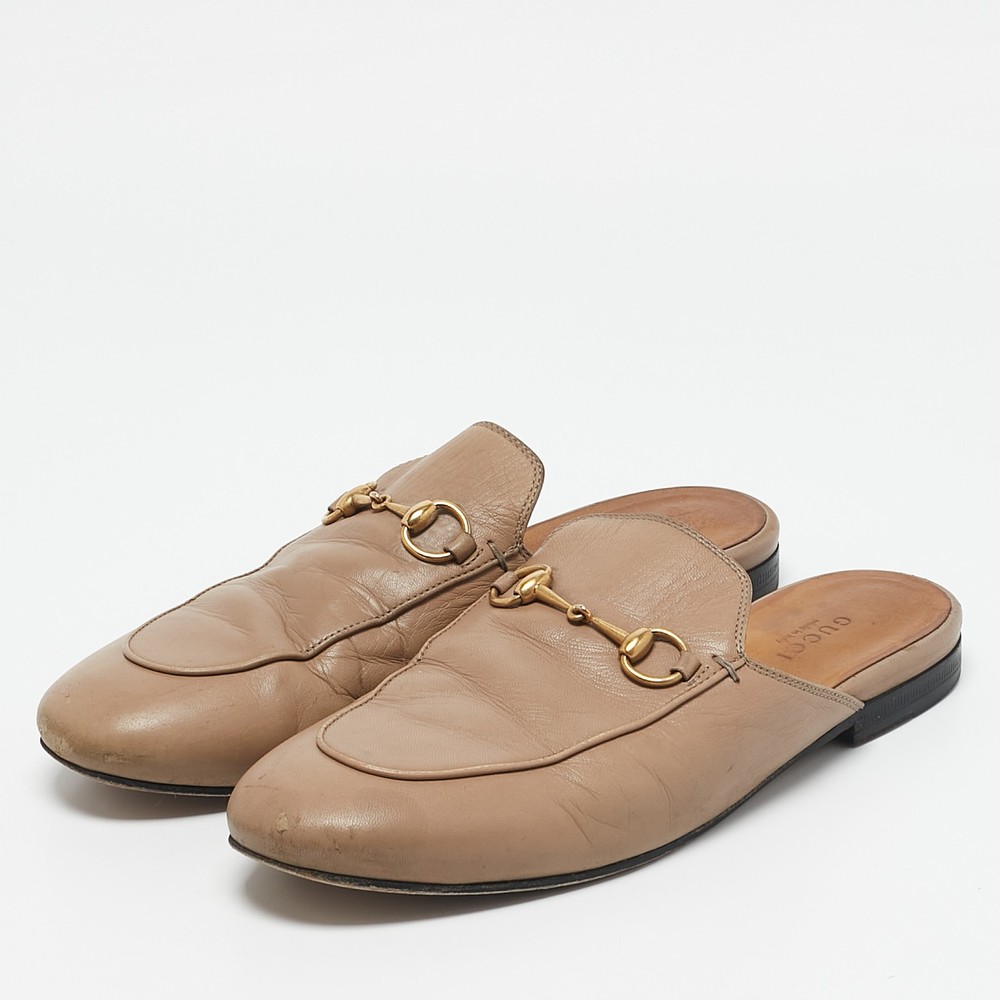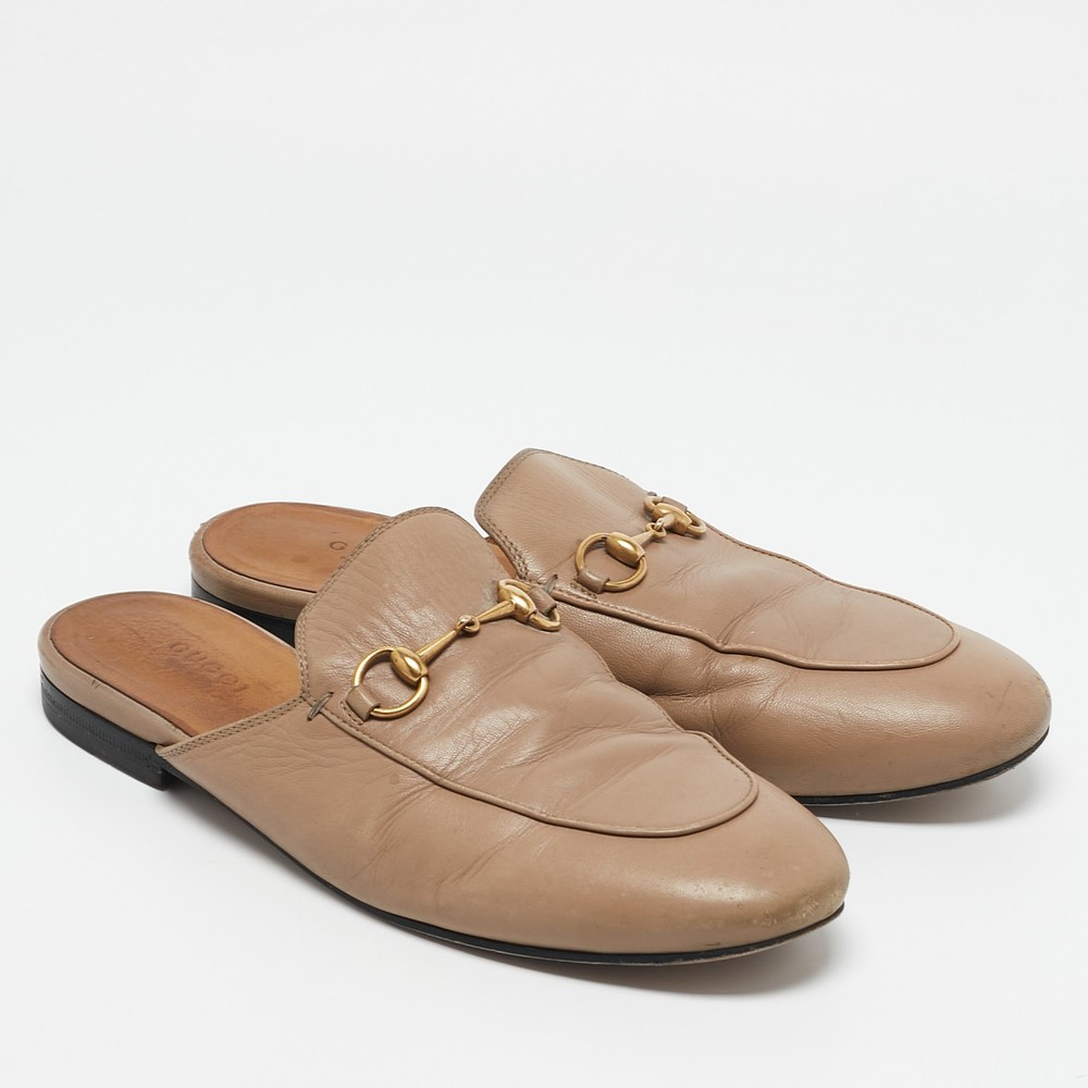These Gucci Princetown mules are a fresh update on the perennially chic Gucci loafers. They are enhanced by the signature Horsebit hardware details that have defined the Gucci collection since the very beginning. Featuring a beige leather body, these Princetown mules are the epitome of modern Italian sophistication.Certified by The Luxury Closet - This item has gone through a detailed authentication process overseen by our experts. We offer a lifetime guarantee of authenticity on all our items. Import duties, taxes and charges are not included in the item price. These charges are the buyers responsibility. Please check with your country’s customs office to determine what these additional cost will be prior to buying. Our eBay Store About Us Contact Us Add to Favorite Sellers Gucci Beige Leather Horsebit Princetown Flat Mules Size 38 $434.5 These Gucci Princetown mules are a fresh update on the perennially chic Gucci loafers. They are enhanced by the signature Horsebit hardware details that have defined the Gucci collection since the very beginning. Featuring a beige leather body, these Princetown mules are the epitome of modern Italian sophistication. Product Details Brand Color Beige Dimensions Material Leather Size 38 Outsole Width Outsole Length Heel Height Includes Certified by The Luxury Closet This item has gone through a detailed authentication process overseen by our experts. We offer a lifetime guarantee of authenticity on all our items. How We Check The in-house team of experts at The Luxury Closet is highly trained to verify the authenticity and the condition of the luxury products. They ensure that only 100% authentic items are put on sale.The evaluation process is unique with its own mix of assessment criteria and differs according to the category. Each item is evaluated based on the following combination of hallmarks, hardware, stitching, symmetry, material, craftsmanship, stamping, codes, hologram stickers, and packaging. Our authenticators also check if the items have been modified or amended (e.g., aftermarket diamonds, replaced batteries, repaired bags, etc.) International Buyers Import duties, taxes and charges are not included in the item price. These charges are the buyers responsibility. Please check with your country’s customs office to determine what these additional cost will be prior to buying.