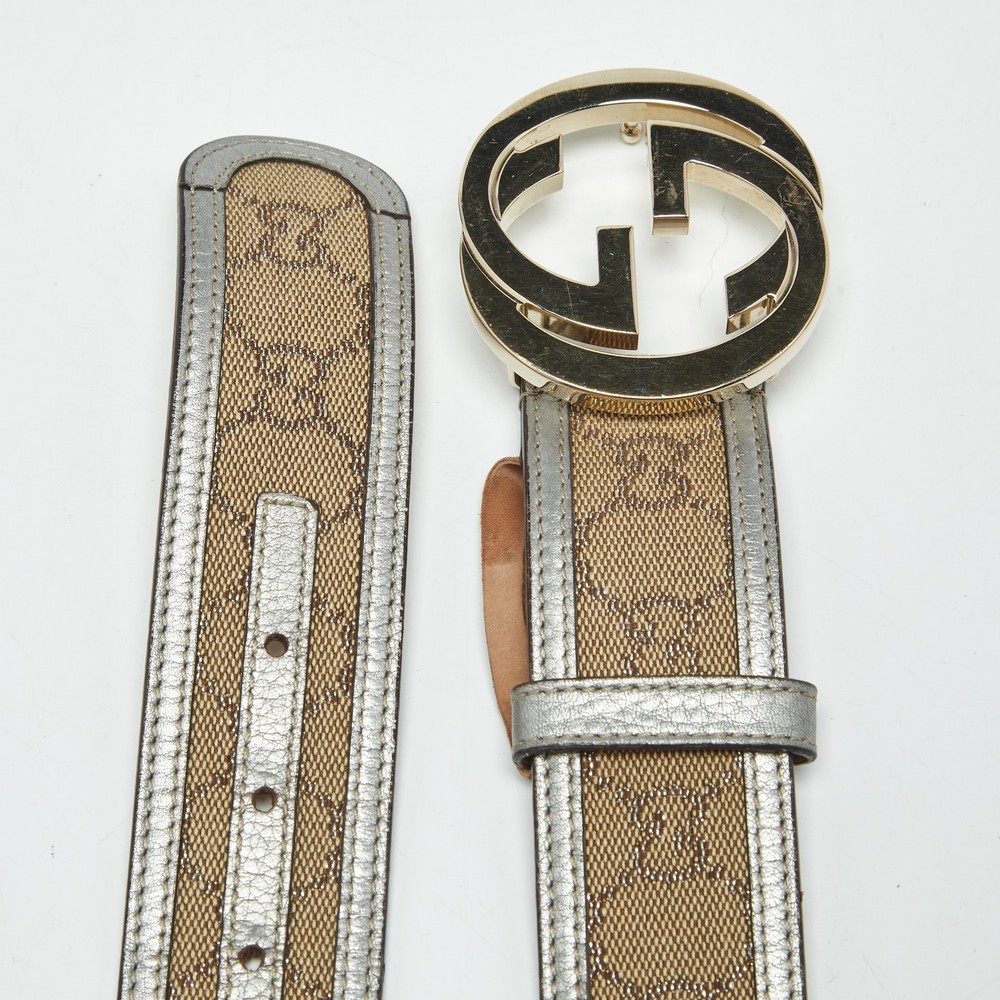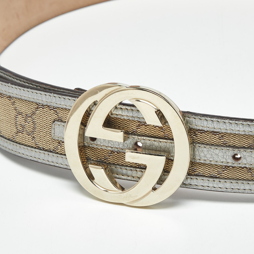 Light up your belt collection with this belt from Gucci. Made from GG canvas and leather trims, it features the iconic interlocking G buckle in metal, accompanied by a single loop. This belt will look ideal with casuals.Certified by The Luxury Closet - This item has gone through a detailed authentication process overseen by our experts. We offer a lifetime guarantee of authenticity on all our items. Import duties, taxes and charges are not included in the item price. These charges are the buyers responsibility. Please check with your country’s customs office to determine what these additional cost will be prior to buying. Our eBay Store About Us Contact Us Add to Favorite Sellers Gucci Beige/Silver GG Canvas and Leather Interlocking G Buckle Belt 90CM $407 Light up your belt collection with this belt from Gucci. Made from GG canvas and leather trims, it features the iconic interlocking G buckle in metal, accompanied by a single loop. This belt will look ideal with casuals. Product Details Brand Color Beige Dimensions Material Canvas, Leather Size 90CM Outsole Width Outsole Length Heel Height Includes Certified by The Luxury Closet This item has gone through a detailed authentication process overseen by our experts. We offer a lifetime guarantee of authenticity on all our items. How We Check The in-house team of experts at The Luxury Closet is highly trained to verify the authenticity and the condition of the luxury products. They ensure that only 100% authentic items are put on sale.The evaluation process is unique with its own mix of assessment criteria and differs according to the category. Each item is evaluated based on the following combination of hallmarks, hardware, stitching, symmetry, material, craftsmanship, stamping, codes, hologram stickers, and packaging. Our authenticators also check if the items have been modified or amended (e.g., aftermarket diamonds, replaced batteries, repaired bags, etc.) International Buyers Import duties, taxes and charges are not included in the item price. These charges are the buyers responsibility. Please check with your country’s customs office to determine what these additional cost will be prior to buying.