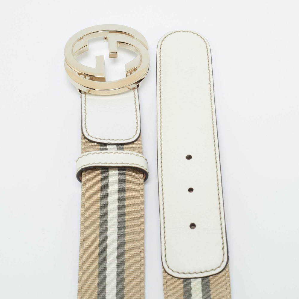 Gucci BeigeWhite Web Canvas and Leather Interlocking G Buckle Belt 90CM