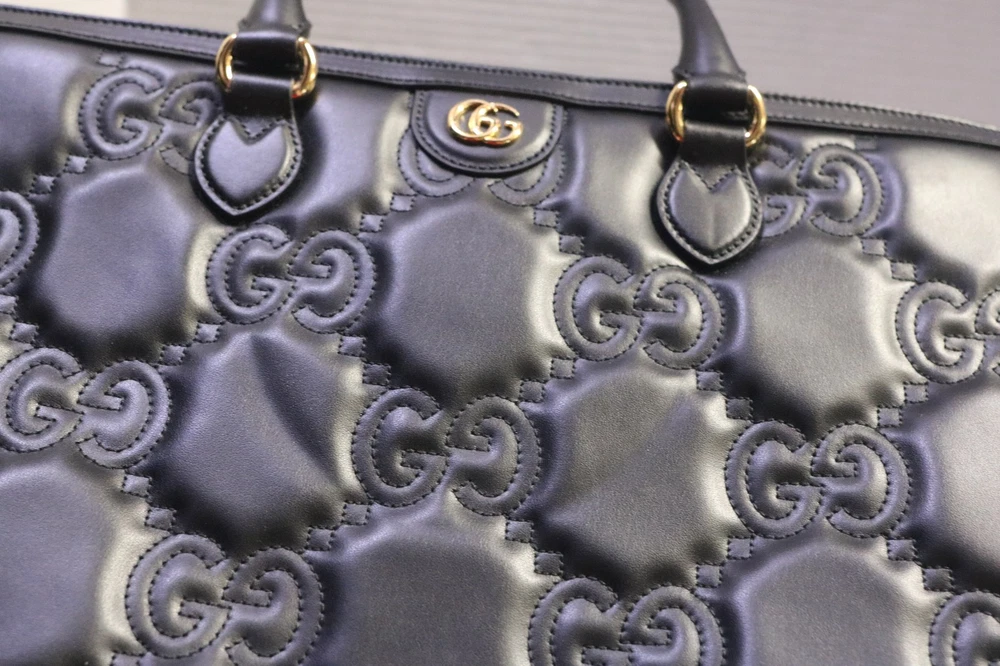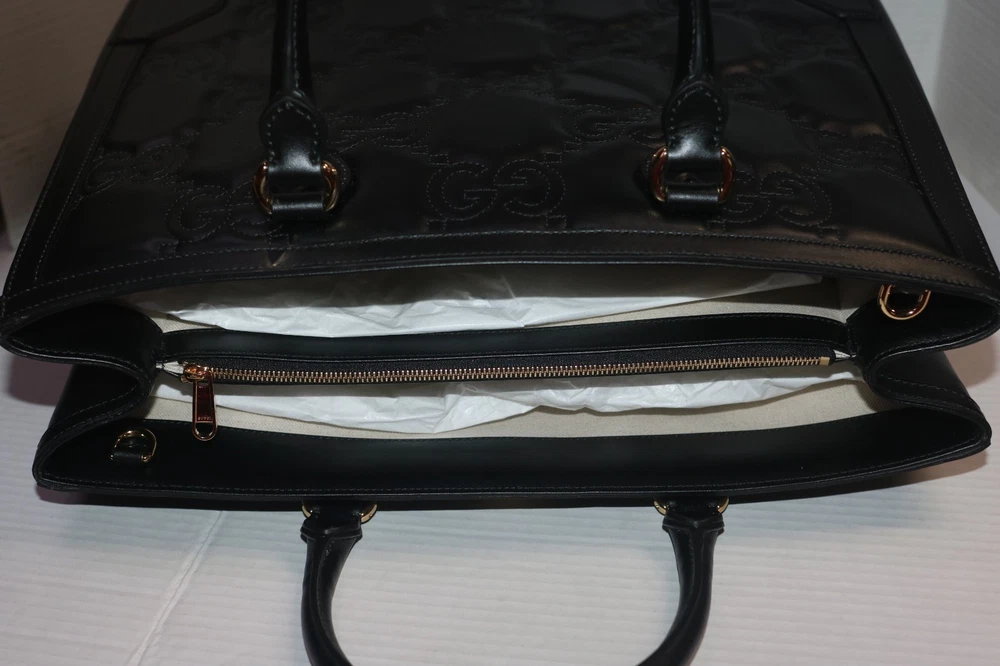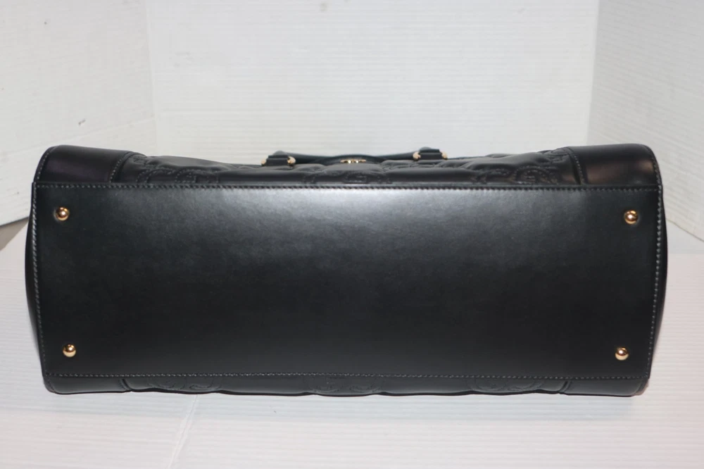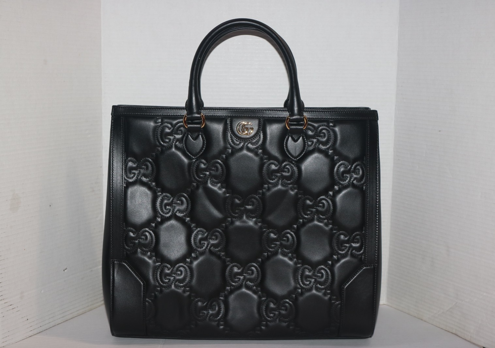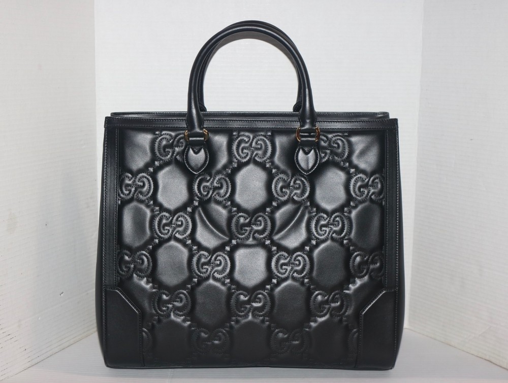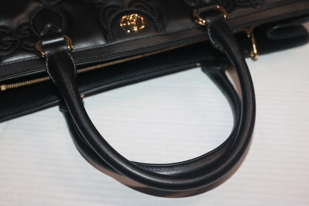 Gucci Black GG Stitched Leather Matelassè Top Handle Tote Bag Designer: Gucci Material: Black stitched leather Origin: Italy Date/Authenticity Code: 735061 Measurements: 16" L x 7" W x 13" H Interior Pockets: Two compartments, one middle zip pocket, one side zip pocket and two flat pockets Handles: Double leather rolled handles, detachable leather shoulder strap and detachable canvas shoulder strap Handle Drop: 4.5" Closure/Opening: Open top Interior Lining: Fine textile lining Hardware: Goldtone