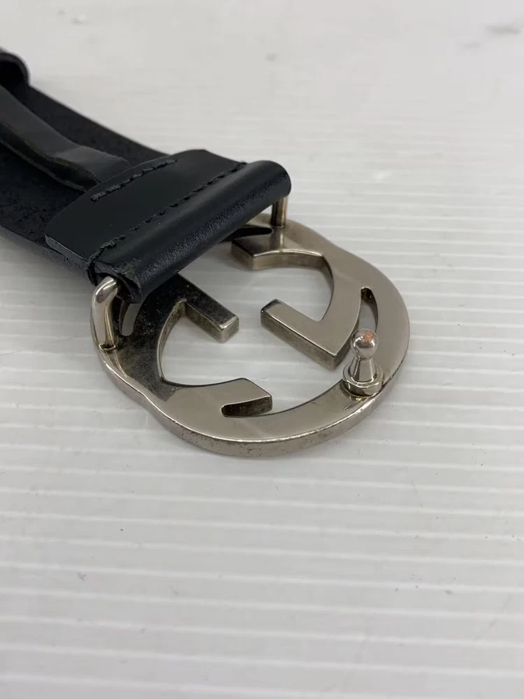 $ 165.47GUCCI Mens Black Leather Belt with Silver Buckle 414516