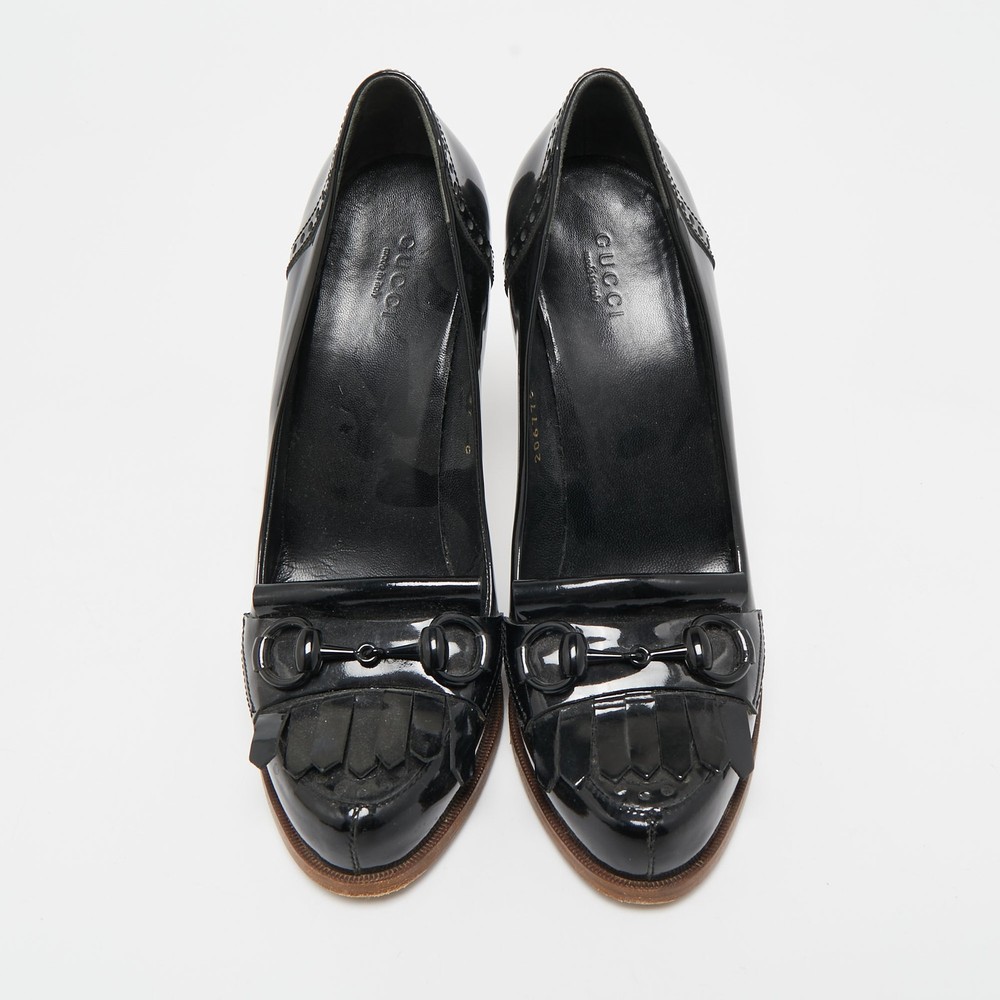 Make a statement with these designer pumps for women. Impeccably crafted, these chic heels offer both fashion and comfort, elevating your look with each graceful step.Certified by The Luxury Closet - This item has gone through a detailed authentication process overseen by our experts. We offer a lifetime guarantee of authenticity on all our items. Import duties, taxes and charges are not included in the item price. These charges are the buyers responsibility. Please check with your country’s customs office to determine what these additional cost will be prior to buying. Our eBay Store About Us Contact Us Add to Favorite Sellers Gucci Black Patent Leather Horsebit Fringe Loafer Pumps Size 37 $145.2 Make a statement with these designer pumps for women. Impeccably crafted, these chic heels offer both fashion and comfort, elevating your look with each graceful step. Product Details Brand Color Black Dimensions Material Patent Leather Size 37 Outsole Width 8 cm Outsole Length 20 cm Heel Height 11 cm Includes The Luxury Closet Packaging Certified by The Luxury Closet This item has gone through a detailed authentication process overseen by our experts. We offer a lifetime guarantee of authenticity on all our items. How We Check The in-house team of experts at The Luxury Closet is highly trained to verify the authenticity and the condition of the luxury products. They ensure that only 100% authentic items are put on sale.The evaluation process is unique with its own mix of assessment criteria and differs according to the category. Each item is evaluated based on the following combination of hallmarks, hardware, stitching, symmetry, material, craftsmanship, stamping, codes, hologram stickers, and packaging. Our authenticators also check if the items have been modified or amended (e.g., aftermarket diamonds, replaced batteries, repaired bags, etc.) International Buyers Import duties, taxes and charges are not included in the item price. These charges are the buyers responsibility. Please check with your country’s customs office to determine what these additional cost will be prior to buying.