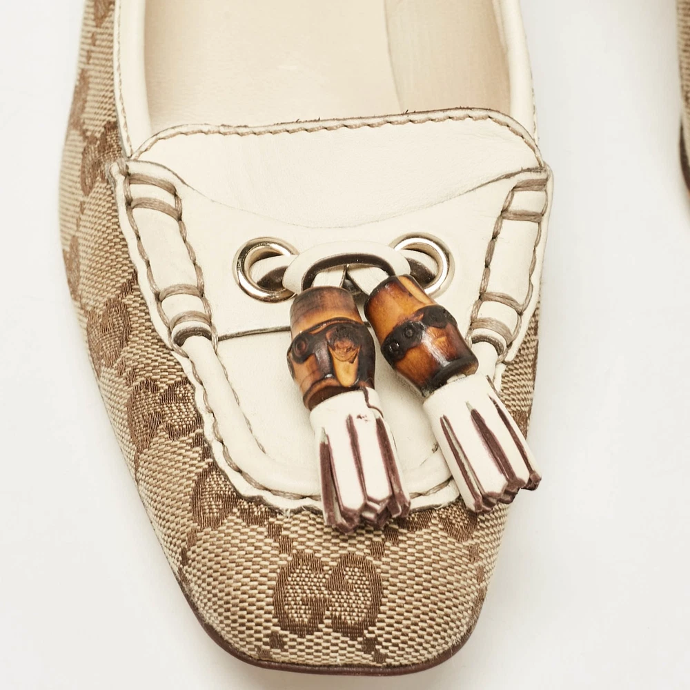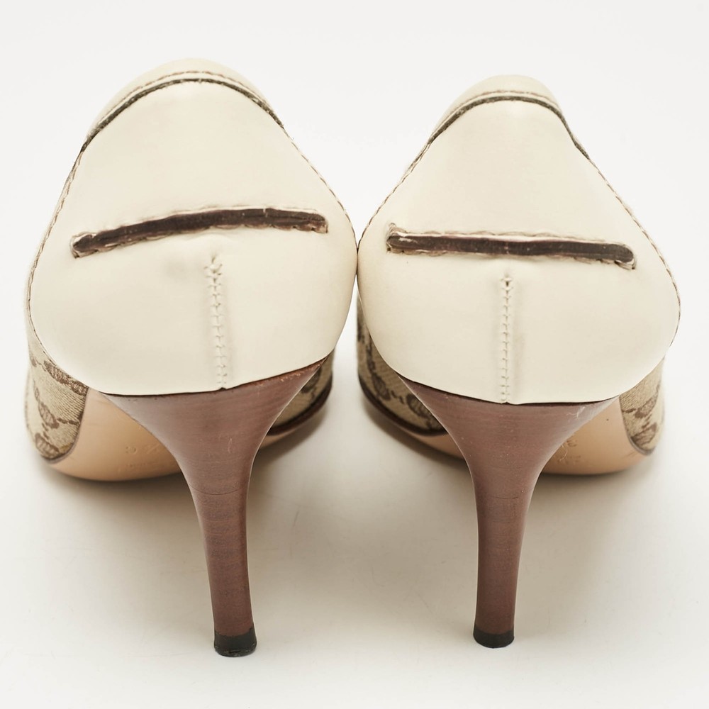 Gucci Brown Cream Monogram Canvas Leather Loafer Pumps Size 36.5