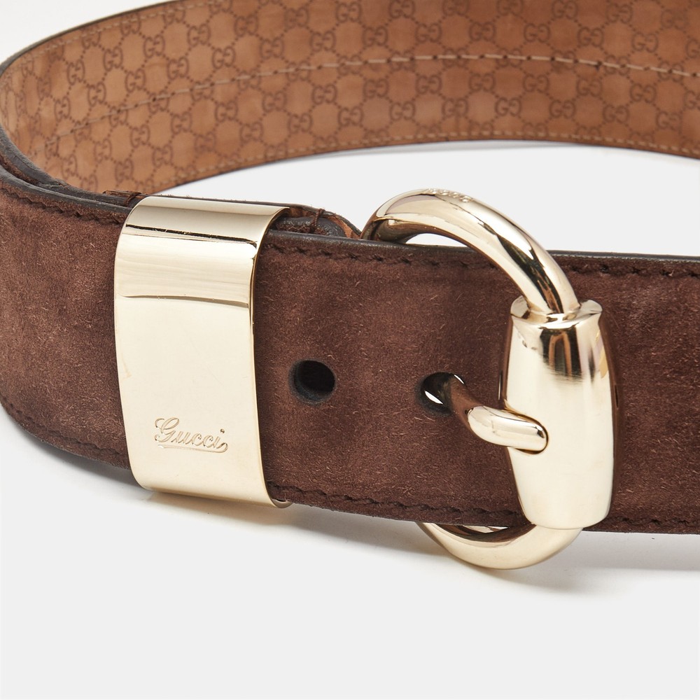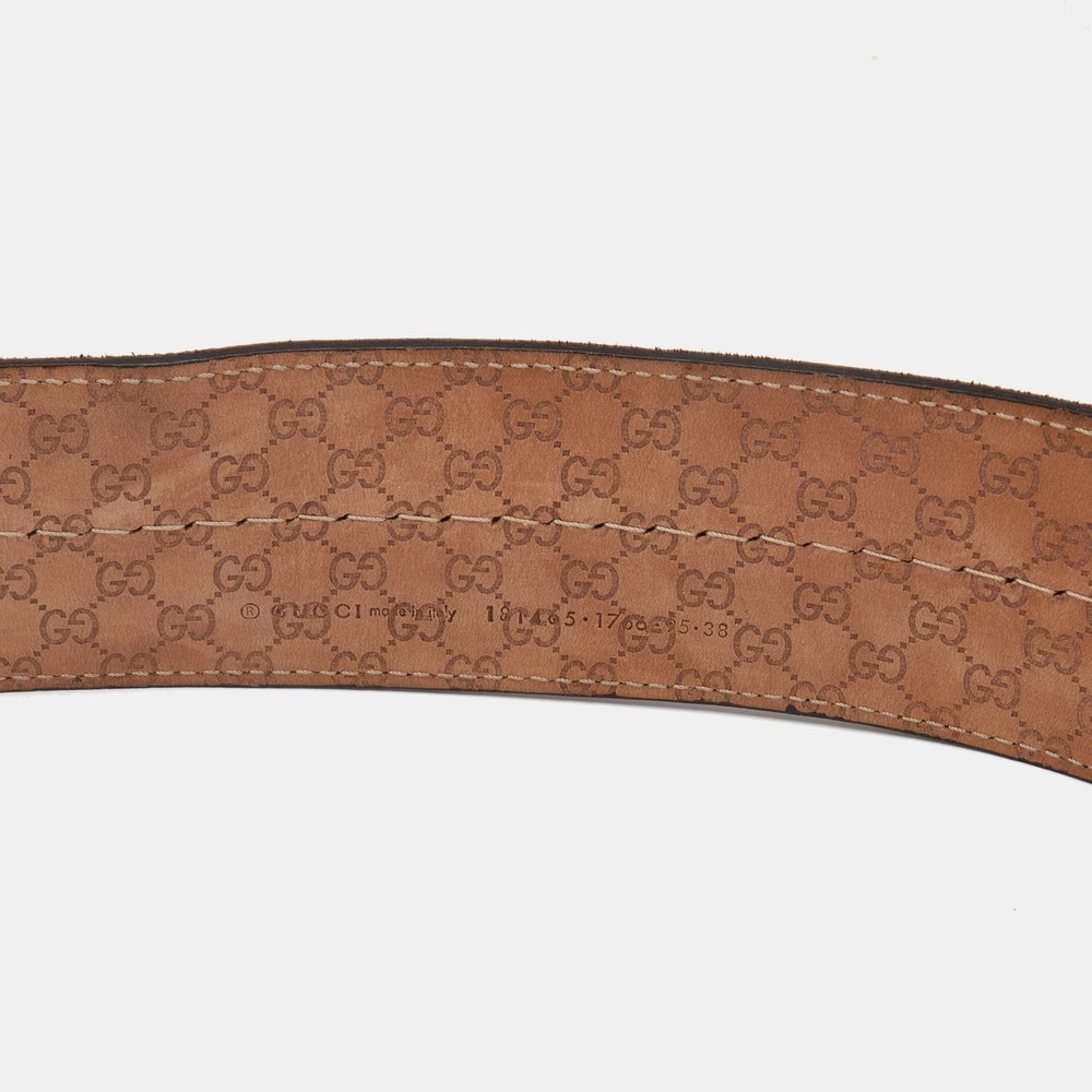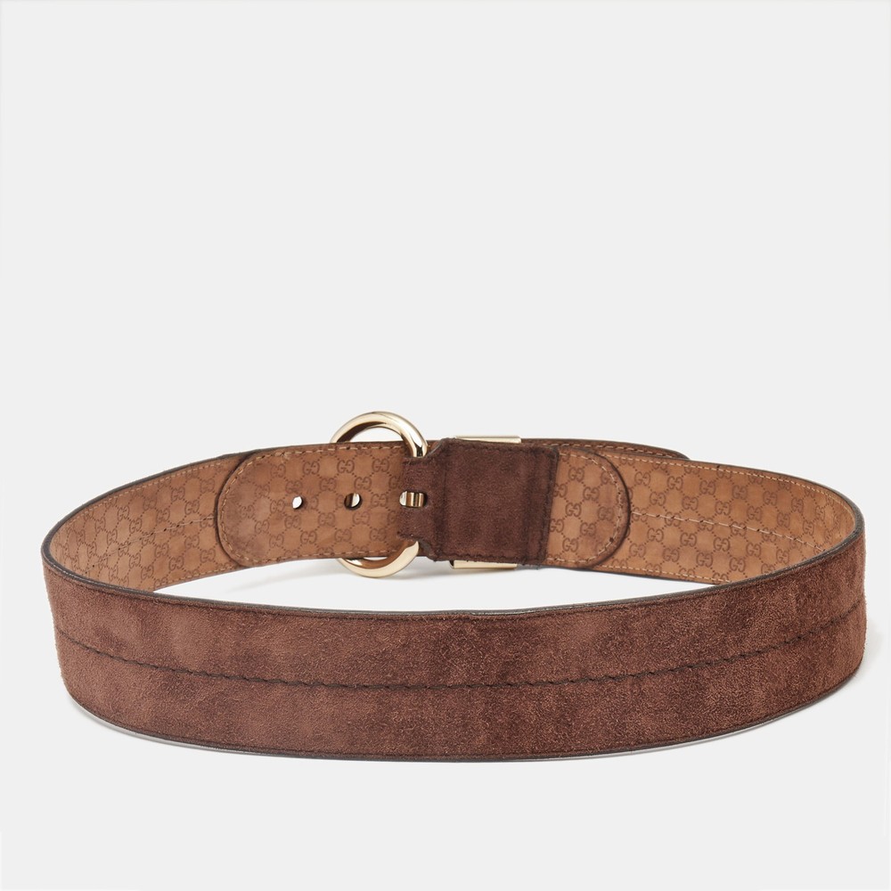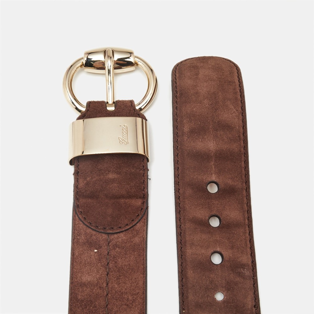 Elevate your wardrobe staples with this Gucci belt, crafted from rich brown suede for a soft, tactile finish. The wide silhouette is accented by a bold, sculptural buckle that adds a statement touch to both casual and polished ensembles.Certified by The Luxury Closet - This item has gone through a detailed authentication process overseen by our experts. We offer a lifetime guarantee of authenticity on all our items. Import duties, taxes and charges are not included in the item price. These charges are the buyers responsibility. Please check with your country’s customs office to determine what these additional cost will be prior to buying. Our eBay Store About Us Contact Us Add to Favorite Sellers Gucci Brown Suede Wide Buckle Belt 95 CM $188.1 Elevate your wardrobe staples with this Gucci belt, crafted from rich brown suede for a soft, tactile finish. The wide silhouette is accented by a bold, sculptural buckle that adds a statement touch to both casual and polished ensembles. Product Details Brand Color Brown Dimensions Material Suede Size 95 CM Outsole Width Outsole Length Heel Height Includes Certified by The Luxury Closet This item has gone through a detailed authentication process overseen by our experts. We offer a lifetime guarantee of authenticity on all our items. How We Check The in-house team of experts at The Luxury Closet is highly trained to verify the authenticity and the condition of the luxury products. They ensure that only 100% authentic items are put on sale.The evaluation process is unique with its own mix of assessment criteria and differs according to the category. Each item is evaluated based on the following combination of hallmarks, hardware, stitching, symmetry, material, craftsmanship, stamping, codes, hologram stickers, and packaging. Our authenticators also check if the items have been modified or amended (e.g., aftermarket diamonds, replaced batteries, repaired bags, etc.) International Buyers Import duties, taxes and charges are not included in the item price. These charges are the buyers responsibility. Please check with your country’s customs office to determine what these additional cost will be prior to buying.
