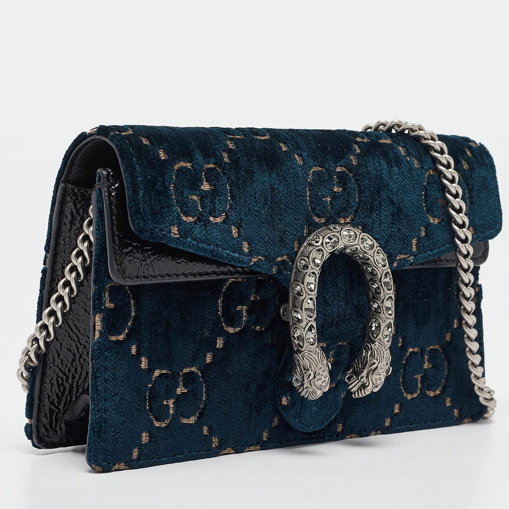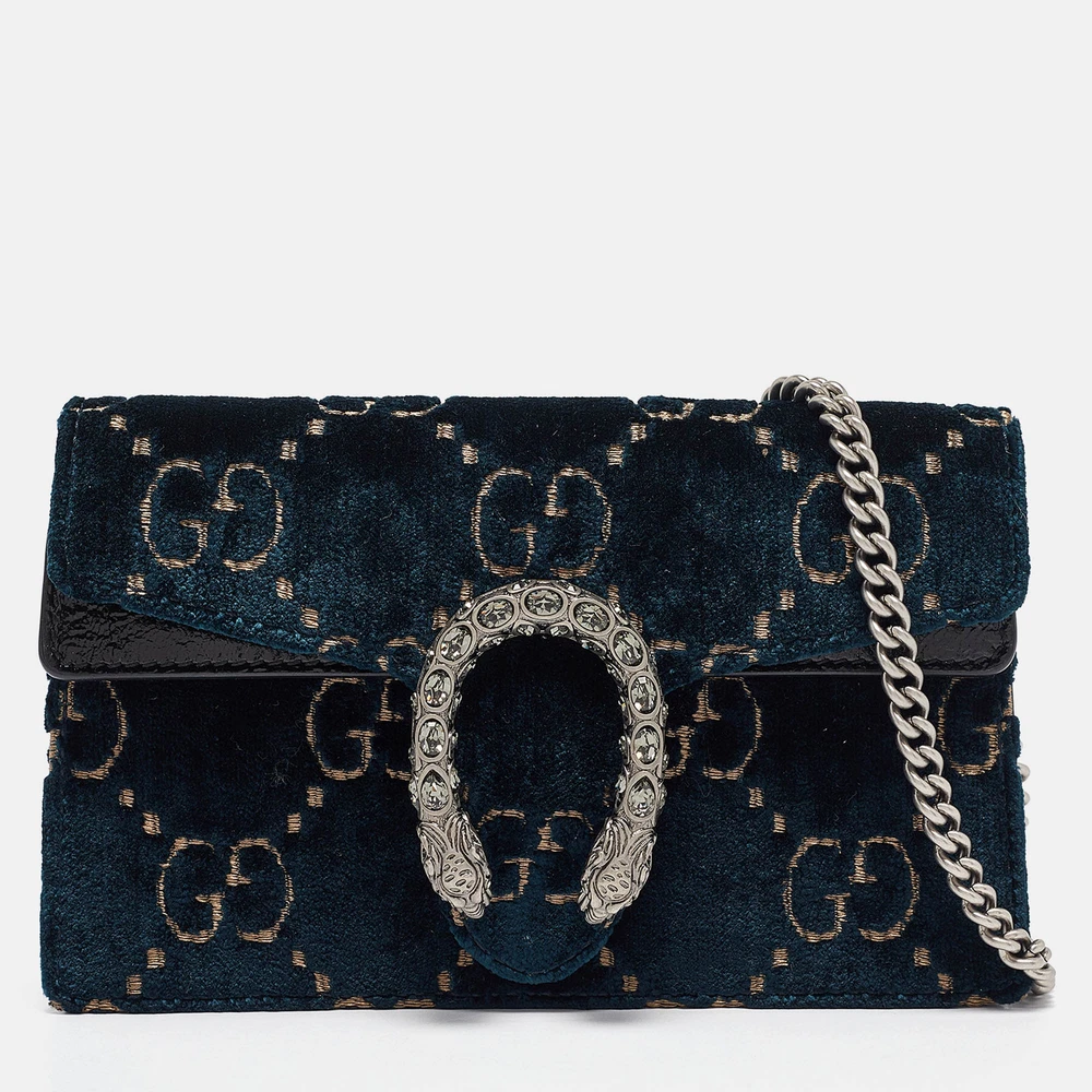 Structured, sophisticated, and stylish are some words that describe this shoulder bag Crafted from quality materials, the creation is adorned with the labels signature appeal and equipped with a well spaced interior.Certified by The Luxury Closet - This item has gone through a detailed authentication process overseen by our experts. We offer a lifetime guarantee of authenticity on all our items. Import duties, taxes and charges are not included in the item price. These charges are the buyers responsibility. Please check with your country’s customs office to determine what these additional cost will be prior to buying. Our eBay Store About Us Contact Us Add to Favorite Sellers Gucci Dark Blue GG Velvet and Patent Leather Super Mini Dionysus Shoulder Bag $746.9 Structured, sophisticated, and stylish are some words that describe this shoulder bag Crafted from quality materials, the creation is adorned with the labels signature appeal and equipped with a well spaced interior. Product Details Brand Color Blue Dimensions Height: 10 cm, Width: 4.5 cm, Length: 16.5 cm Material Velvet Size XXS Outsole Width Outsole Length Heel Height Includes Original Box, Info Booklet, Original Dustbag Certified by The Luxury Closet This item has gone through a detailed authentication process overseen by our experts. We offer a lifetime guarantee of authenticity on all our items. How We Check The in-house team of experts at The Luxury Closet is highly trained to verify the authenticity and the condition of the luxury products. They ensure that only 100% authentic items are put on sale.The evaluation process is unique with its own mix of assessment criteria and differs according to the category. Each item is evaluated based on the following combination of hallmarks, hardware, stitching, symmetry, material, craftsmanship, stamping, codes, hologram stickers, and packaging. Our authenticators also check if the items have been modified or amended (e.g., aftermarket diamonds, replaced batteries, repaired bags, etc.) International Buyers Import duties, taxes and charges are not included in the item price. These charges are the buyers responsibility. Please check with your country’s customs office to determine what these additional cost will be prior to buying.