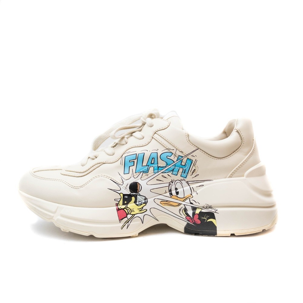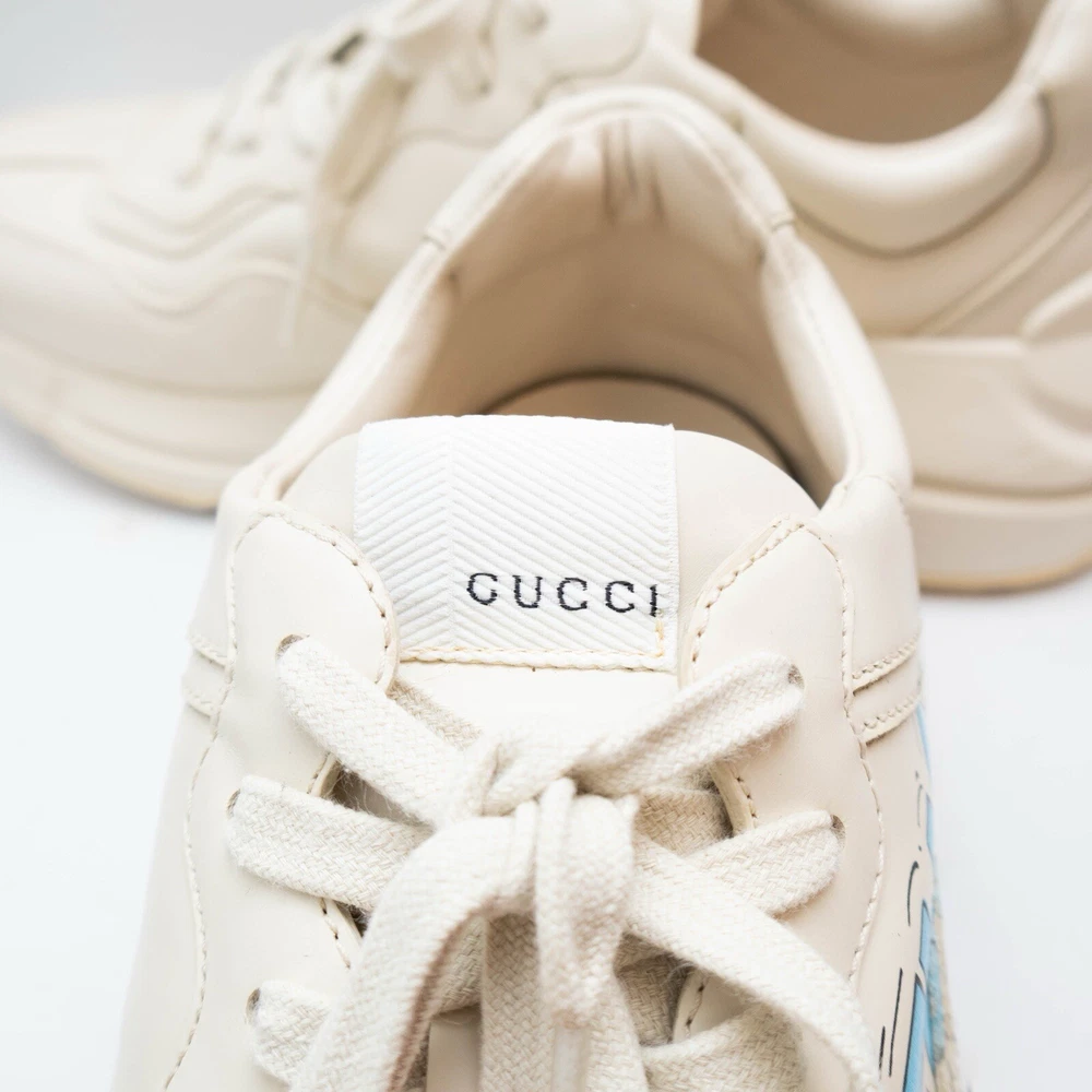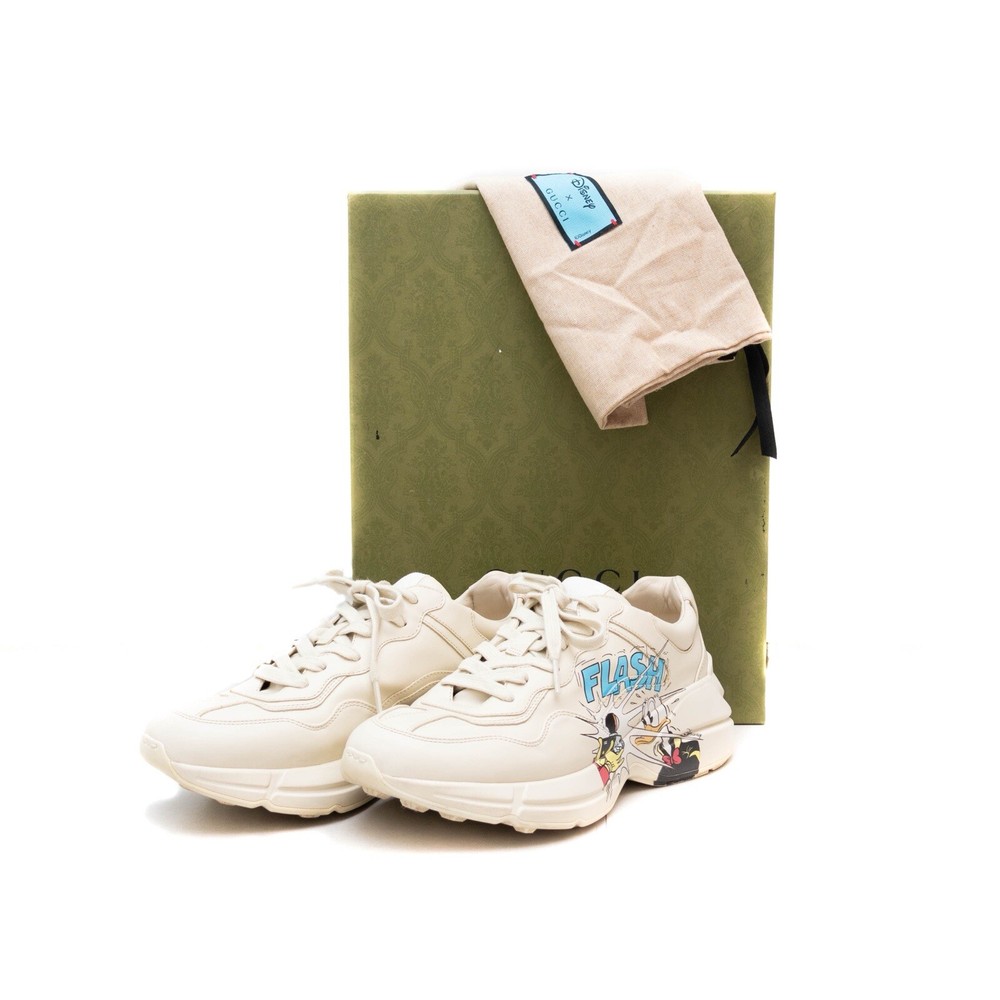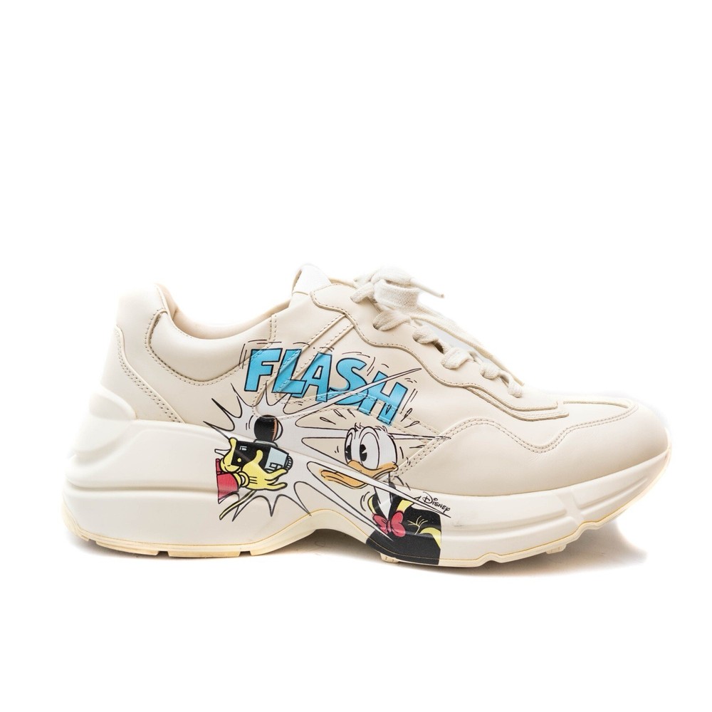 Gucci Rython X Disney Donald Duck Ivory Leather Sneakers Men’s Size US 11.5 Has a few stains as shown on pictures and the back heels have some stains )!!! Please Dbl check pictures before purchasing. - Size:(C) UK6.5 US7 ; EU 40; 24.4cm - Very Good Preowned Condition, check photos carefully (8.5/10) - 100% Authentic - Made in Italy - ART : 646509 - Gucci label at tongue - Upper: 100% Leather - Sole : 100% Rubber - Lining & Insole:leather - 45 mm height - Cool Pair Of Sneakers - Great Styling - Branded Sole - Donald Duck on the side - Premium Quality - Box and Dust Bag Included - Classic Styling - Famous Brand - Very Comfortable - Premium Quality - Minimalistic Design - Beast for Casual Looks
