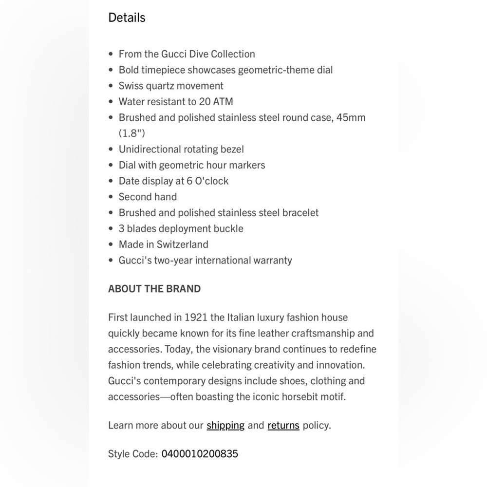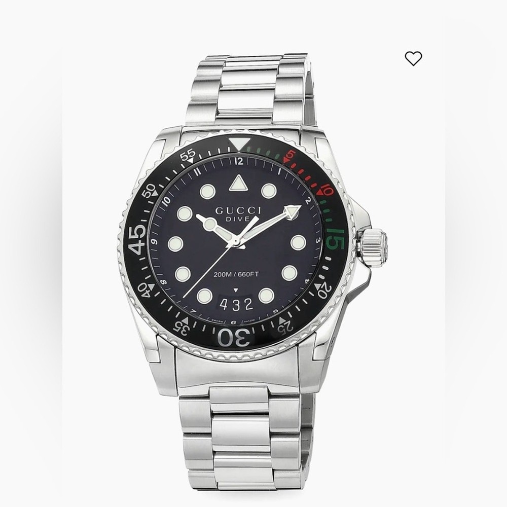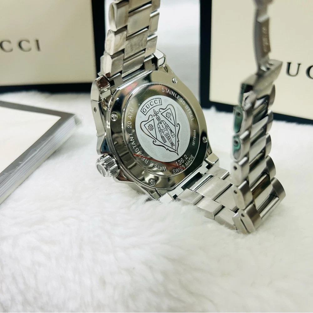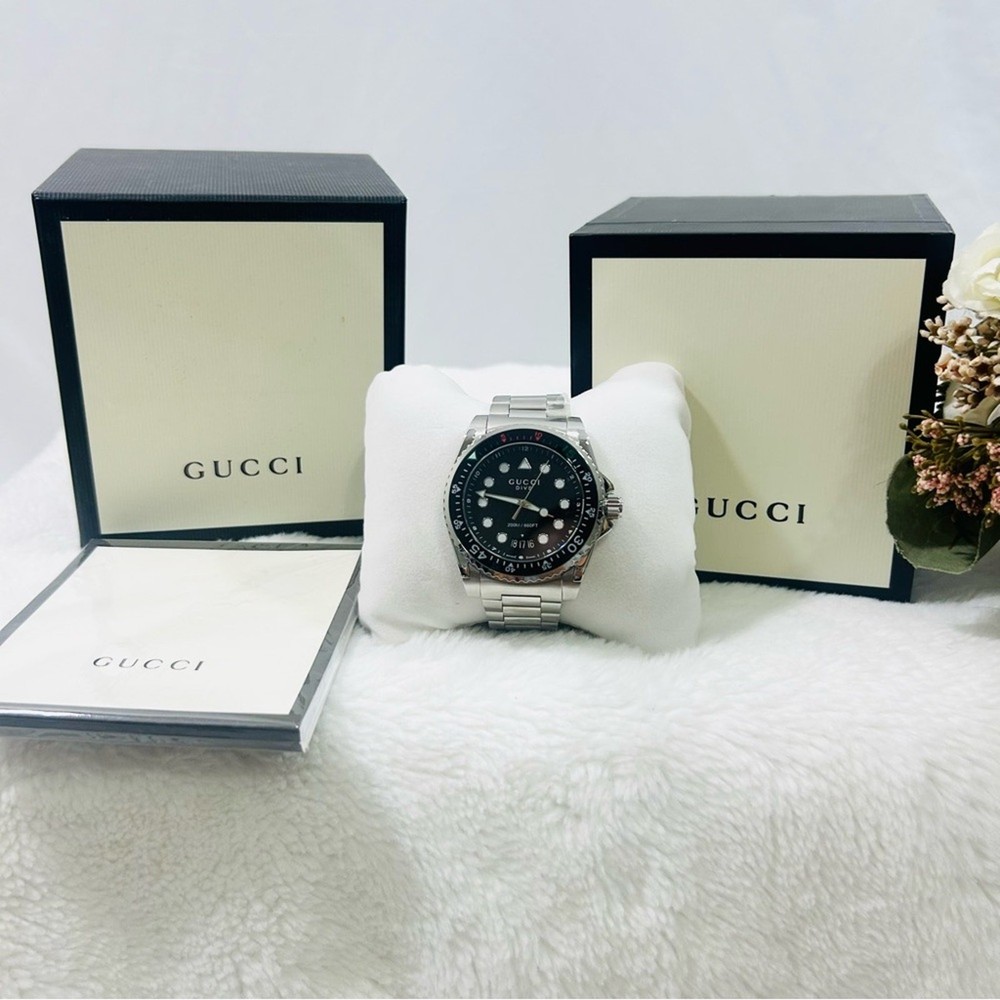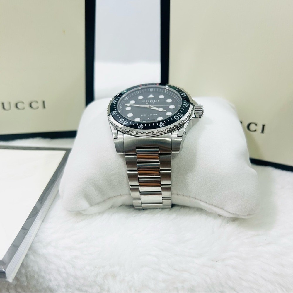 Gucci Dive Stainless Steel Black Dial Quartz Diver's YA136221 200M Watch NEW . Super nice . Selling at Saks Fifth Ave for $1800 . New in box. Shipped with USPS Priority Package, No returns but backed by ebay money back guarantee. If you have any other questions please contact seller . Please leave a wonderful feedback once you are satisfied with the purchase , Thank you . Custom charges may apply for international purchases .