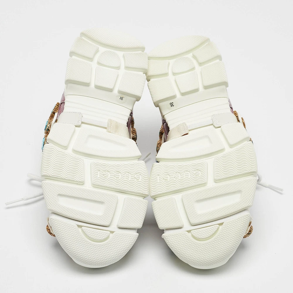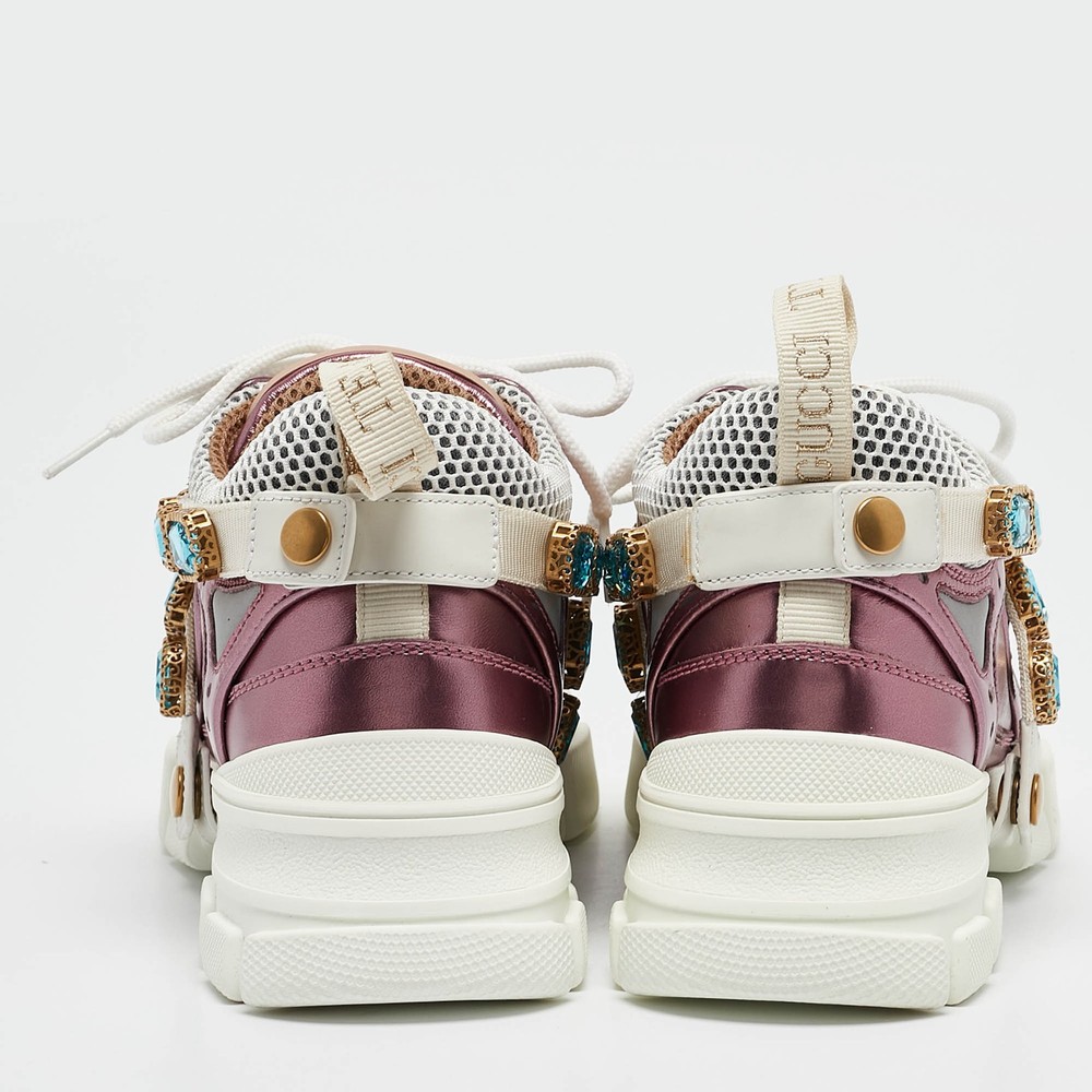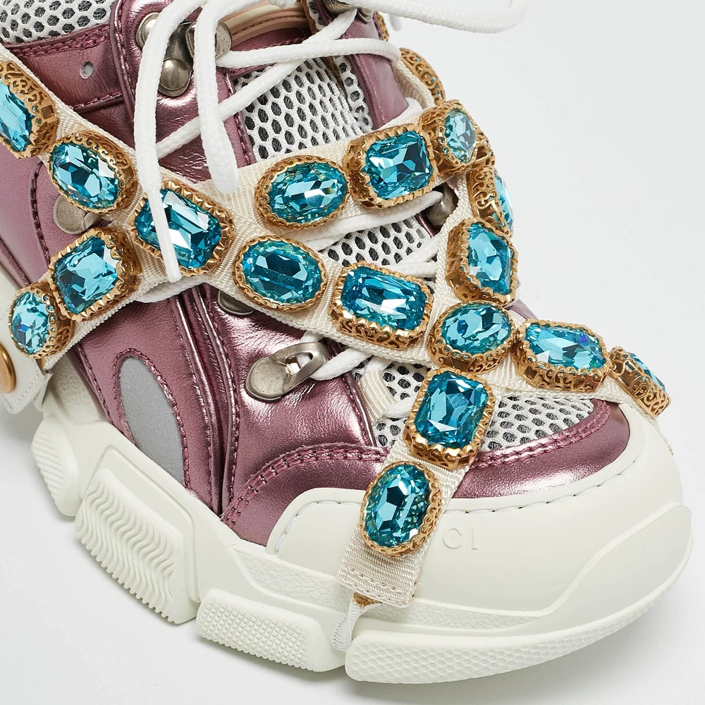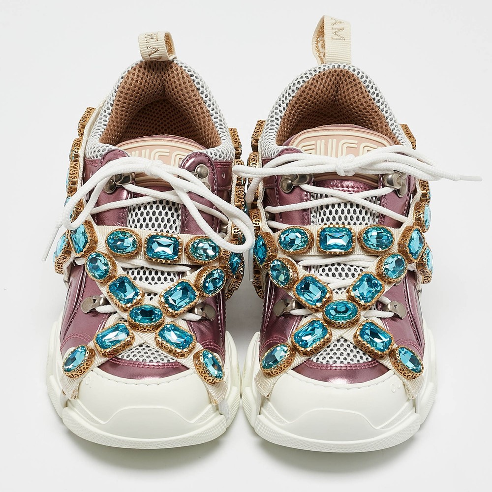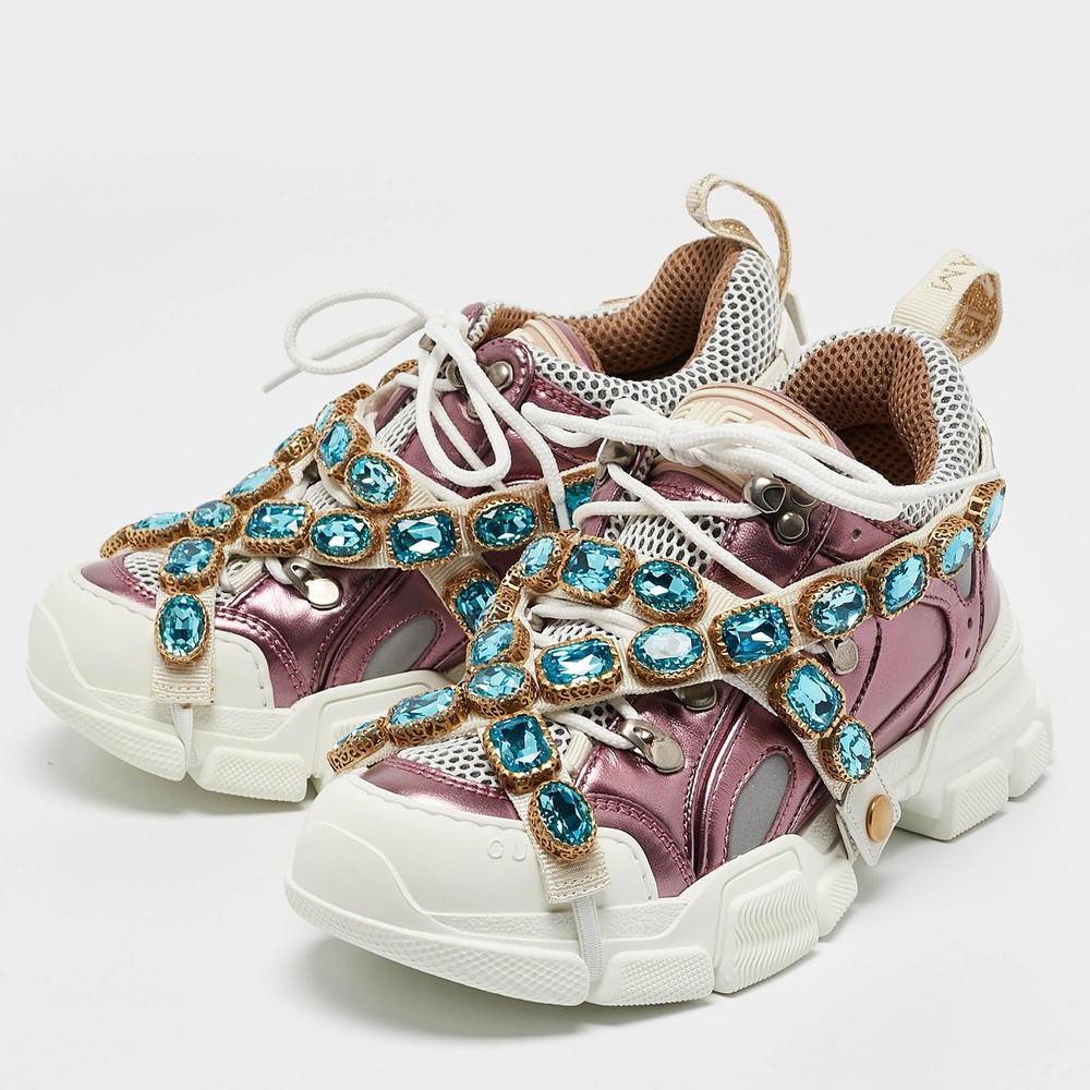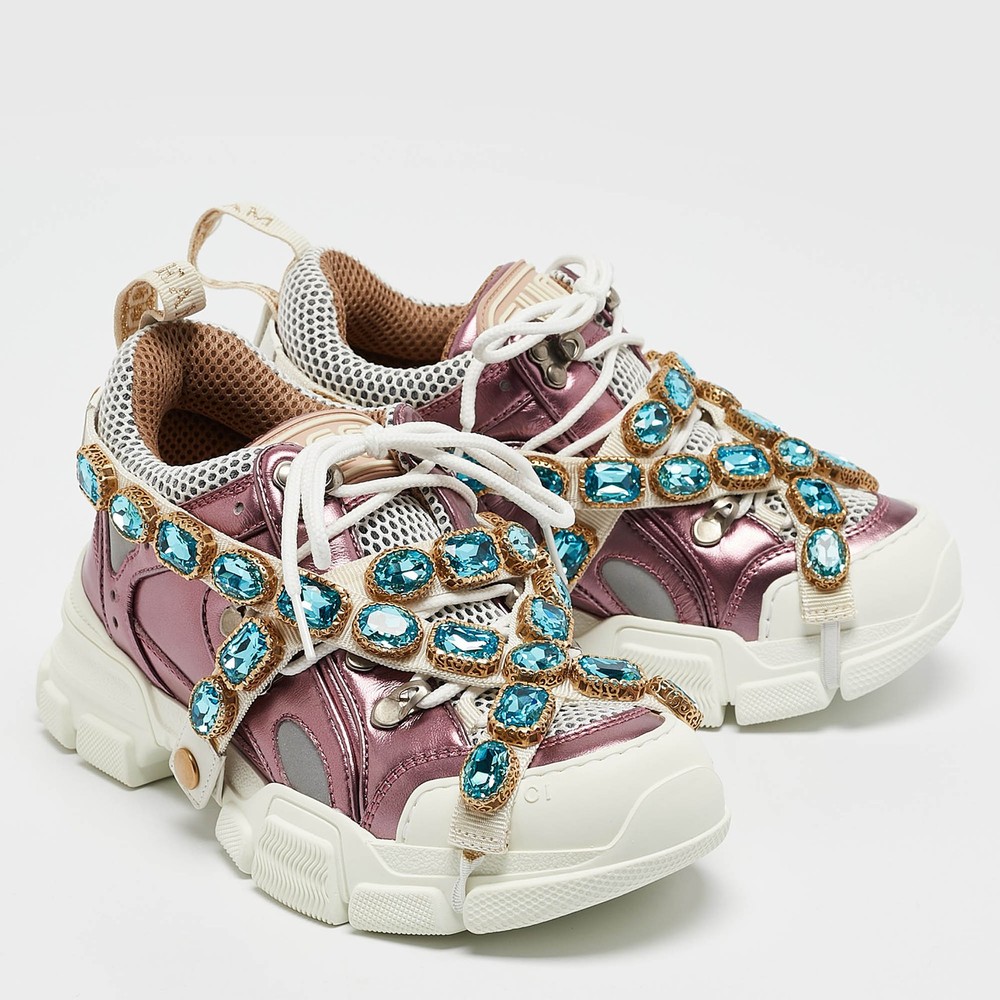 Designed into a chunky size, these Gucci sneakers are not just stylish in appeal but also comfortable to wear. Crafted from quality materials, they are designed with signature details. Finished off with laces on the vamps, these kicks still top any sneakerheads listCertified by The Luxury Closet - This item has gone through a detailed authentication process overseen by our experts. We offer a lifetime guarantee of authenticity on all our items. Import duties, taxes and charges are not included in the item price. These charges are the buyers responsibility. Please check with your country’s customs office to determine what these additional cost will be prior to buying. Our eBay Store About Us Contact Us Add to Favorite Sellers Gucci Metallic Pink Leather and Mesh Flashtrek Sneakers Size 35 $486.2 Designed into a chunky size, these Gucci sneakers are not just stylish in appeal but also comfortable to wear. Crafted from quality materials, they are designed with signature details. Finished off with laces on the vamps, these kicks still top any sneakerheads list Product Details Brand Color Pink Dimensions Material Leather, Mesh Size 35 Outsole Width 11 cm Outsole Length 27 cm Heel Height Includes Original Box, Info Booklet Certified by The Luxury Closet This item has gone through a detailed authentication process overseen by our experts. We offer a lifetime guarantee of authenticity on all our items. How We Check The in-house team of experts at The Luxury Closet is highly trained to verify the authenticity and the condition of the luxury products. They ensure that only 100% authentic items are put on sale.The evaluation process is unique with its own mix of assessment criteria and differs according to the category. Each item is evaluated based on the following combination of hallmarks, hardware, stitching, symmetry, material, craftsmanship, stamping, codes, hologram stickers, and packaging. Our authenticators also check if the items have been modified or amended (e.g., aftermarket diamonds, replaced batteries, repaired bags, etc.) International Buyers Import duties, taxes and charges are not included in the item price. These charges are the buyers responsibility. Please check with your country’s customs office to determine what these additional cost will be prior to buying.
