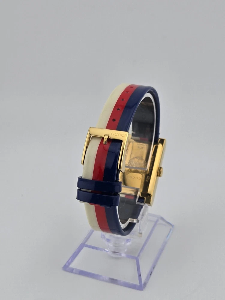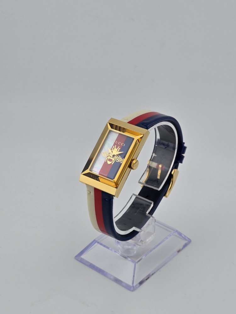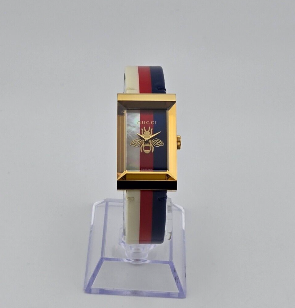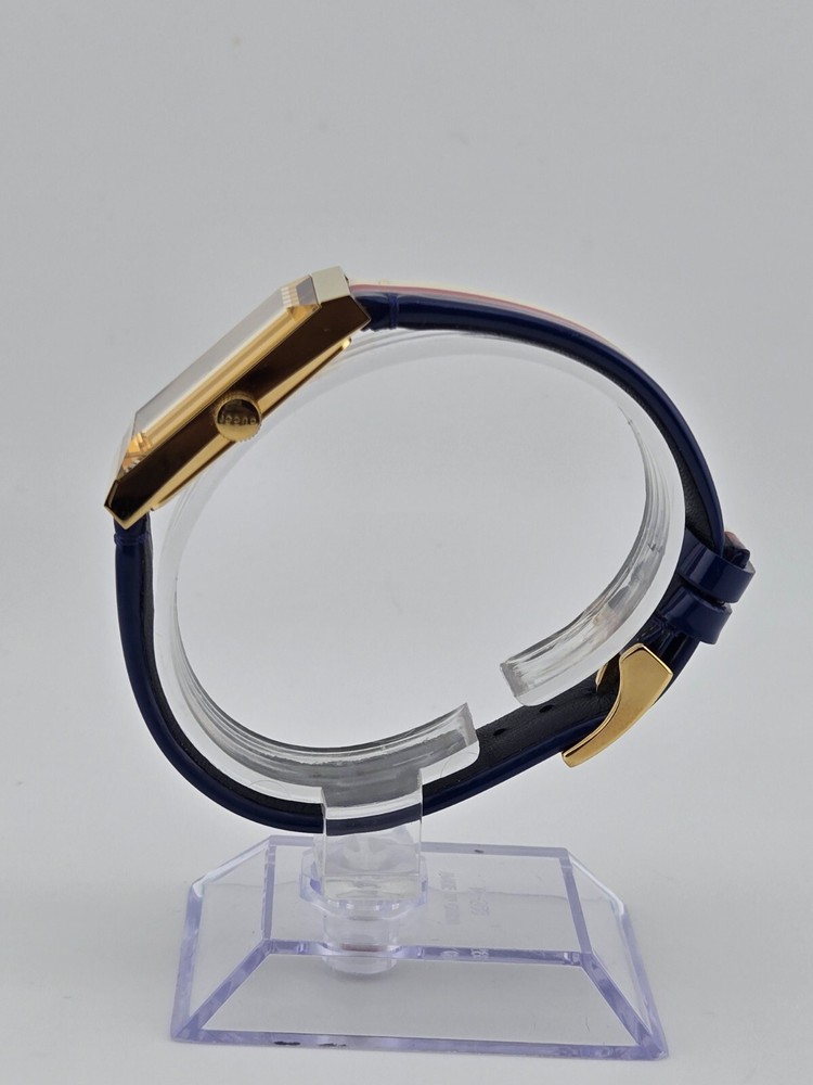 Gucci Women's G-Frame Multi-Color Quartz Ladies Watch - YA147409 ($1400 MSRP) New with Original Box and Tags! This watch is a Shelf Pull from one of the Major Department Stores. May find few micro scratches on the watch case/band, visible under a direct and strong light. The Gucci Women's G-Frame Multi-Color Quartz Ladies Watch - YA147409 exemplifies the brand's dedication to sophisticated design and impeccable craftsmanship. This elegant timepiece features a distinctive rectangular case made from high-quality stainless steel, measuring 21x34 mm with a thickness of 8 mm. The multi-color dial is protected by a scratch-resistant sapphire crystal, ensuring clarity and durability. Gold-tone hands and a gold-tone stainless steel bezel add a touch of luxury to the watch's overall aesthetic. Designed for women who appreciate both fashion and function, the G-Frame watch comes with a vibrant multi-color strap that adds a playful yet refined touch to any outfit. The strap, measuring 14 mm in width and designed to fit a men's standard length, is secured with a buckle clasp, providing a comfortable and adjustable fit. The watch is water-resistant up to 30 meters, making it suitable for everyday wear and light water activities. Powered by a precise quartz movement, this analog watch guarantees reliable timekeeping. The snap-down case back and push/pull crown add to the watch's practical features, ensuring ease of use and maintenance. With its combination of Swiss craftsmanship and Italian design flair, the Gucci Women's G-Frame Multi-Color Quartz Ladies Watch - YA147409 is a perfect accessory for those who demand the highest quality and style. Whether worn as an intricate evening accessory or a stylish everyday piece, this watch seamlessly blends traditional elegance with contemporary sophistication. Features Brand: Gucci Gender: Female Model: YA147409 Series: G-Frame Movement: Quartz Water Resistant: 30 Meters Band Color: Multi-color Band Width: 14 mm Band Length: Men's Standard Band Type: Strap Clasp: Buckle Case Material: Stainless Steel Case Size: 21x34 mm Case Thickness: 8 mm Case Shape: Rectangle Case Back Type: Snap-down Display Type: Analog Dial Color: Multi-color Crystal: Sapphire Crown: Push/Pull Bezel: Gold-Tone Stainless Steel Dial Hands: Gold-Tone Fast and Free Shipping You're already purchasing the item. Why pay additional for shipping, especially slow shipping? We get your order shipped out within 1-business day and delivered to your doorstep as quickly as possible. Competitive Pricing With our dynamic pricing model, our prices are always competitive. Our prices are some of the lowest that you will find on the internet. Rest assured that you're getting a good deal when purchasing with us. 30-day Money Back Guarantee We are committed to making sure that you leave this transaction satisfied. If you're unhappy with the product for any reason, you may return it back for your money-back or a replacement within 30 days. No questions asked!