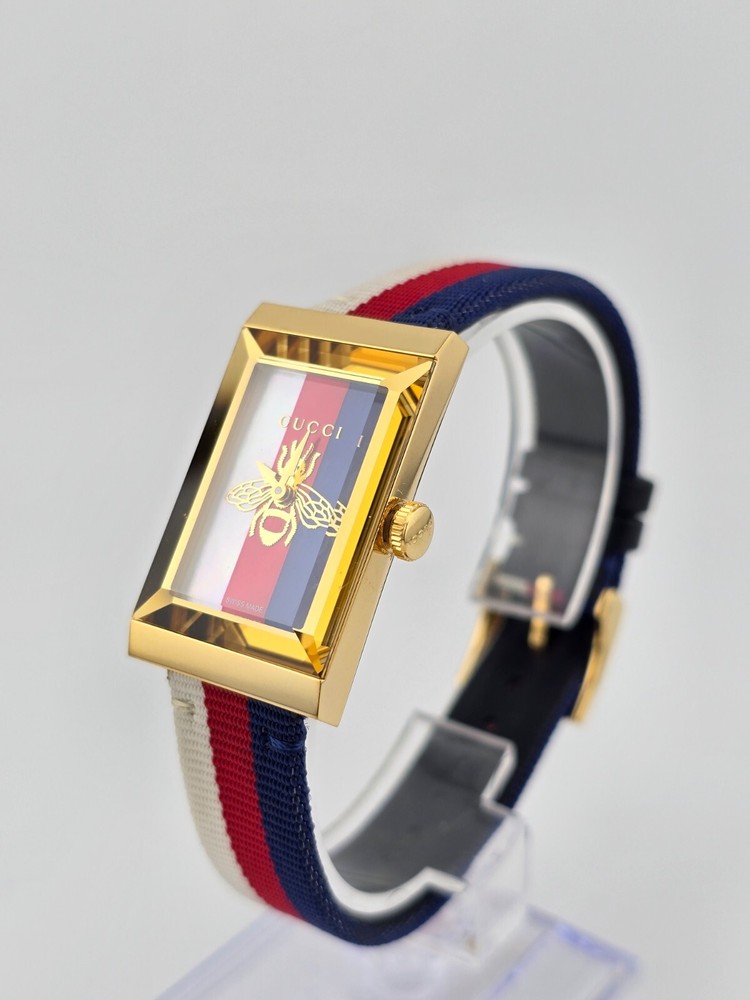 Gucci Women's G-Frame Mother of Pearl Dial Nylon Watch - ($1150 MSRP) With Original Box! This watch is a Shelf Pull from one of the Major Department Stores. Watch has micro scratches on the watch case/band, visible under direct light. Established in 1921 by Guccio Gucci, the Italian fashion brand Gucci not only offers luxury bags, clothes, footwear, accessories, perfume, and beauty products but also provides some of the world’s finest watches. Offering exquisite Italian craftsmanship fused with Swiss technology — from delicate dress watches for women to robust dive watches for men, Gucci earns the trust not only of fashion aficionados but also serious watch enthusiasts. Features Yellow gold PVD stainless steel case with a nylon strap. Fixed bezel. Mother of pearl dial with gold-tone hands. Dial Type: Analog. Quartz movement. Pull / push crown. Solid case back. Rectangle case shape. Case size: 21 mm x 34 mm. Buckle clasp. Water resistant at 50 meters / 165 feet. Functions: hour, minute. Dress watch style. Watch label: Swiss Made. Fast and Free Shipping You're already purchasing the item. Why pay additional for shipping, especially slow shipping? We get your order shipped out within 1-business day and delivered to your doorstep as quickly as possible. Competitive Pricing With our dynamic pricing model, our prices are always competitive. Our prices are some of the lowest that you will find on the internet. Rest assured that you're getting a good deal when purchasing with us. 30-day Money Back Guarantee We are committed to making sure that you leave this transaction satisfied. If you're unhappy with the product for any reason, you may return it back for your money-back or a replacement within 30 days. No questions asked!
