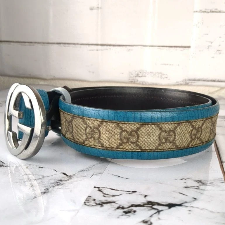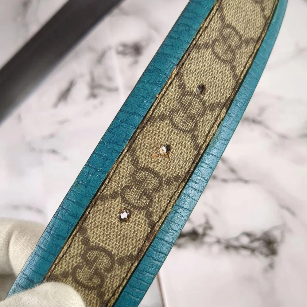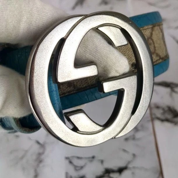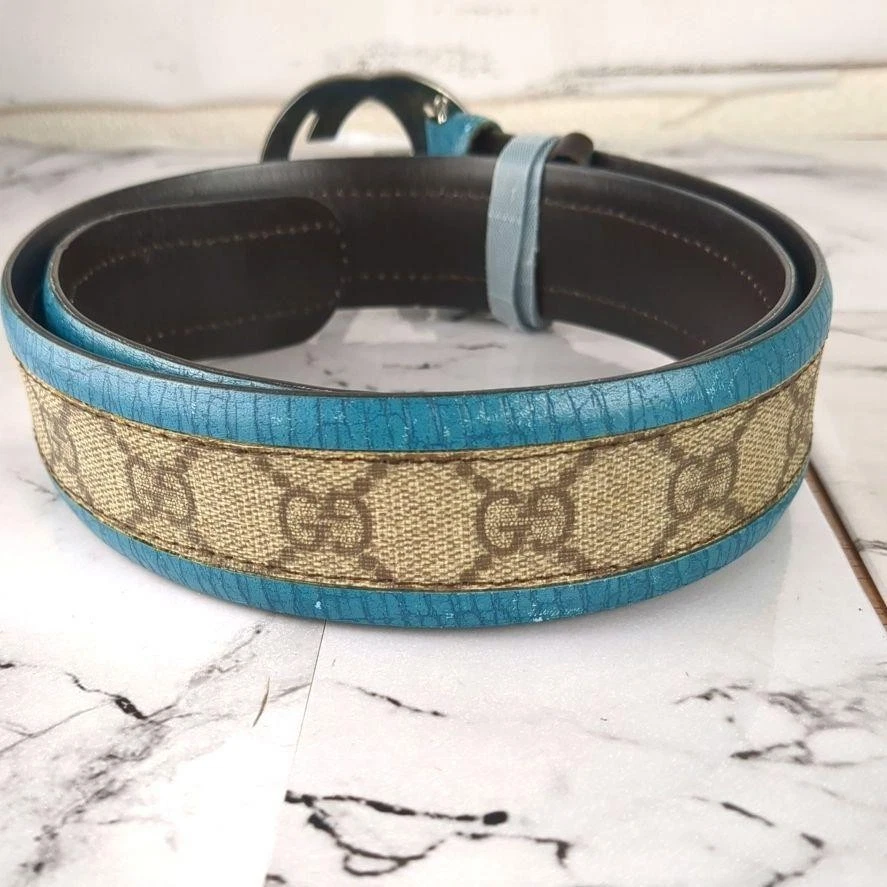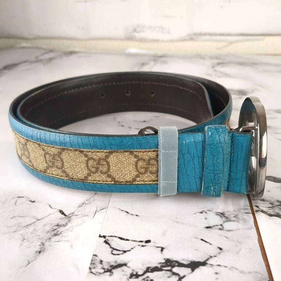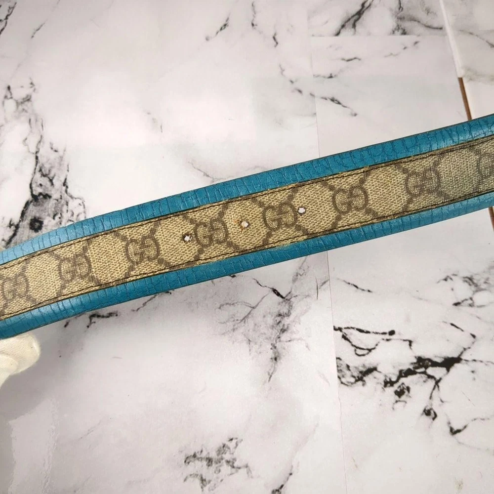 Absolutely love this Gucci belt! The rare turquoise blue color is stunning and makes a bold statement. The interlocking GG pattern is classic yet unique in this shade. The leather and PVC material feels high-quality, and the belt fits perfectly as described. No noticeable wear—looks almost new! Shipping from Japan was smooth and faster than expected. A must-have for any luxury accessory collection!