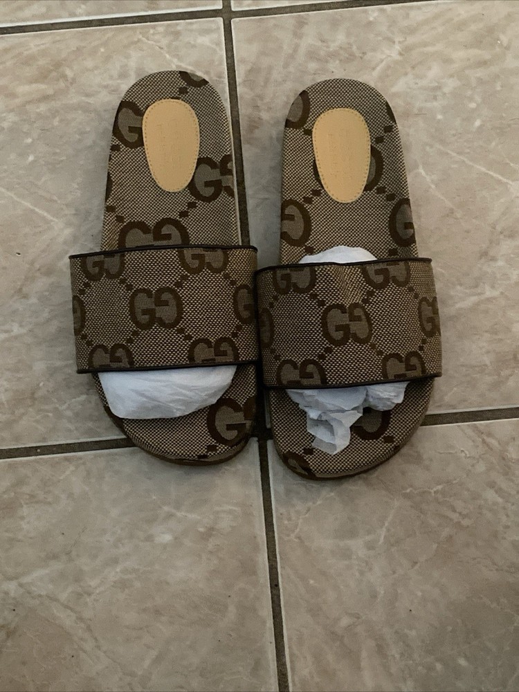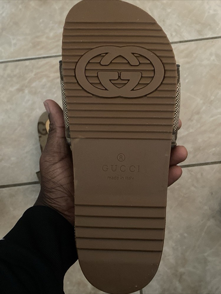 The Gucci GG Canvas Beige Slides Sandals are authentic, brand new, and come with a dust bag. These slip-on sandals feature a designer logo accent, moderate cushioning, rubber outsole, and canvas lining. Made in Italy, these stylish sandals are perfect for casual occasions in the summer or spring seasons. With a classic monogram pattern and a focus on luxury and fashion, these Gucci slides are a must-have for any designer shoe collection.