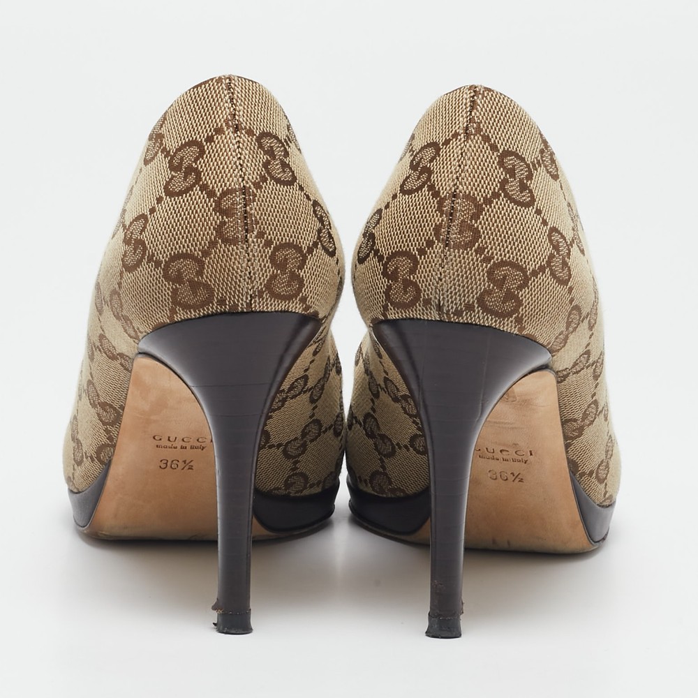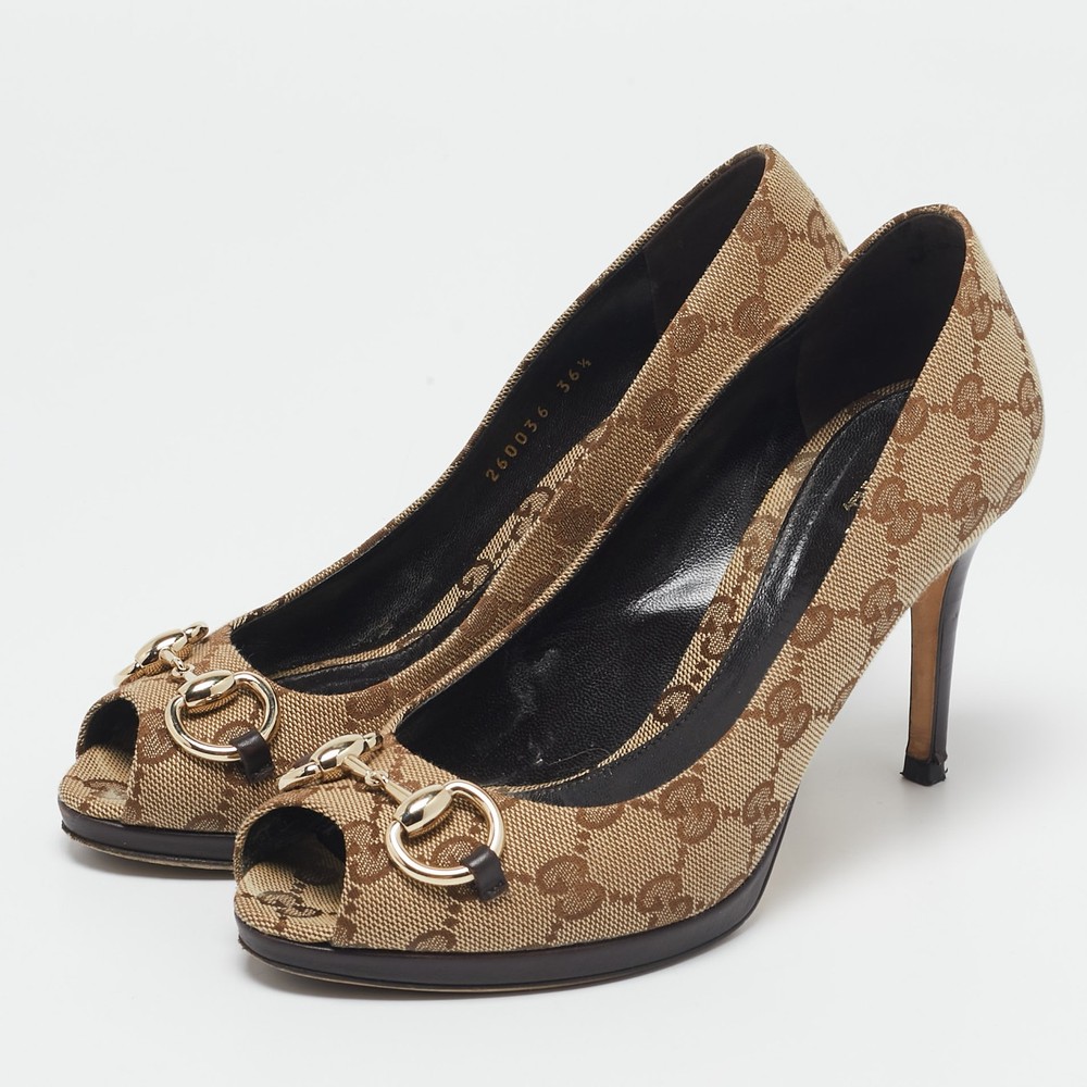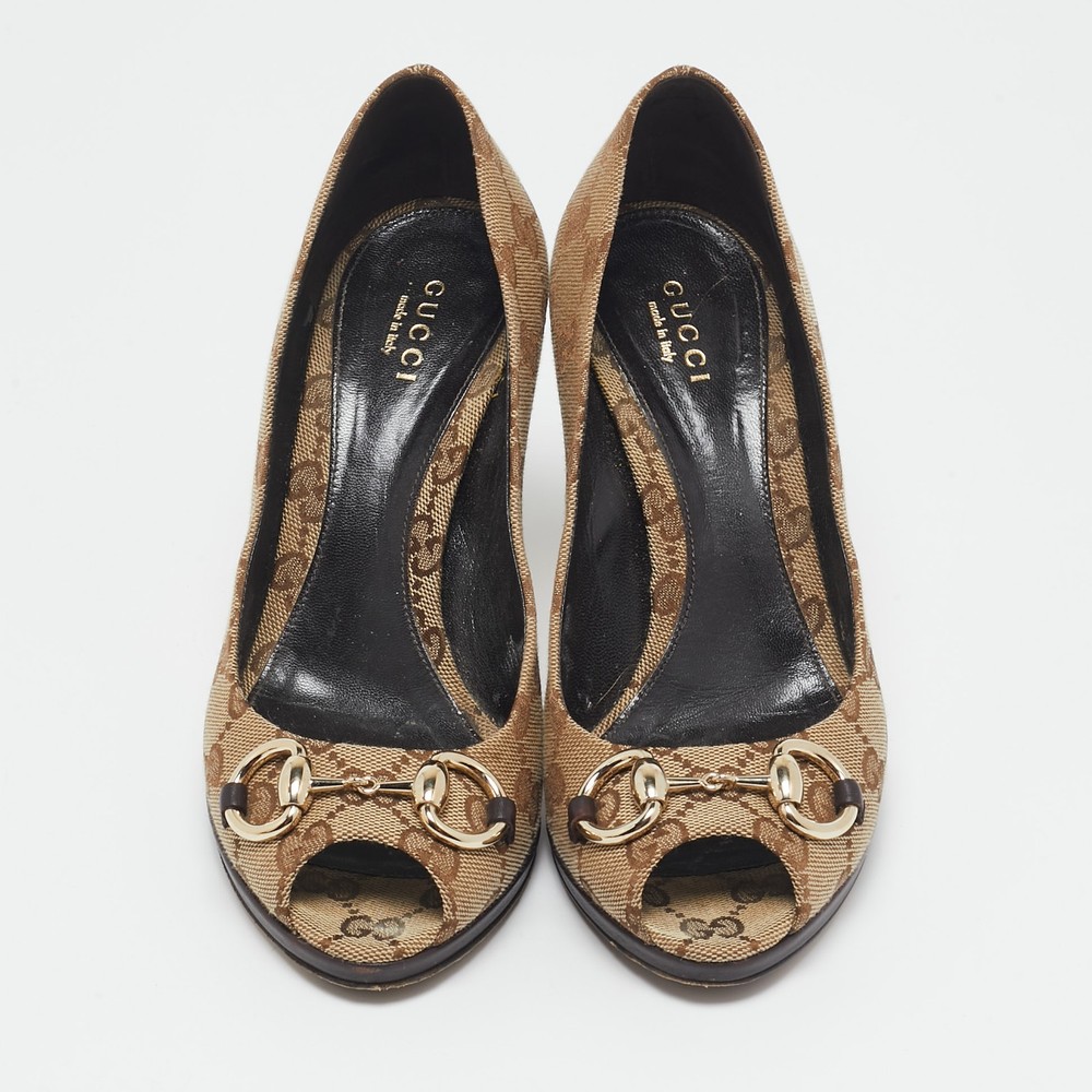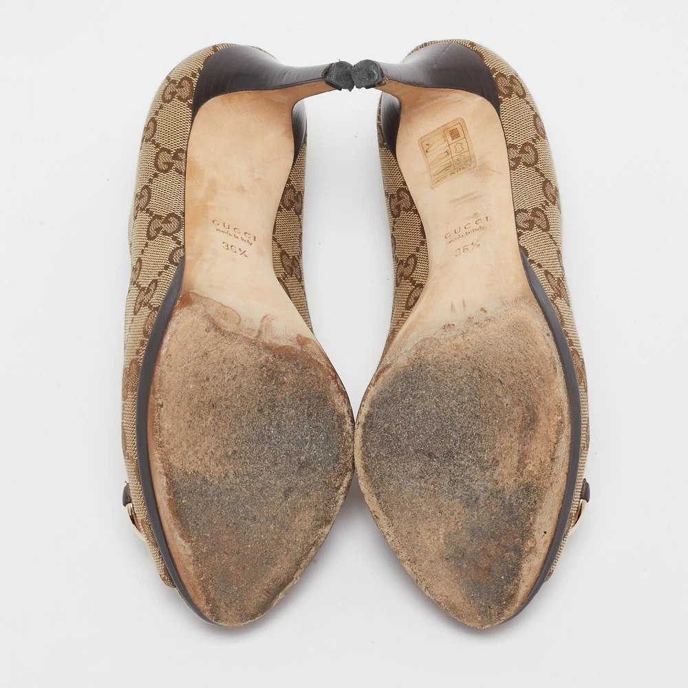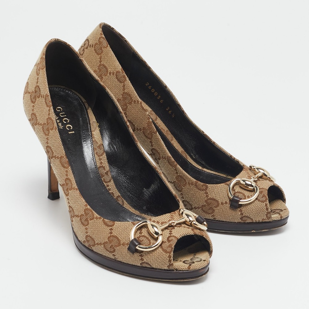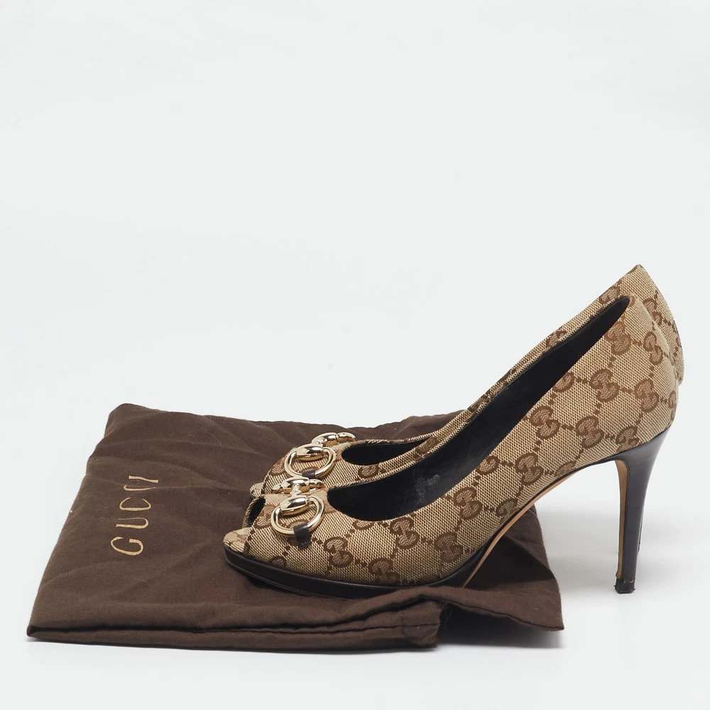 Gucci GG Canvas Horsebit Peep Toe Pumps in Beige Brown Size 36.5