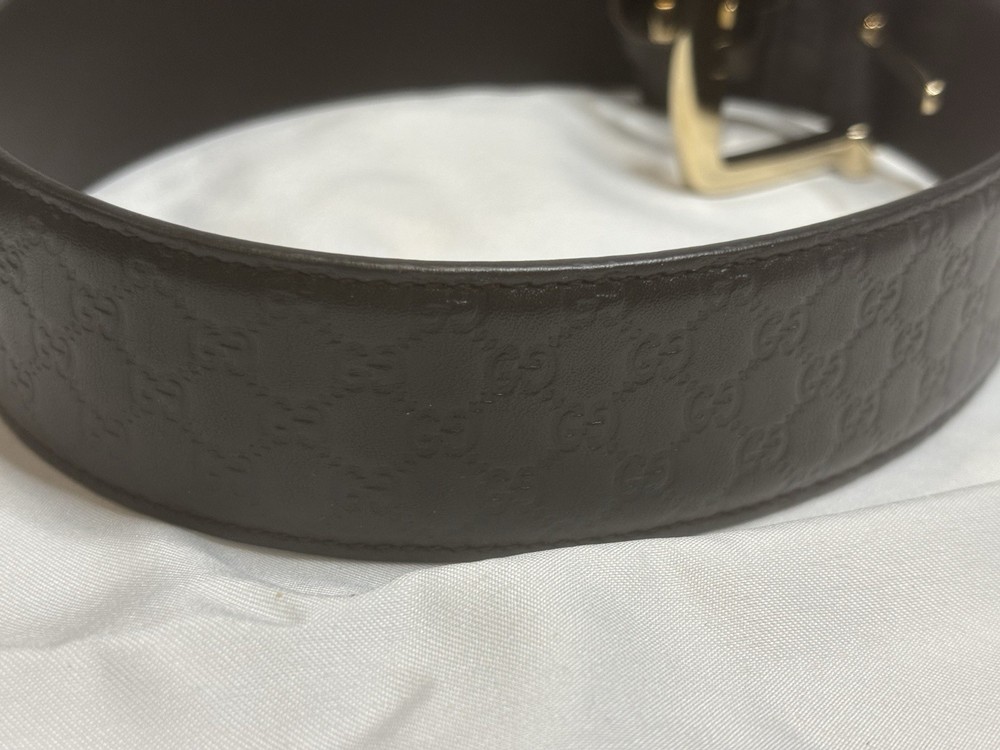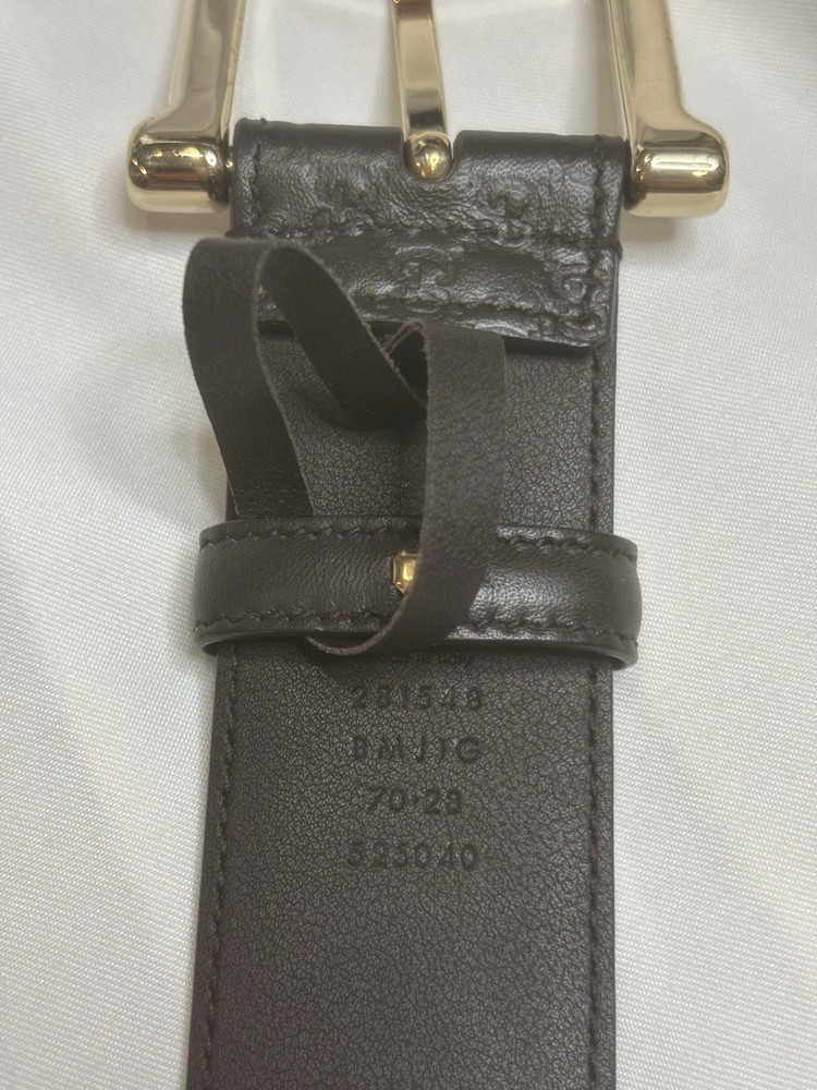 Gucci GG Guccissima Brown Leather Belt SZ 70/28 Authentic Gucci Guccissima Belt in dark brown embossed leather featuring the iconic interlocking GG monogram throughout. Finished with a sleek gold-tone buckle engraved with “Gucci,” this belt is both luxurious and understated. A classic piece made in Italy, perfect for everyday wear or elevating high-waisted looks. • Brand: Gucci • Size: 70/28 (Fits approx. US 24–25” waist) • Color: Dark Brown • Material: Leather • Hardware: Gold-tone • Condition: Very good pre-owned condition with minimal signs of wear. One extra hole has been added. Dust bag included. • Made in: Italy • Retail Price (est.): $395 – $495