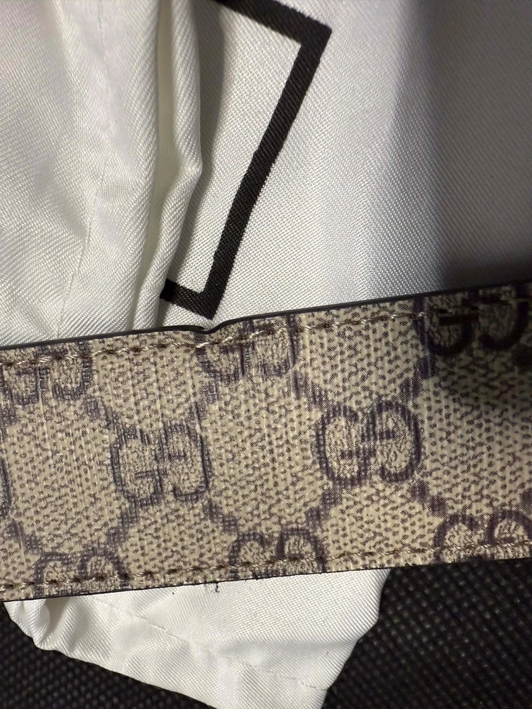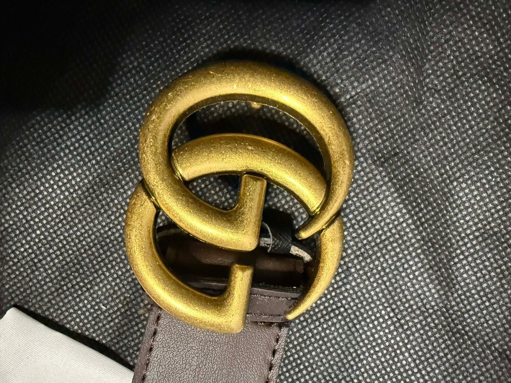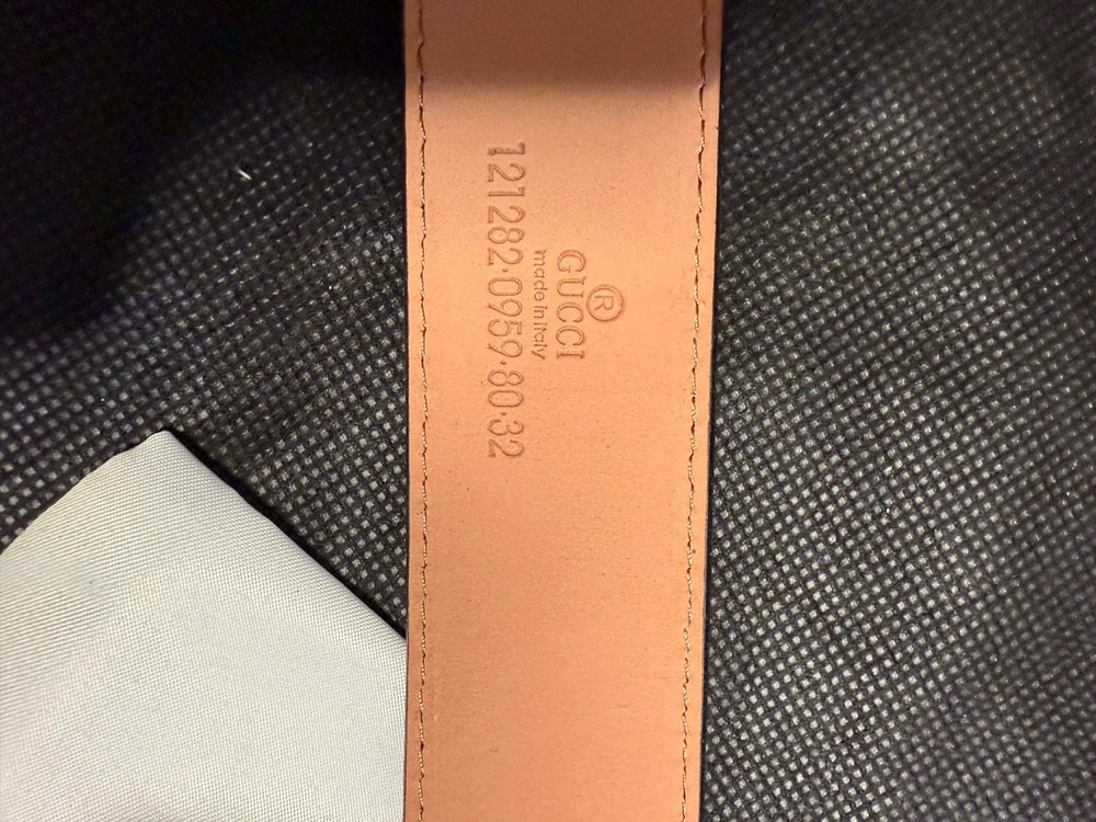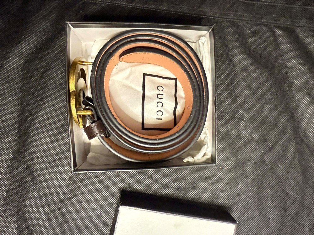 Gucci GG Marmont belt, featuring the iconic Double G buckle and a reversible design with GG Supreme canvas and premium leather. Perfect for adding a touch of luxury to any outfit. The Gucci box has visible damage, which is clearly shown in the photos. 127 cm