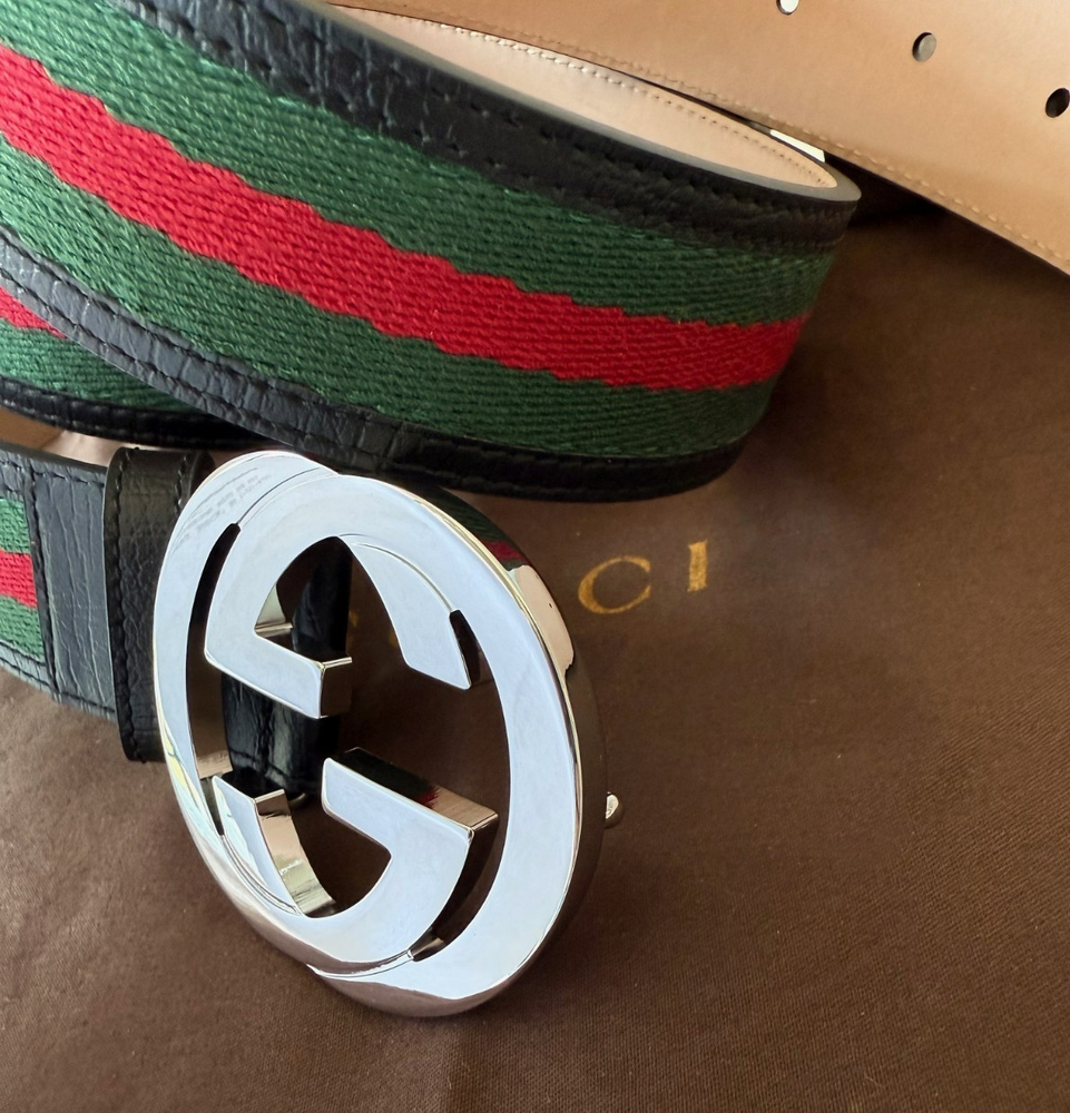 Gucci GG Silver Interlocking Buckle Web Belt Black,Green,Red Canvas Size 110 cm fit's 38-40 waist in Excellent Condition New Belt, comes with Box , Dust Bag & Tag's.