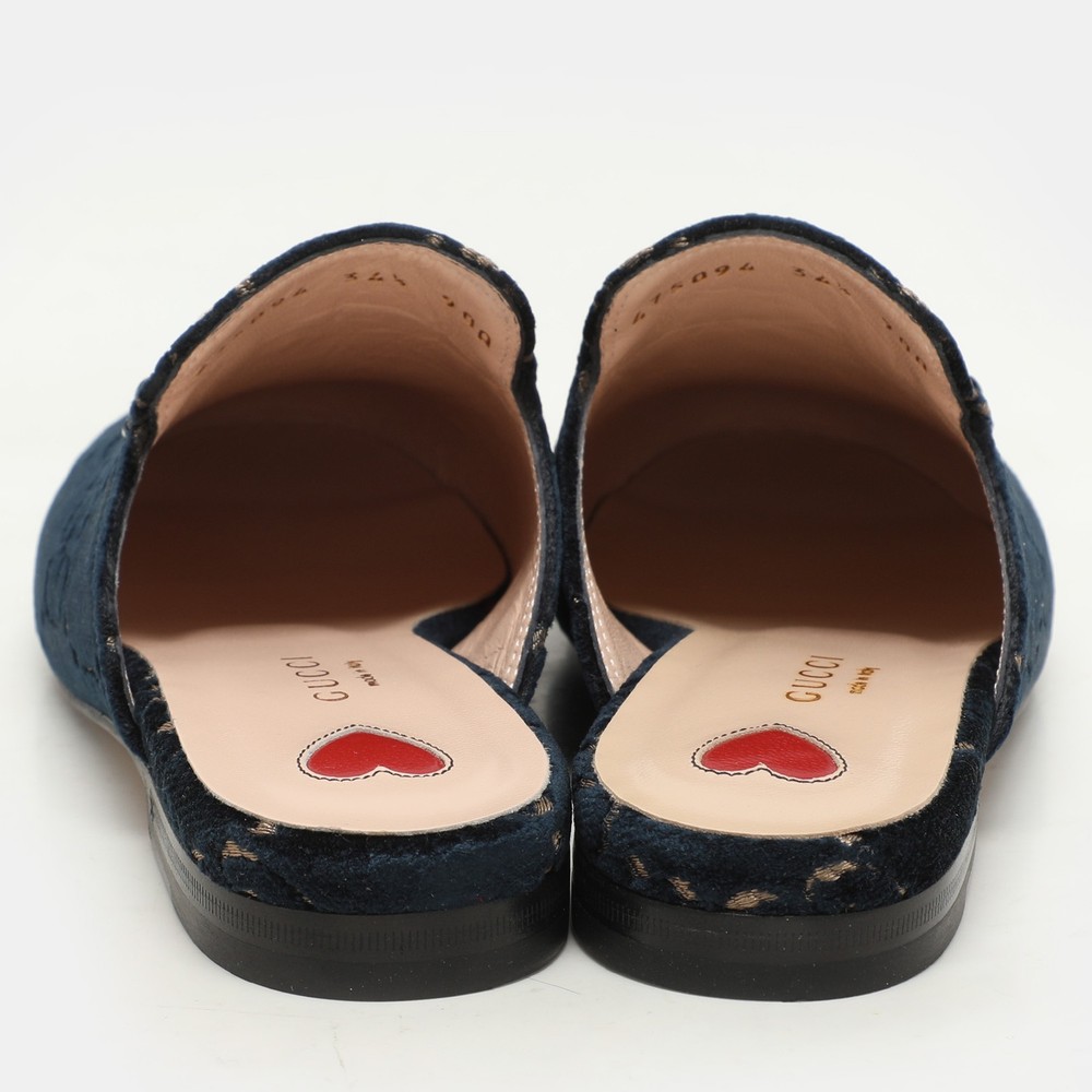 These Gucci Princetown mules signify luxury and practicality. An ultimate favourite of style enthusiasts, its silhouette gets a luxe update with the Horsebit motif on the uppers, and its charm is enhanced with gold tone accents. It comes made from velvet and features a slip on fitting.Certified by The Luxury Closet - This item has gone through a detailed authentication process overseen by our experts. We offer a lifetime guarantee of authenticity on all our items. Import duties, taxes and charges are not included in the item price. These charges are the buyers responsibility. Please check with your country’s customs office to determine what these additional cost will be prior to buying. Our eBay Store About Us Contact Us Add to Favorite Sellers Gucci Blue/Gold GG Velvet Princetown Horsebit Flat Mules Size 34.5 $643.5 These Gucci Princetown mules signify luxury and practicality. An ultimate favourite of style enthusiasts, its silhouette gets a luxe update with the Horsebit motif on the uppers, and its charm is enhanced with gold tone accents. It comes made from velvet and features a slip on fitting. Product Details Brand Color Blue Dimensions Material Velvet Size 34.5 Outsole Width Outsole Length Heel Height Includes Certified by The Luxury Closet This item has gone through a detailed authentication process overseen by our experts. We offer a lifetime guarantee of authenticity on all our items. How We Check The in-house team of experts at The Luxury Closet is highly trained to verify the authenticity and the condition of the luxury products. They ensure that only 100% authentic items are put on sale.The evaluation process is unique with its own mix of assessment criteria and differs according to the category. Each item is evaluated based on the following combination of hallmarks, hardware, stitching, symmetry, material, craftsmanship, stamping, codes, hologram stickers, and packaging. Our authenticators also check if the items have been modified or amended (e.g., aftermarket diamonds, replaced batteries, repaired bags, etc.) International Buyers Import duties, taxes and charges are not included in the item price. These charges are the buyers responsibility. Please check with your country’s customs office to determine what these additional cost will be prior to buying.
