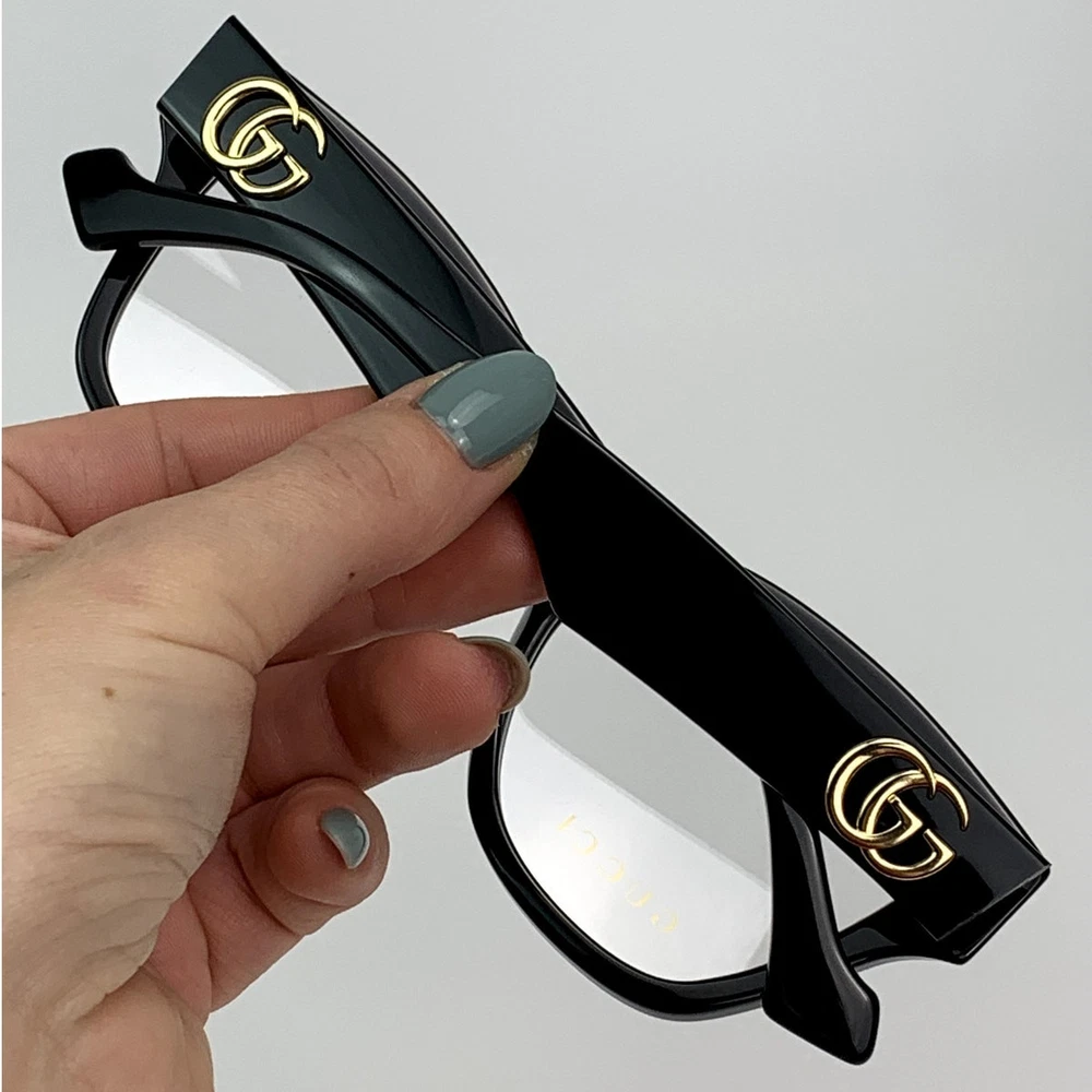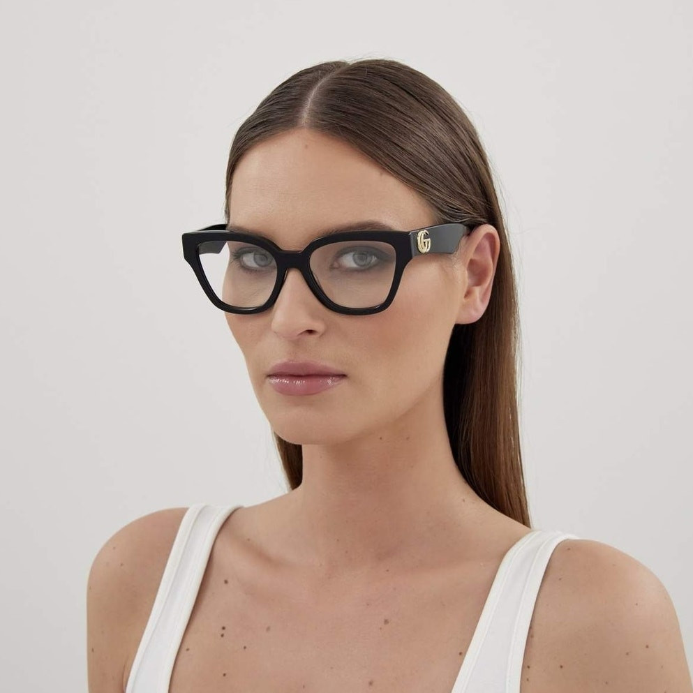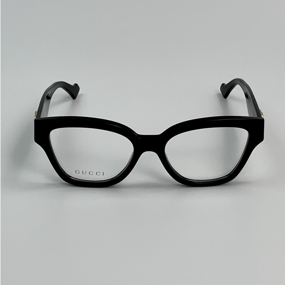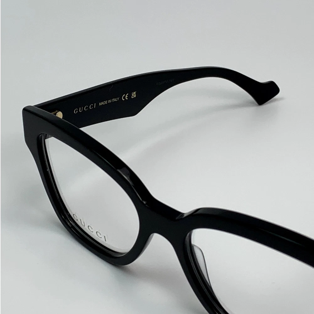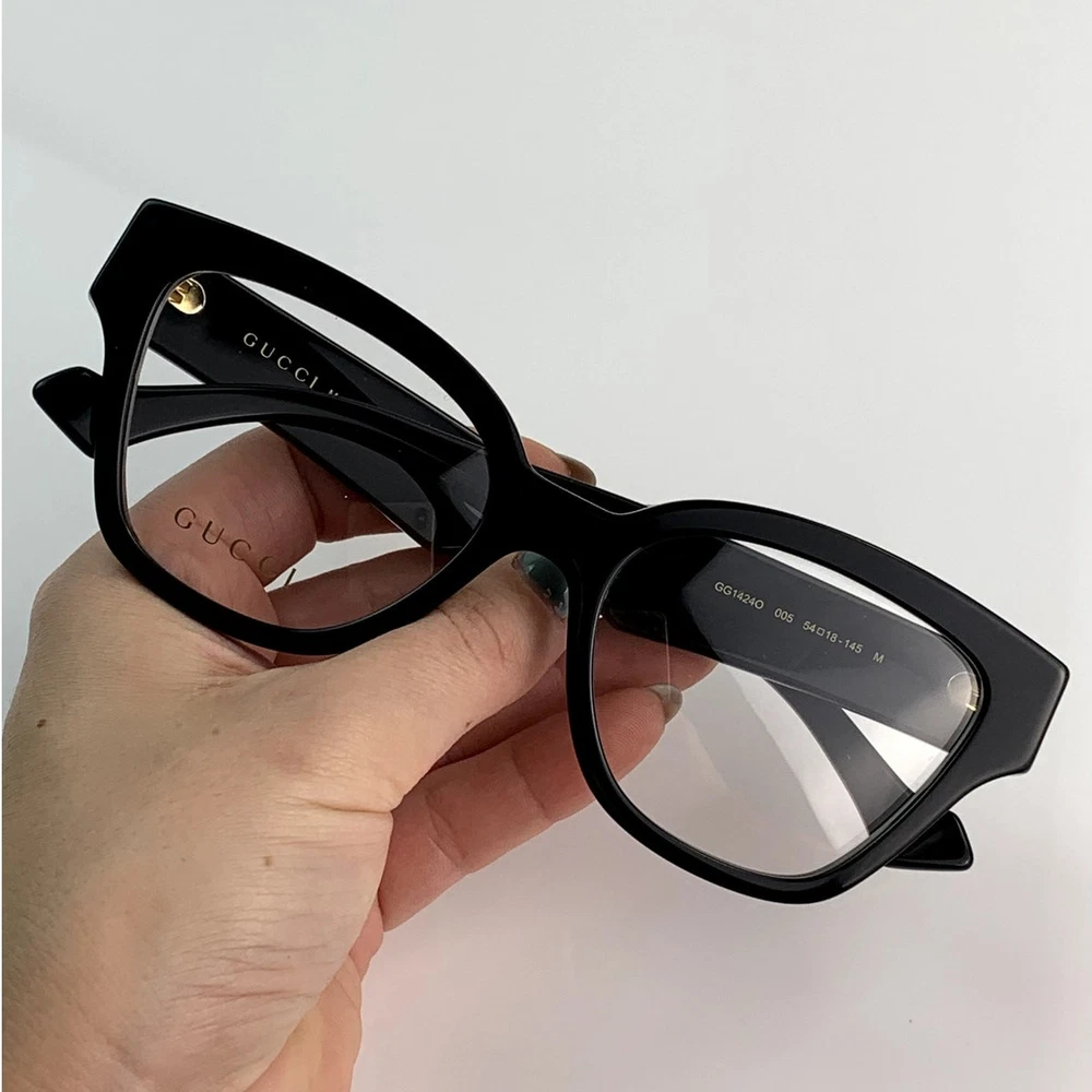 Brand: Gucci Model: GG1424O Color Code: 005 Frame Material: Acetate, ensuring durability and a premium feel. Frame Shape: Geometric Cat-Eye, offering a feminine and elegant style. Frame Color: Black (Shiny Solid Black) Temple Design: Features the iconic Gucci lettering logo on the temples, adding a touch of luxury. Lens Width: 54 mm Bridge Width: 18 mm Temple Length: 145 mm Lens Height: 41 mm Total Frame Width: 133 mm Gender: Designed for women. Style: Classic cat-eye shape, suitable for various occasions. Fit: Medium fit, ideal for individuals seeking a comfortable yet stylish accessory. Includes: Gucci-branded protective case and a microfiber cleaning cloth. Made in Italy