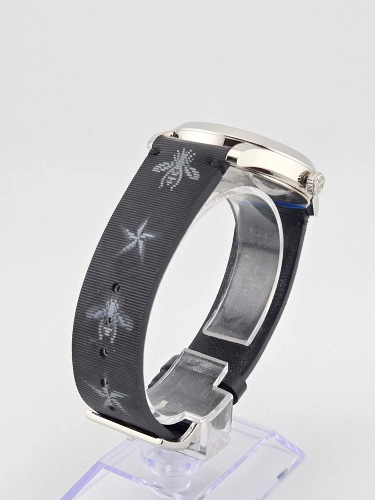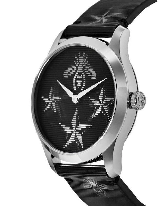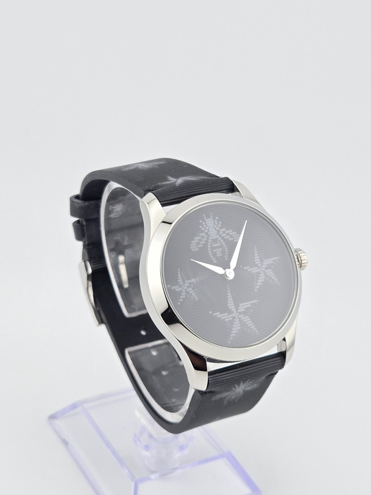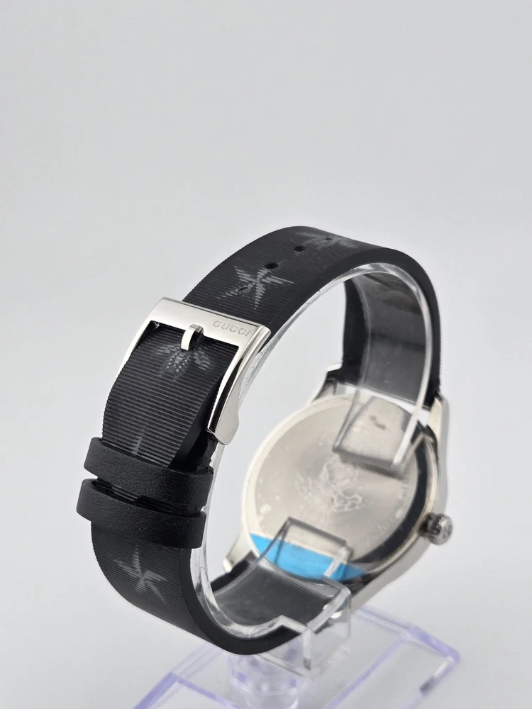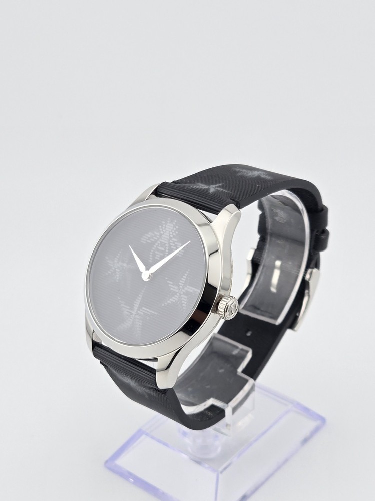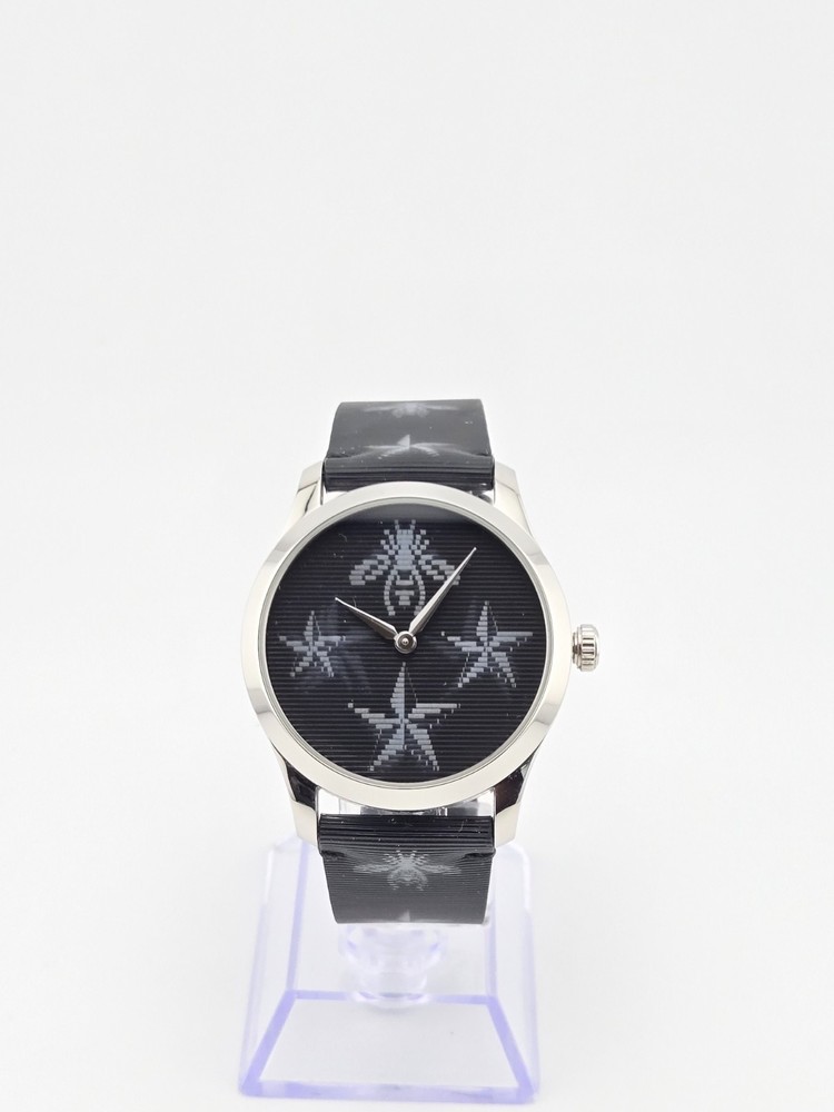 Gucci Women’s G-Timeless Black Dial Bee and Star Watch - YA1264105 ($920 MSRP) With Original Box! This watch is a Shelf Pull from one of the Major Department Stores. Watch has micro scratches on the watch case/band, visible under direct light. Established in 1921 by Guccio Gucci, the Italian fashion brand Gucci not only offers luxury bags, clothes, footwear, accessories, perfume, and beauty products but also provides some of the world’s finest watches. Offering exquisite Italian craftsmanship fused with Swiss technology — from delicate dress watches for women to robust dive watches for men, Gucci earns the trust not only of fashion aficionados but also serious watch enthusiasts. The Gucci Women’s G-Timeless Black Dial Bee and Star Watch - YA1264105 is a perfect blend of elegance and sophistication. It features a stainless steel case paired with a unique black leather strap adorned with bee and star prints. The fixed stainless steel bezel frames a black dial with silver-tone alpha-style hands and no markers, save for the iconic Gucci bee logo at the 12 o'clock position. This analog watch is powered by a precise quartz movement and is protected by a scratch-resistant sapphire crystal. Designed for both durability and style, the watch boasts a pull/push crown, a solid case back, and a round case shape with a diameter of 38 mm and a thickness of 8 mm. The band, which has a width of 20 mm, is secured with a tang clasp. Water-resistant up to 50 meters (165 feet), this dress watch is suitable for everyday wear. The Gucci Women’s G-Timeless Watch is a testament to the brand’s commitment to creating timeless, high-quality timepieces that seamlessly combine fashion and functionality. Features Stainless steel case with a black (bee and star print) leather strap. Fixed stainless steel bezel. Black (star print) dial with silver-tone alpha-style hands. No markers. The Gucci bee logo appears at 12 o'clock position. Dial Type: Analog. Quartz movement. Scratch resistant sapphire crystal. Pull / push crown. Solid case back. Round case shape. Case size: 38 mm. Case thickness: 8 mm. Band width: 20 mm. Tang clasp. Water resistant at 50 meters / 165 feet. Functions: hour, minute. Fast and Free Shipping You're already purchasing the item. Why pay additional for shipping, especially slow shipping? We get your order shipped out within 1-business day and delivered to your doorstep as quickly as possible. Competitive Pricing With our dynamic pricing model, our prices are always competitive. Our prices are some of the lowest that you will find on the internet. Rest assured that you're getting a good deal when purchasing with us. 30-day Money Back Guarantee We are committed to making sure that you leave this transaction satisfied. If you're unhappy with the product for any reason, you may return it back for your money-back or a replacement within 30 days. No questions asked!