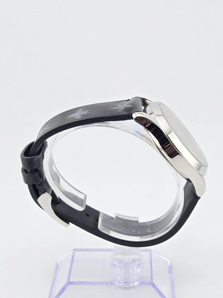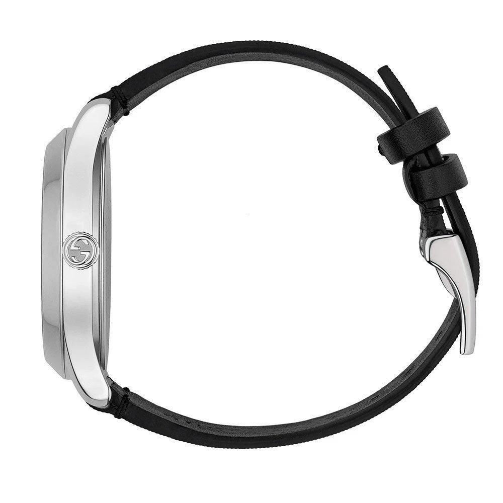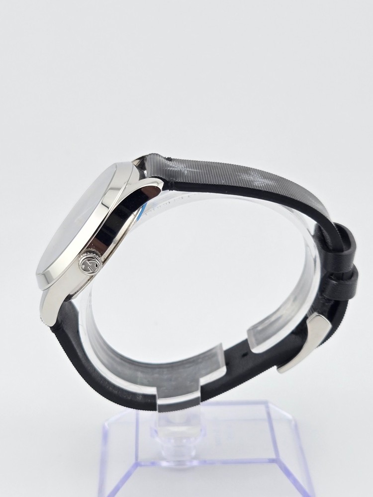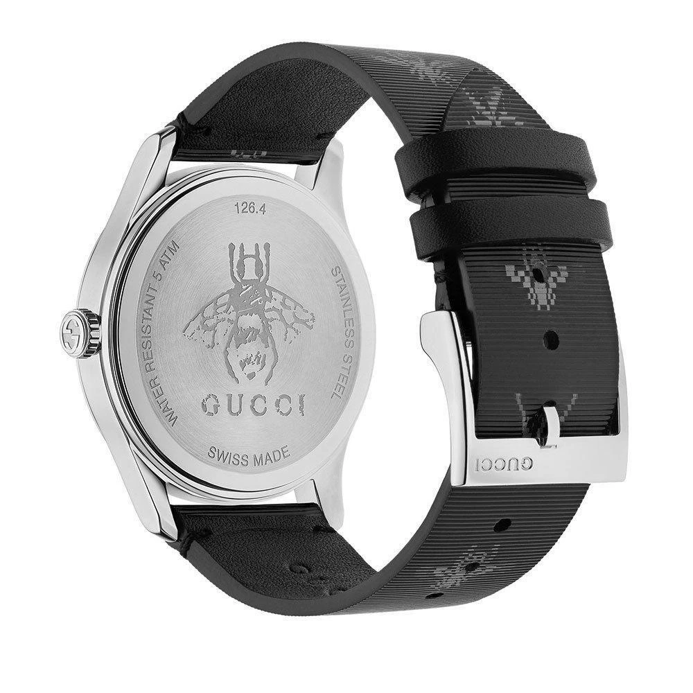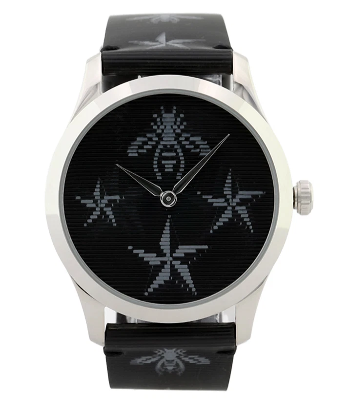 Gucci Women’s G-Timeless Black Dial Bee and Star Watch - YA1264105 ($920 MSRP) With Original Box! This watch is a Shelf Pull from one of the Major Department Stores. Watch has micro scratches on the watch case/band, visible under direct light. Established in 1921 by Guccio Gucci, the Italian fashion brand Gucci not only offers luxury bags, clothes, footwear, accessories, perfume, and beauty products but also provides some of the world’s finest watches. Offering exquisite Italian craftsmanship fused with Swiss technology — from delicate dress watches for women to robust dive watches for men, Gucci earns the trust not only of fashion aficionados but also serious watch enthusiasts. The Gucci Women’s G-Timeless Black Dial Bee and Star Watch - YA1264105 is a perfect blend of elegance and sophistication. It features a stainless steel case paired with a unique black leather strap adorned with bee and star prints. The fixed stainless steel bezel frames a black dial with silver-tone alpha-style hands and no markers, save for the iconic Gucci bee logo at the 12 o'clock position. This analog watch is powered by a precise quartz movement and is protected by a scratch-resistant sapphire crystal. Designed for both durability and style, the watch boasts a pull/push crown, a solid case back, and a round case shape with a diameter of 38 mm and a thickness of 8 mm. The band, which has a width of 20 mm, is secured with a tang clasp. Water-resistant up to 50 meters (165 feet), this dress watch is suitable for everyday wear. The Gucci Women’s G-Timeless Watch is a testament to the brand’s commitment to creating timeless, high-quality timepieces that seamlessly combine fashion and functionality. Features Stainless steel case with a black (bee and star print) leather strap. Fixed stainless steel bezel. Black (star print) dial with silver-tone alpha-style hands. No markers. The Gucci bee logo appears at 12 o'clock position. Dial Type: Analog. Quartz movement. Scratch resistant sapphire crystal. Pull / push crown. Solid case back. Round case shape. Case size: 38 mm. Case thickness: 8 mm. Band width: 20 mm. Tang clasp. Water resistant at 50 meters / 165 feet. Functions: hour, minute. Fast and Free Shipping You're already purchasing the item. Why pay additional for shipping, especially slow shipping? We get your order shipped out within 1-business day and delivered to your doorstep as quickly as possible. Competitive Pricing With our dynamic pricing model, our prices are always competitive. Our prices are some of the lowest that you will find on the internet. Rest assured that you're getting a good deal when purchasing with us. 30-day Money Back Guarantee We are committed to making sure that you leave this transaction satisfied. If you're unhappy with the product for any reason, you may return it back for your money-back or a replacement within 30 days. No questions asked!
