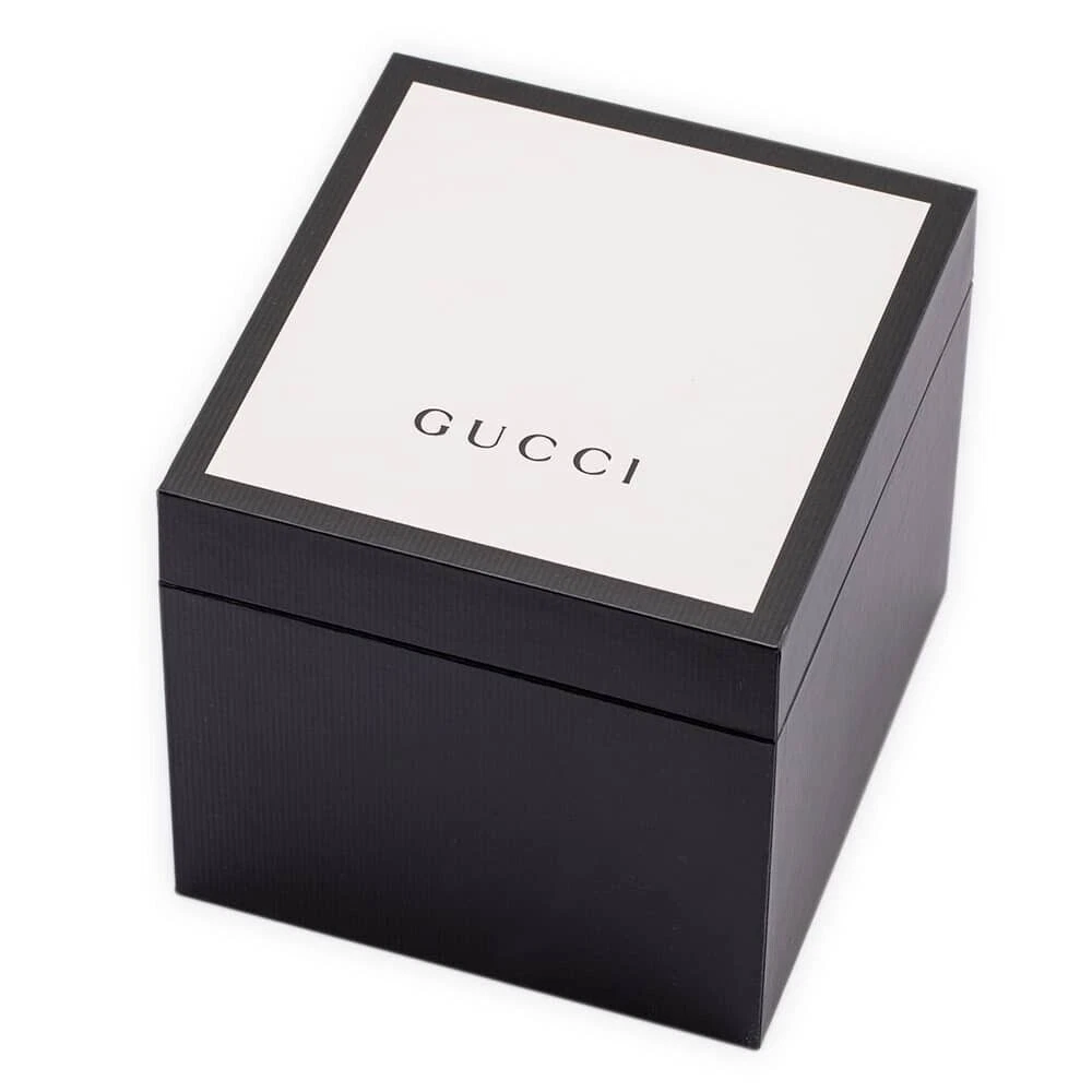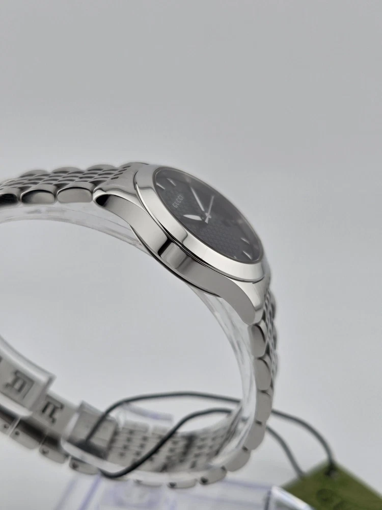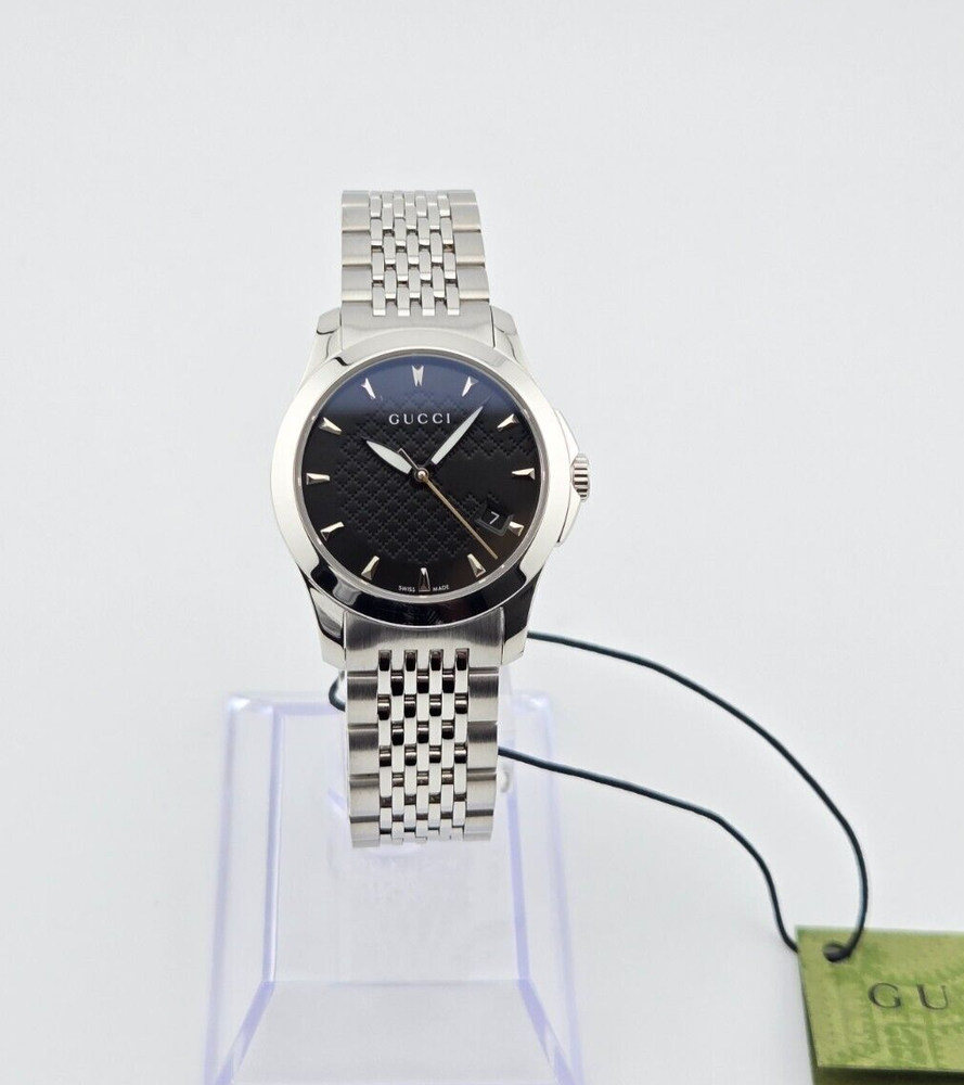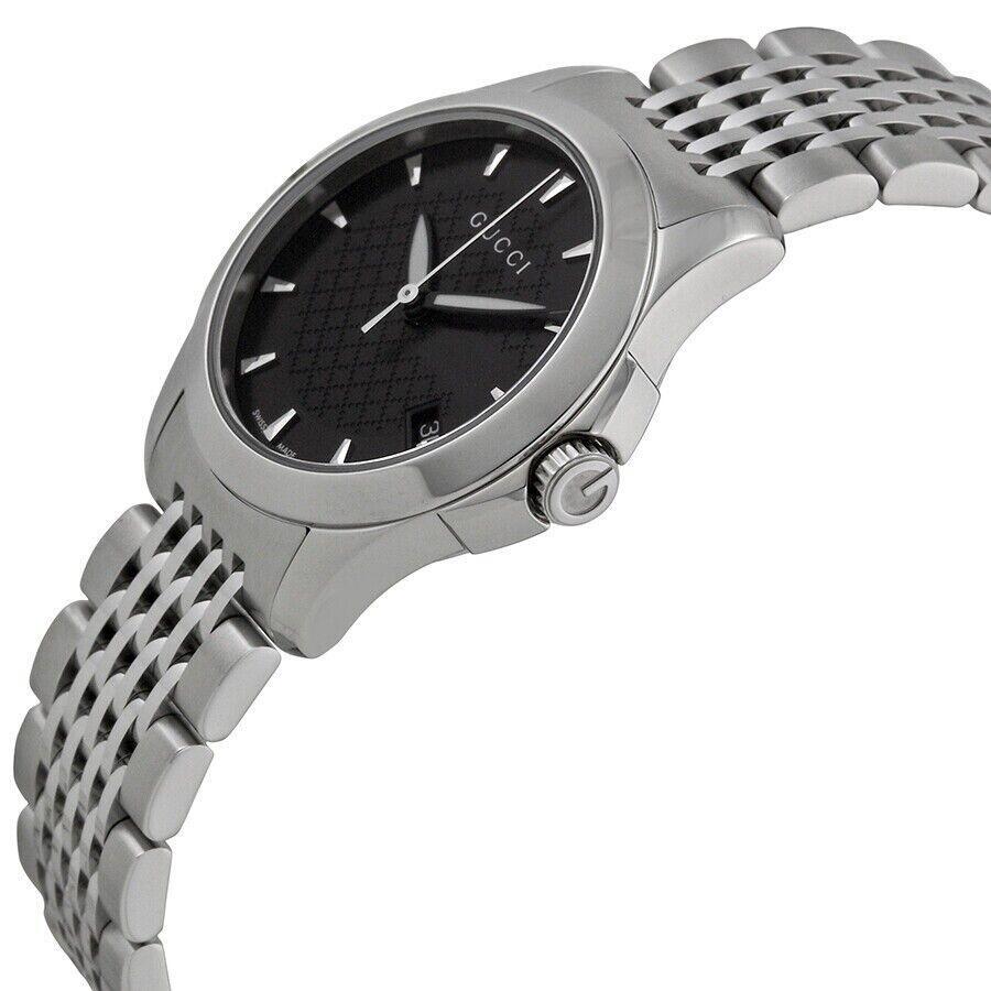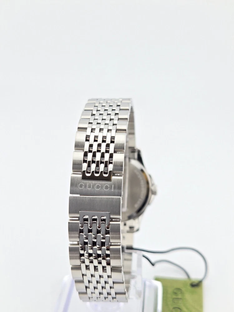 Gucci Women’s G-Timeless Stainless Steel Black Dial Watch – YA126502 ($790 MSRP) With Original Box and Tags! This watch is a Shelf Pull from one of the Major Department Stores. Watch has micro scratches on the watch case/band, visible under direct light. The Gucci Women’s G-Timeless Stainless Steel Black Dial Watch – YA126502 embodies the essence of luxury and sophistication. It features a sleek stainless steel case complemented by a matching stainless steel link bracelet, offering both durability and elegance. The fixed stainless steel bezel frames a distinctive black diamond-pattern dial with the iconic Gucci 'G', adorned with luminous silver-tone hands and index hour markers, ensuring both style and readability. Minute markers around the outer rim add to the precise timekeeping of this exquisite timepiece. This analog watch is powered by a reliable quartz movement, providing accurate timekeeping. A scratch-resistant sapphire crystal protects the dial, maintaining its pristine appearance over time. The date display is discreetly positioned at the 4 o'clock mark, adding a practical function without compromising the watch's aesthetic. The textured steel crown and stainless steel case back complete the sophisticated design. With a case diameter of 27 mm and a case thickness of 7 mm, it is a perfect size for a woman's wrist, offering a refined yet substantial presence. Designed for both style and functionality, the watch features a hidden deployment clasp that ensures a secure and comfortable fit. Water-resistant up to 30 meters (100 feet), this timepiece can withstand everyday splashes and brief immersion in water. The Gucci Women’s G-Timeless Stainless Steel Black Dial Watch is a luxury dress watch that seamlessly combines timeless elegance with modern design elements, making it a perfect accessory for any occasion. Features Stainless steel case with a stainless steel link bracelet. Fixed stainless steel bezel. Black diamond-pattern with black Gucci 'G' dial with luminous silver-tone hands and index hour markers. Minute markers around the outer rim. Dial Type: analog. Date display at the 4 o'clock position. Quartz movement. Scratch resistant sapphire crystal. Textured steel crown. S tainless steel case back. Case diameter: 27 mm. Case thickness: 7 mm. Band width: 14 mm. Hidden deployment clasp. Water resistant at 30 meters / 100 feet. Functions: hours, minutes, seconds, date. Fast and Free Shipping You're already purchasing the item. Why pay additional for shipping, especially slow shipping? We get your order shipped out within 1-business day and delivered to your doorstep as quickly as possible. Competitive Pricing With our dynamic pricing model, our prices are always competitive. Our prices are some of the lowest that you will find on the internet. Rest assured that you're getting a good deal when purchasing with us. 30-day Money Back Guarantee We are committed to making sure that you leave this transaction satisfied. If you're unhappy with the product for any reason, you may return it back for your money-back or a replacement within 30 days. No questions asked!