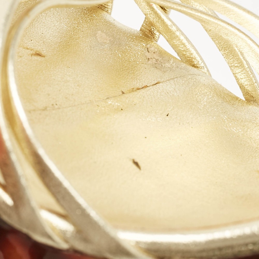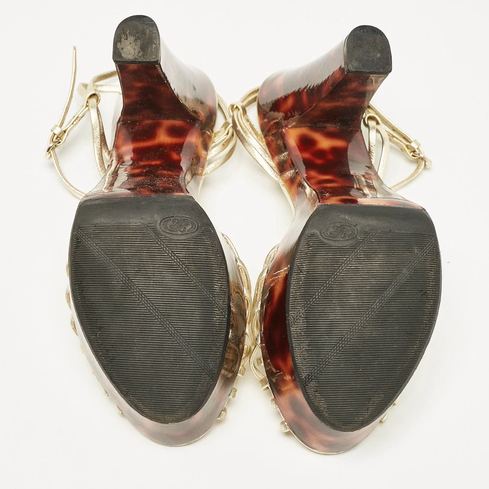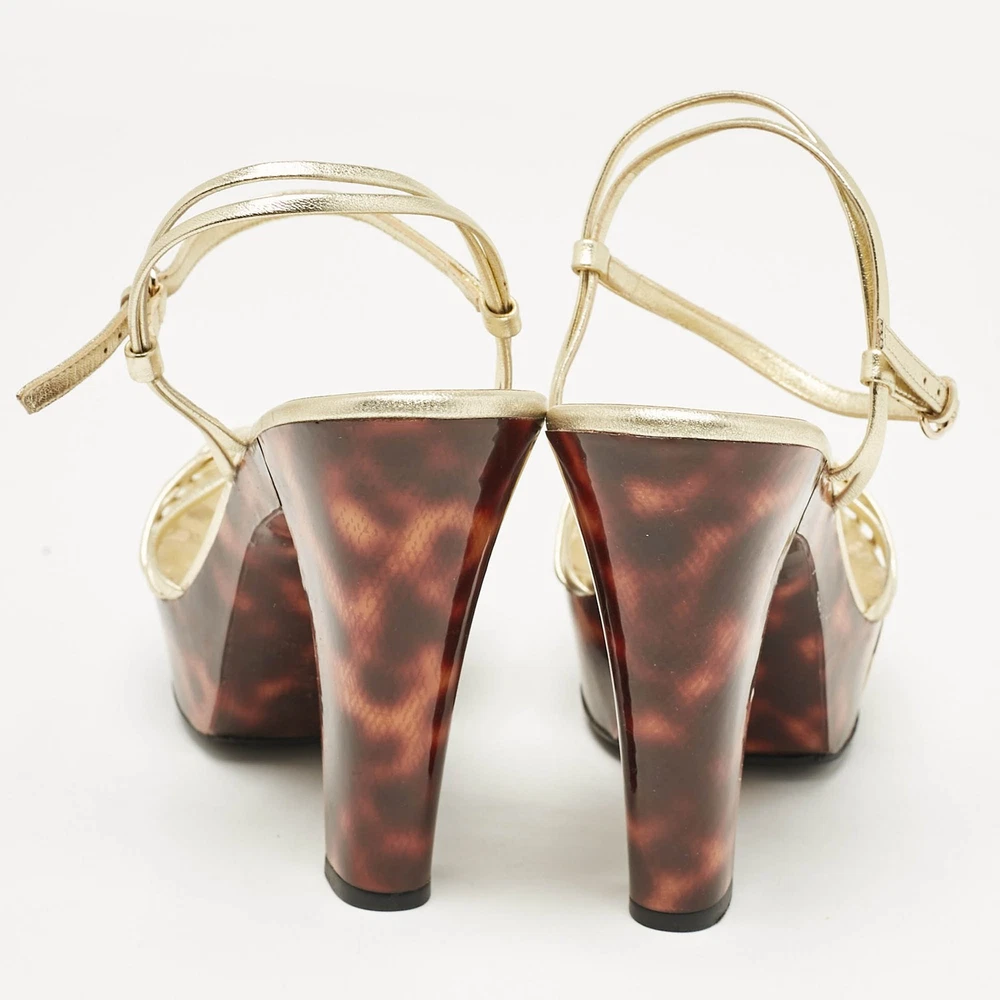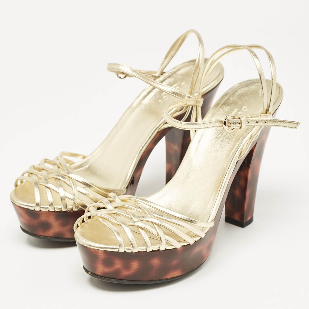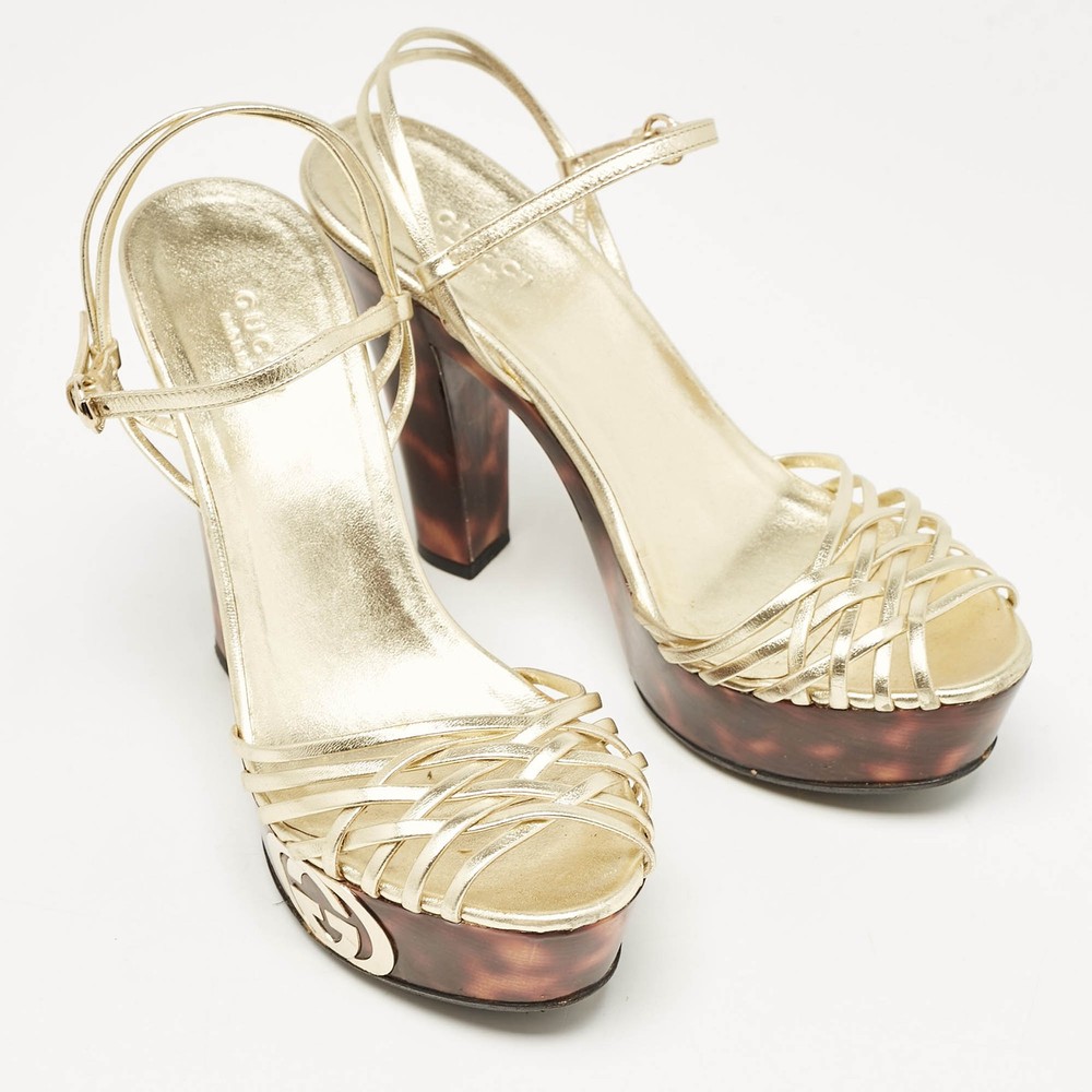 Straps in gold leather have been used to form this gorgeous pair by Gucci. The twist design, open toes, and buckled ankle straps are added to frame your feet in an alluring way.Certified by The Luxury Closet - This item has gone through a detailed authentication process overseen by our experts. We offer a lifetime guarantee of authenticity on all our items. Import duties, taxes and charges are not included in the item price. These charges are the buyers responsibility. Please check with your country’s customs office to determine what these additional cost will be prior to buying. Our eBay Store About Us Contact Us Add to Favorite Sellers Gucci Gold Leather Platform Ankle Strap Sandals Size 38 $137.5 Straps in gold leather have been used to form this gorgeous pair by Gucci. The twist design, open toes, and buckled ankle straps are added to frame your feet in an alluring way. Product Details Brand Color Gold Dimensions Material Leather Size 38 Outsole Width 7 cm Outsole Length 21 cm Heel Height 15 cm Includes Original Dustbag Certified by The Luxury Closet This item has gone through a detailed authentication process overseen by our experts. We offer a lifetime guarantee of authenticity on all our items. How We Check The in-house team of experts at The Luxury Closet is highly trained to verify the authenticity and the condition of the luxury products. They ensure that only 100% authentic items are put on sale.The evaluation process is unique with its own mix of assessment criteria and differs according to the category. Each item is evaluated based on the following combination of hallmarks, hardware, stitching, symmetry, material, craftsmanship, stamping, codes, hologram stickers, and packaging. Our authenticators also check if the items have been modified or amended (e.g., aftermarket diamonds, replaced batteries, repaired bags, etc.) International Buyers Import duties, taxes and charges are not included in the item price. These charges are the buyers responsibility. Please check with your country’s customs office to determine what these additional cost will be prior to buying.