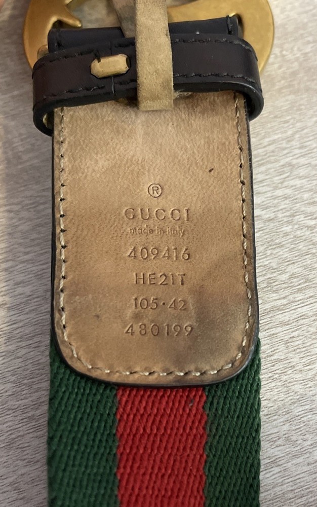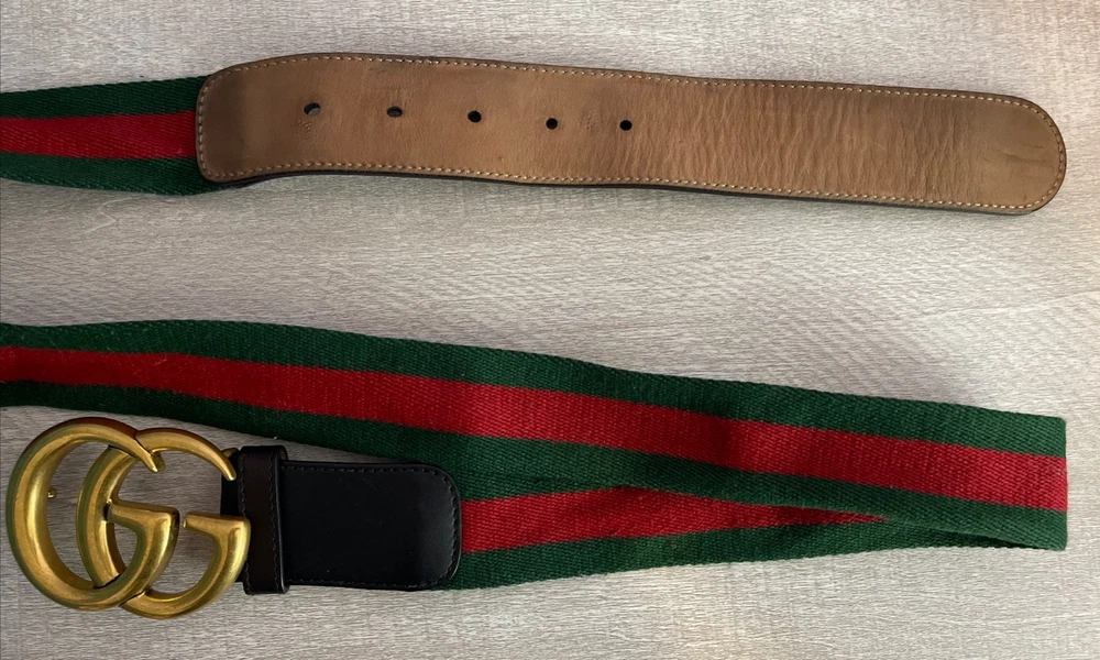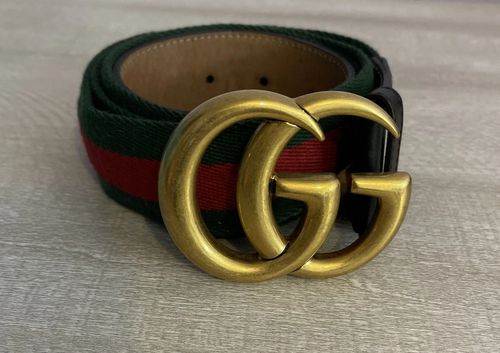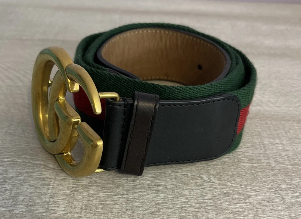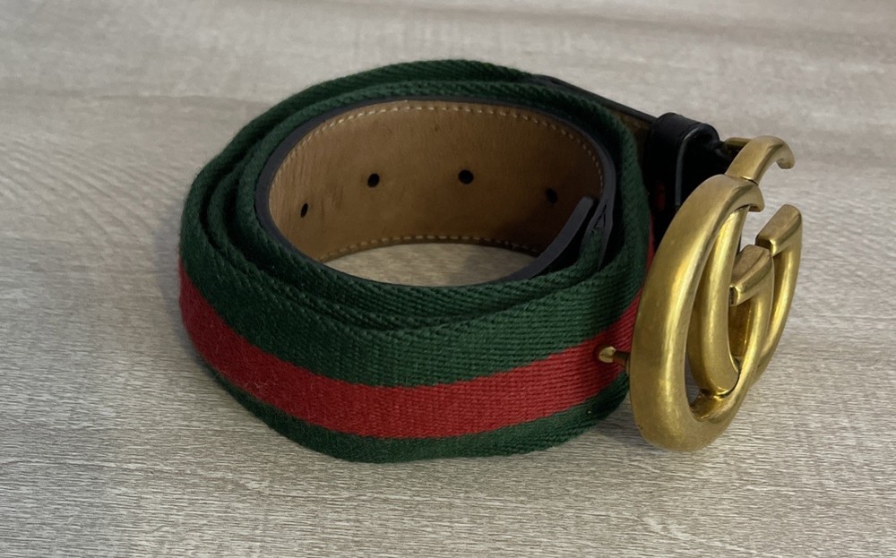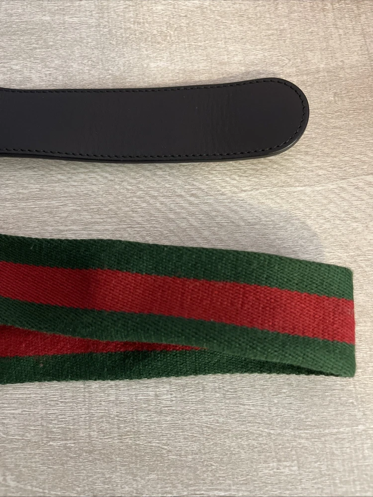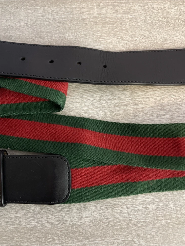 This Gucci Green & Red Striped Double G Web Belt is a stylish accessory designed for unisex adults. Featuring a classic striped pattern in green and red, this belt is made of leather, brass, and cotton canvas materials, with adjustable sizing for a comfortable fit. The belt comes with a buckle and logo accents, adding a touch of designer flair to any outfit. Perfect for adding a pop of color and sophistication to your wardrobe, this Gucci belt is a versatile addition to your collection. No bag or dust cover available.