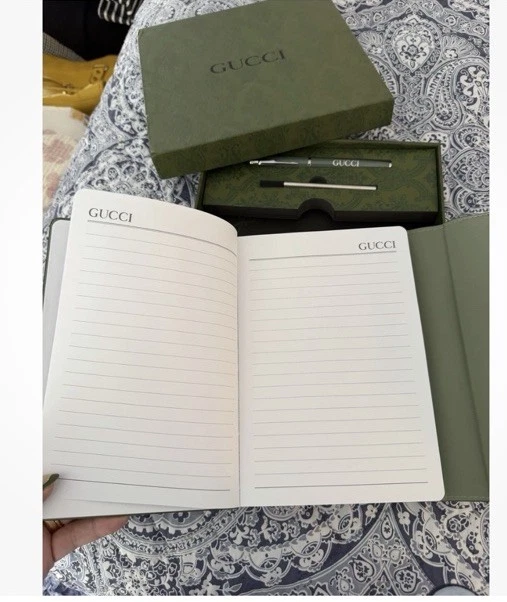 Includes: Notebook Ballpoint Pen Pen Refill The Gucci NIB Writing Set is a luxurious stationery item that includes high-quality paper notebook and writing instruments. This collectible set is perfect for those who appreciate fine craftsmanship and elegant design. With the iconic Gucci brand, this writing set is sure to impress with its refined aesthetic and attention to detail. Ideal for both personal use and as a stylish gift for someone special. This