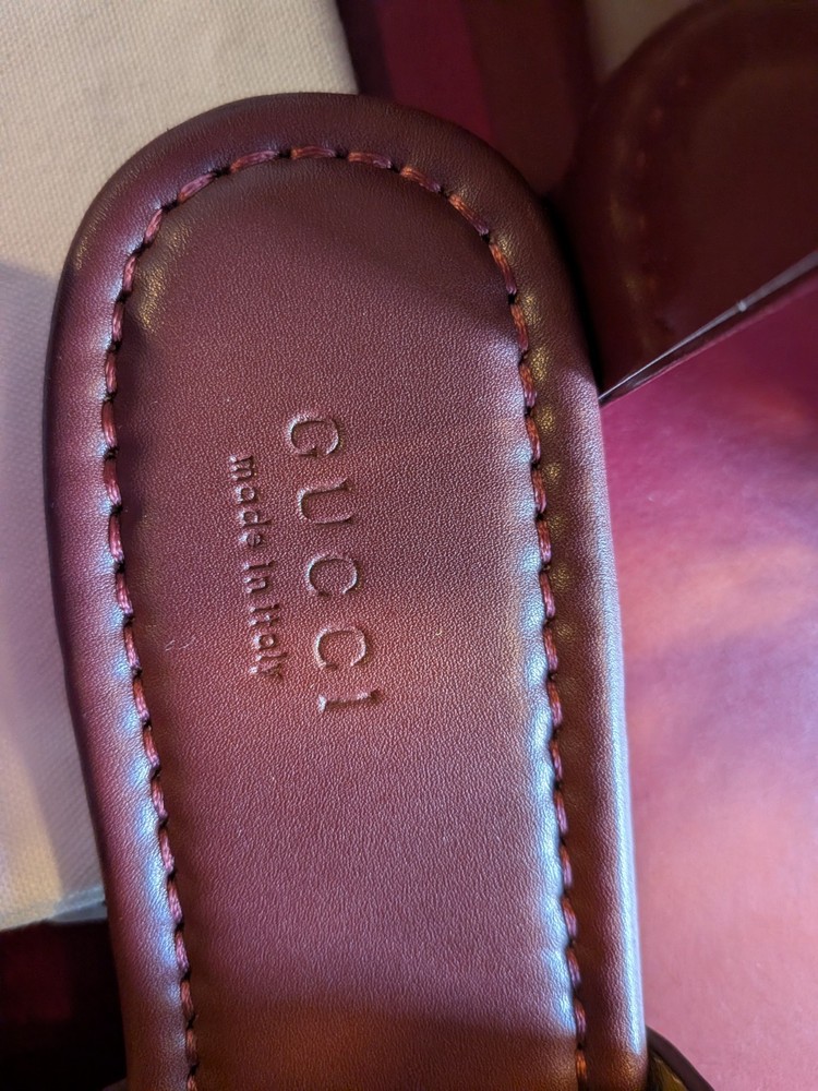 Stile: Ciabatta Modello: sandalo slide Gucci con Morsetto (o Gucci Horsebit slide sandal) Tipo: Sandalo Numero di scarpa EU: 38 Materiale tomaia: Pelle Marca: Gucci Reparto: Donna Colore: Rosso Paese di origine: Italia