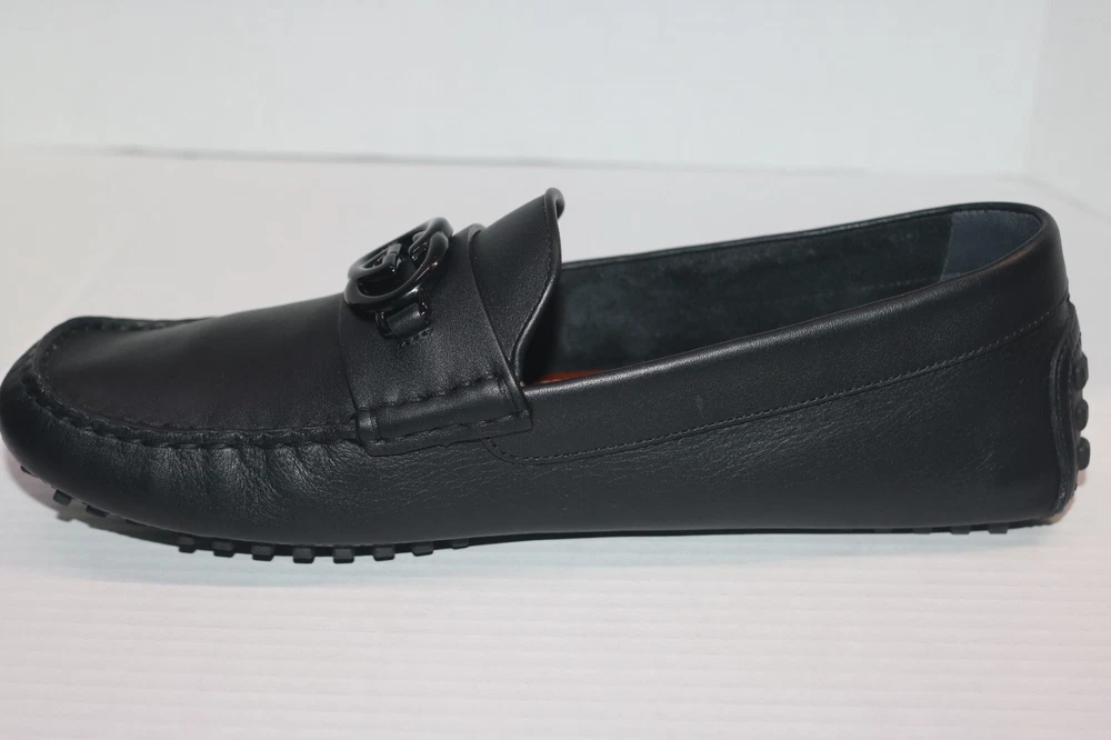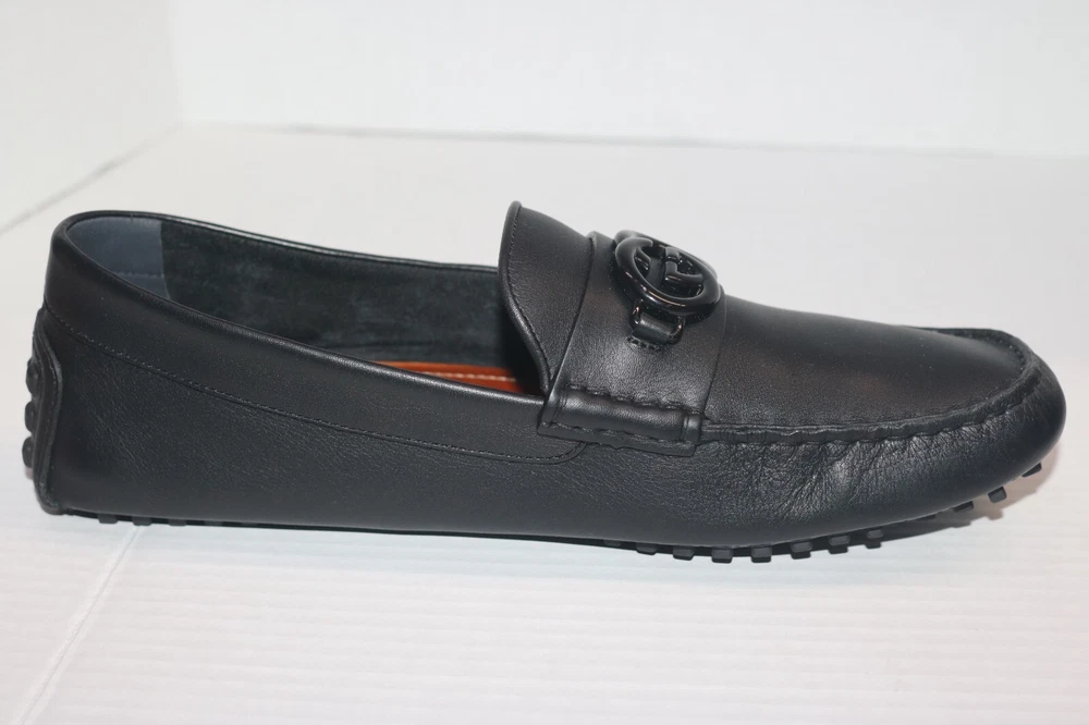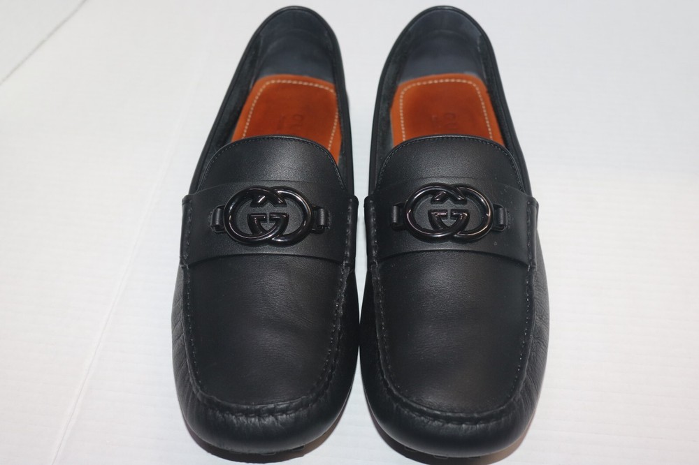 Gucci 692379 Interlocking G Driver Loafers Black Size 11.5 Black calfskin leather Interlocking G Buckle Rubber driver soles Tan leather insole Made in Italy Size 11.5 = 12 US MENS