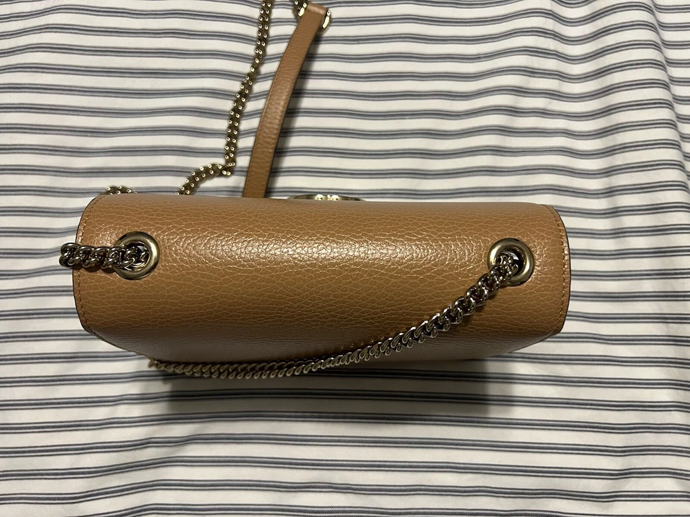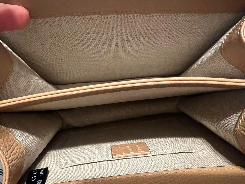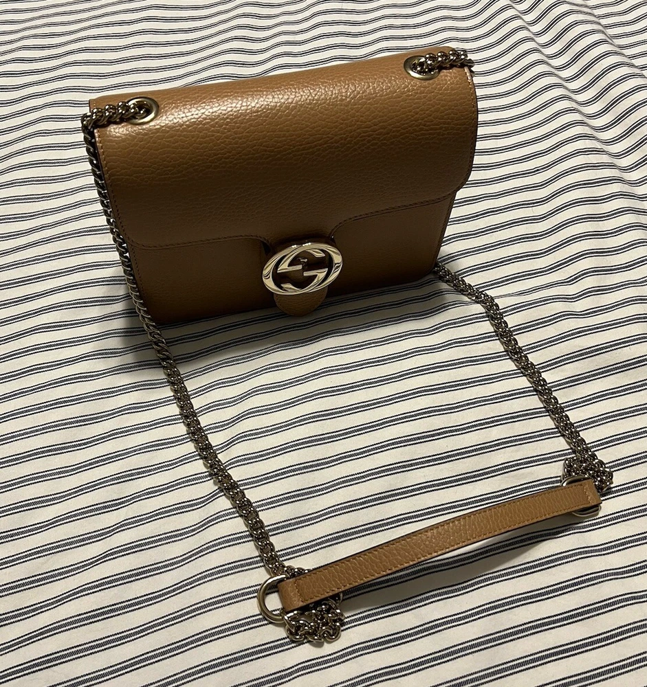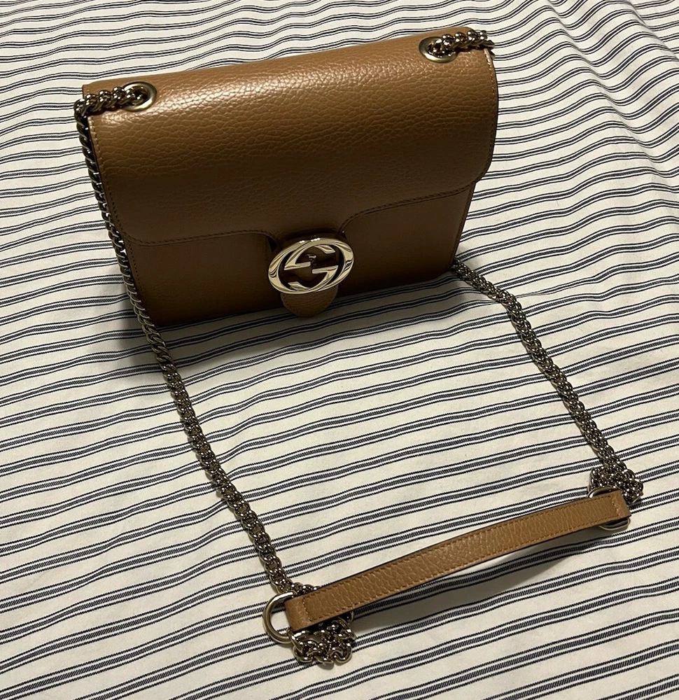 Elevate your style with this Gucci Interlocking G crossbody mini bag. The bag features a unique combination of beige canvas and leather in a rectangular shape with a zip closure. The bag width is 8.9 inches, bag height is 5.5 inches, and bag depth is 2.8 inches, making it a perfect fit for your essentials. The bag comes with a brown canvas handle/strap and gold hardware, adding a touch of luxury to the design. The interior is lined with beige microfiber and features a variety of compartments to keep your belongings organized. This Gucci crossbody mini bag is a must-have for any fashion-forward woman looking to add a touch of elegance to her everyday style.