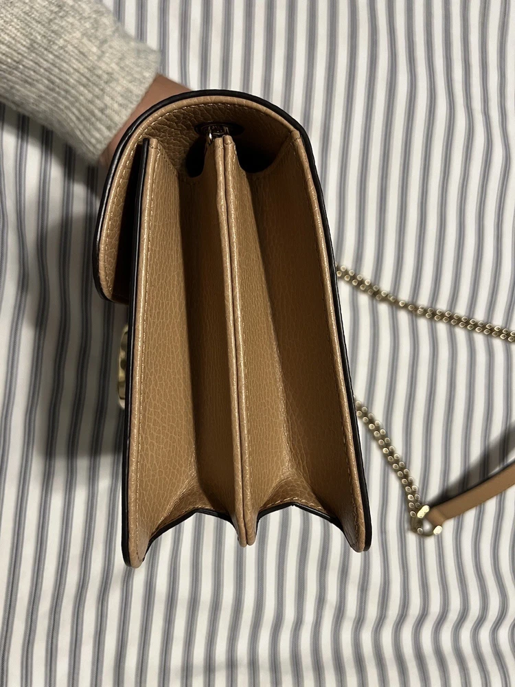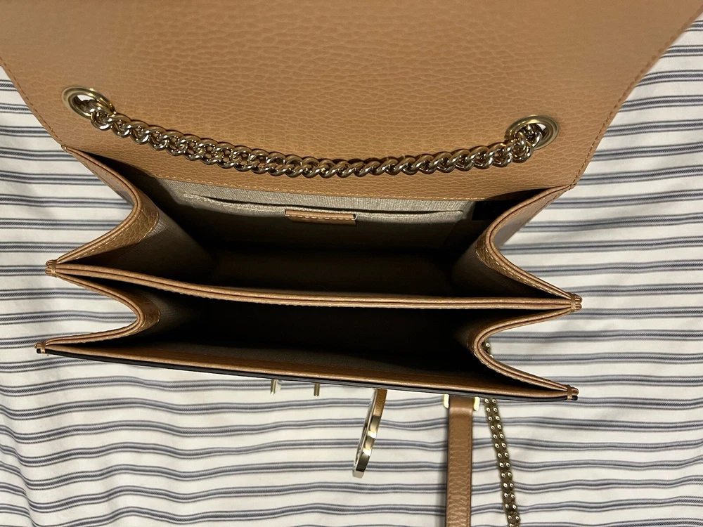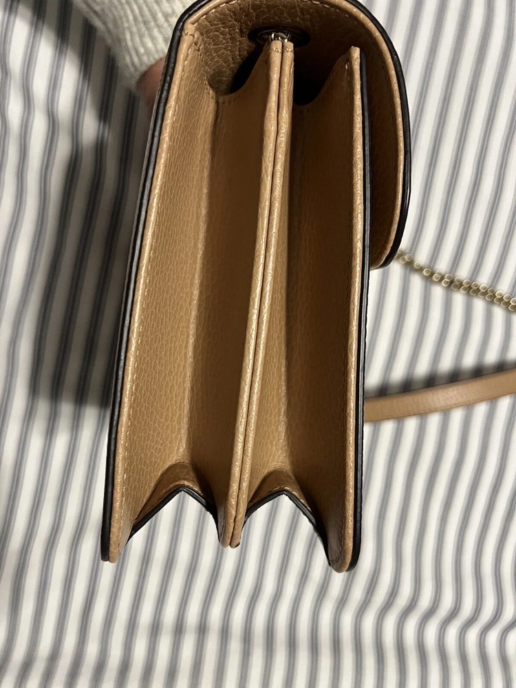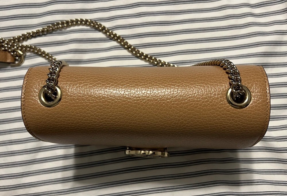 Elevate your style with this Gucci Interlocking G crossbody mini bag. The bag features a unique combination of beige canvas and leather in a rectangular shape with a zip closure. The bag width is 8.9 inches, bag height is 5.5 inches, and bag depth is 2.8 inches, making it a perfect fit for your essentials. The bag comes with a brown canvas handle/strap and gold hardware, adding a touch of luxury to the design. The interior is lined with beige microfiber and features a variety of compartments to keep your belongings organized. This Gucci crossbody mini bag is a must-have for any fashion-forward woman looking to add a touch of elegance to her everyday style.