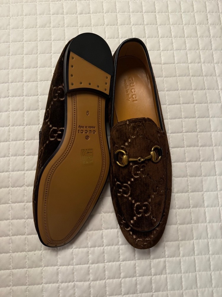 The Gucci Jordaan GG Loafers are classical dress shoes designed for men. Featuring a slip-on closure and brown velvet upper material with the iconic Pattern GG, these loafers exude luxury and sophistication. Made in Italy, the leather lining and insole provide added comfort and quality. With the Gucci logo accents, these loafers are a stylish and timeless addition to any man's wardrobe, perfect for fall and spring seasons. Original Price: $730.00