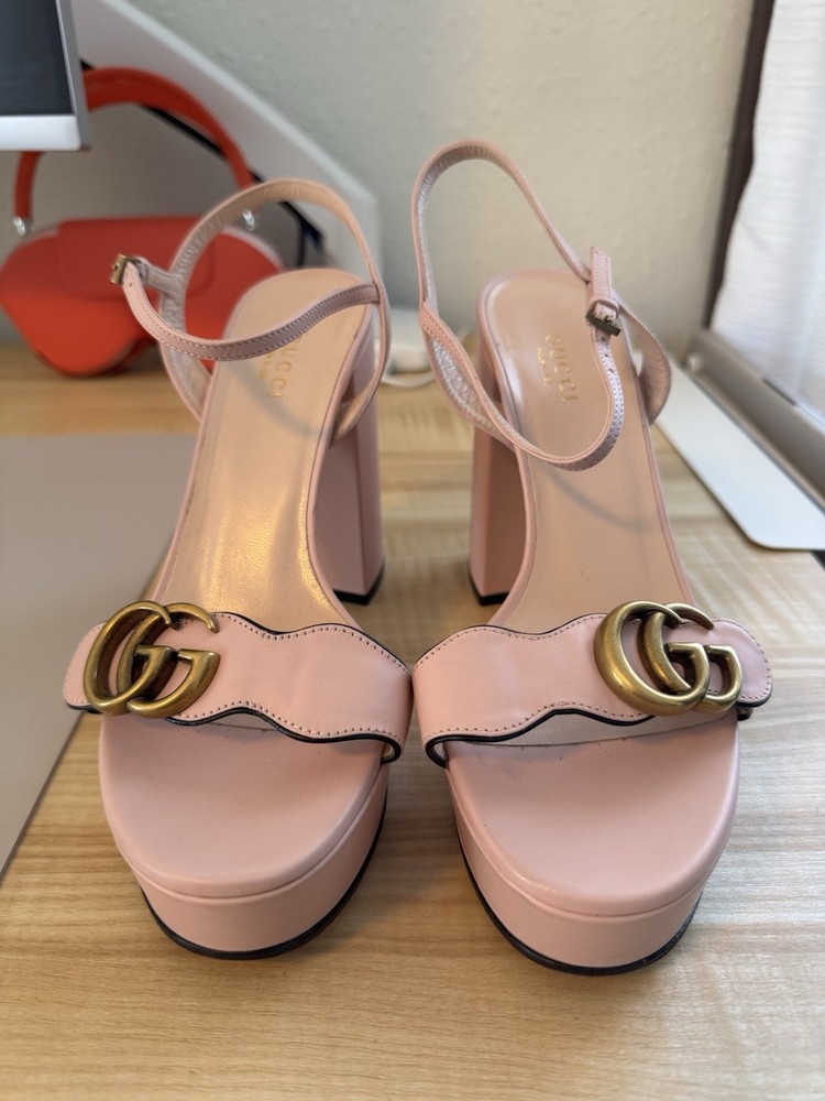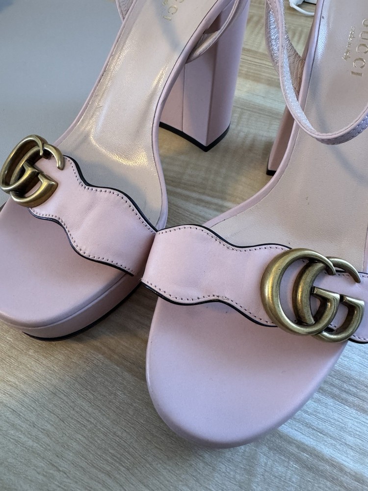 Elevate your fashion game with these stunning Gucci Marmont Platform Heel Sandals. Crafted from high-quality leather and featuring an eye-catching pink color, these sandals are the perfect addition to any stylish woman's shoe collection. The hook and loop closure ensures a comfortable and secure fit, while the wedge heel style provides a comfortable and stylish lift. These sandals are a size 7.5 US and 37.5 EU, making them a great fit for most women. They are part of the popular Gucci Marmont product line and are perfect for any occasion, from a casual day out to a formal event. Add these gorgeous platform heels to your collection today and step out in style. In like-new condition. Does not come with box.