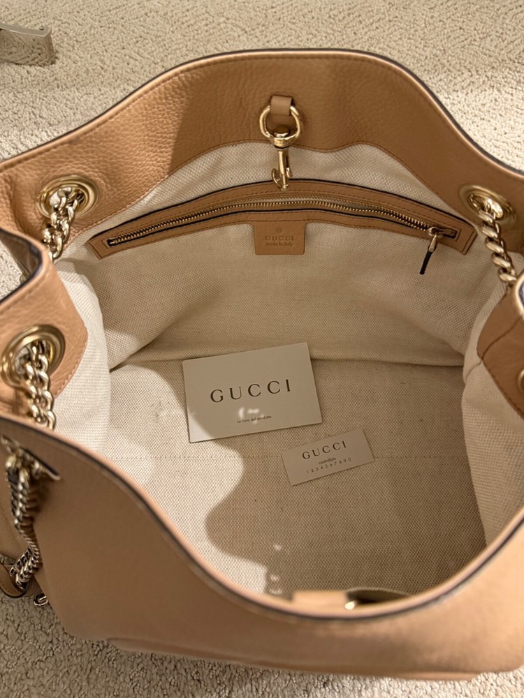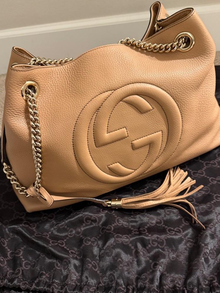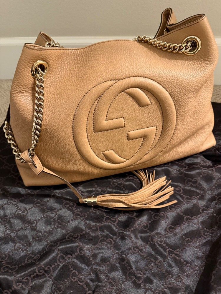 Crafted with impeccable attention to detail, the Gucci Medium Soho Chain Tote Bag is a harmonious blend of style and functionality. The exterior is fashioned from luxurious nude leather with a classic Gucci GG pattern, complemented by a trapezoid shape that adds a modern touch. Gold-plated hardware provides a subtle contrast, while the chain strap ensures your essentials are secure and stylishly displayed.Inside, the tote is lined with a mix of tweed and cotton, ensuring durability and a soft touch. The interior pockets offer organization for your daily essentials, and the tassel accents add a playful twist. Whether you're heading to the office, running errands, or traveling, this shoulder bag is versatile for any occasion, maintaining its elegance and poise throughout the day.