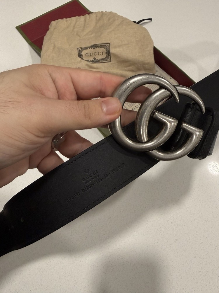 This Gucci Men's Authentic Belt is a stylish and luxurious addition to any man's wardrobe. Made from high-quality leather in classic black, this XL-sized belt features a solid pattern and sleek silver hardware accents. The Gucci brand, known for its designer quality, adds a touch of sophistication to this dress belt. Made in Italy, this belt is a versatile accessory that can elevate any outfit with its timeless elegance and attention to detail.